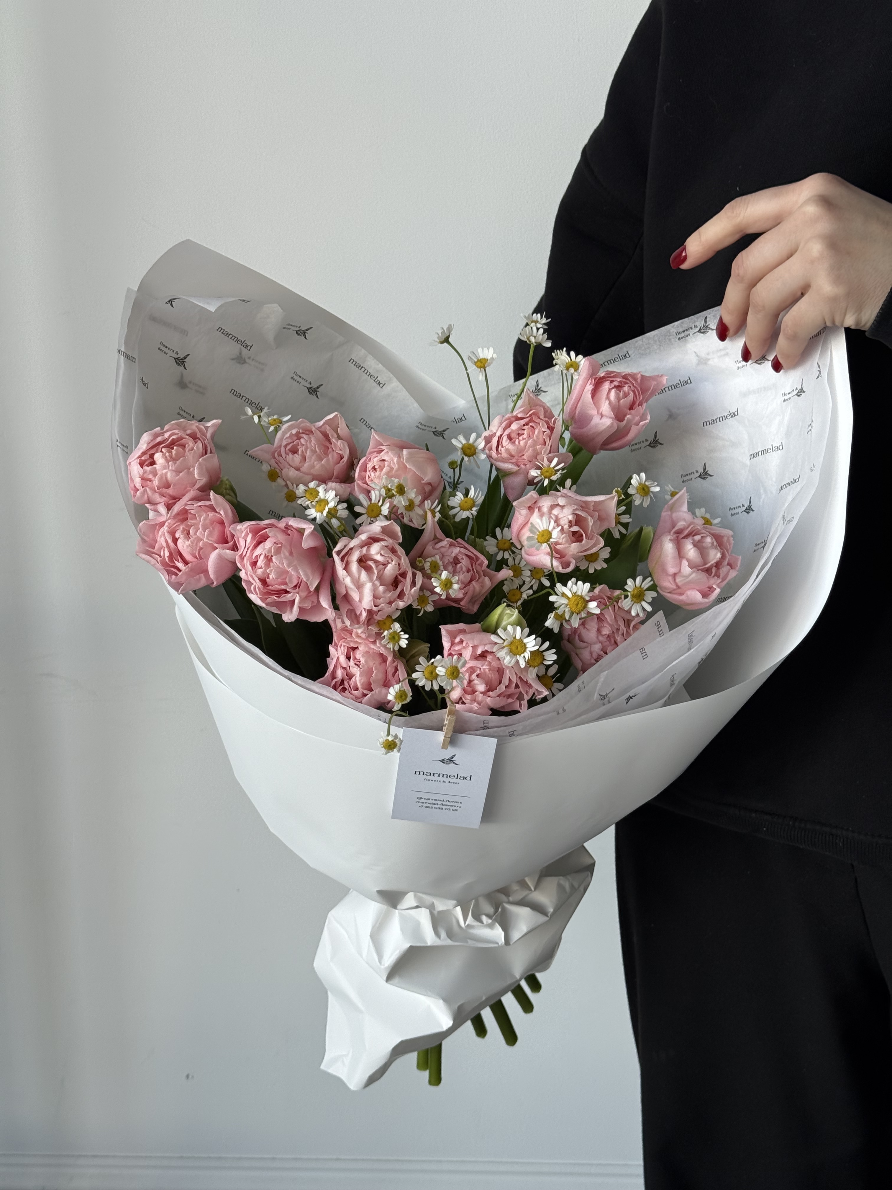Букет из 15 розовых пионовидных тюльпанов и ромашки
