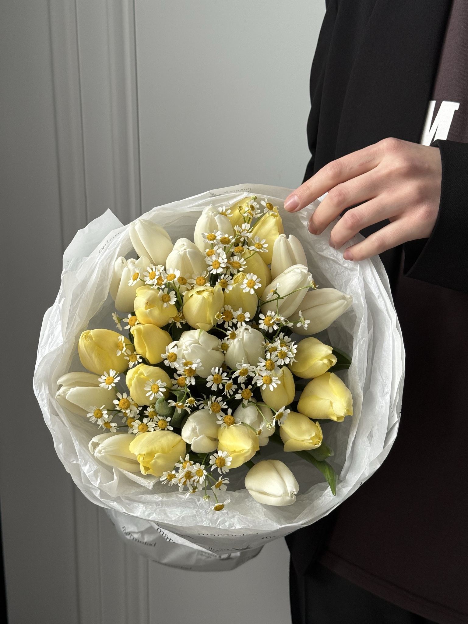 Букет из 29 белых, лимонных тюльпанов и ромашек