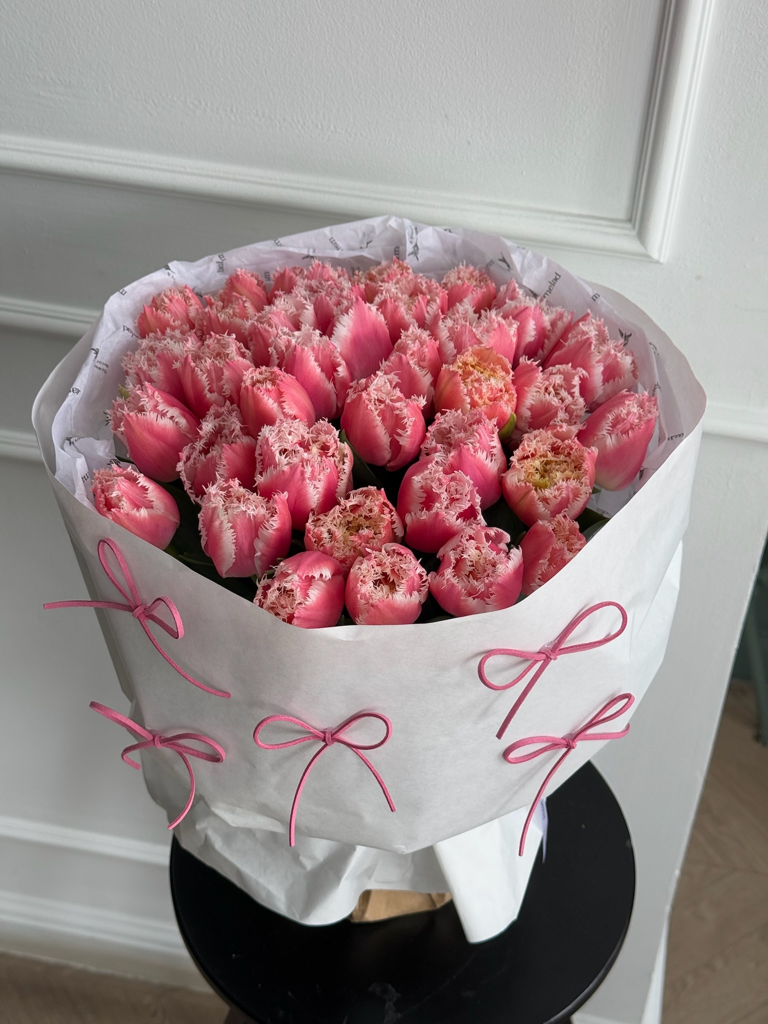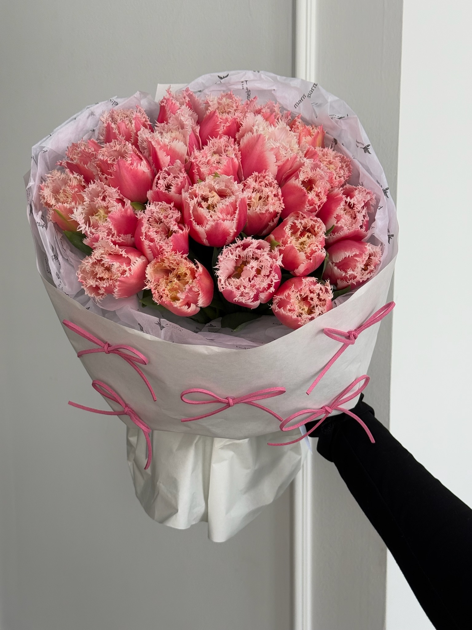 Букет из 25 махровых ярко-розовых с белым тюльпанов