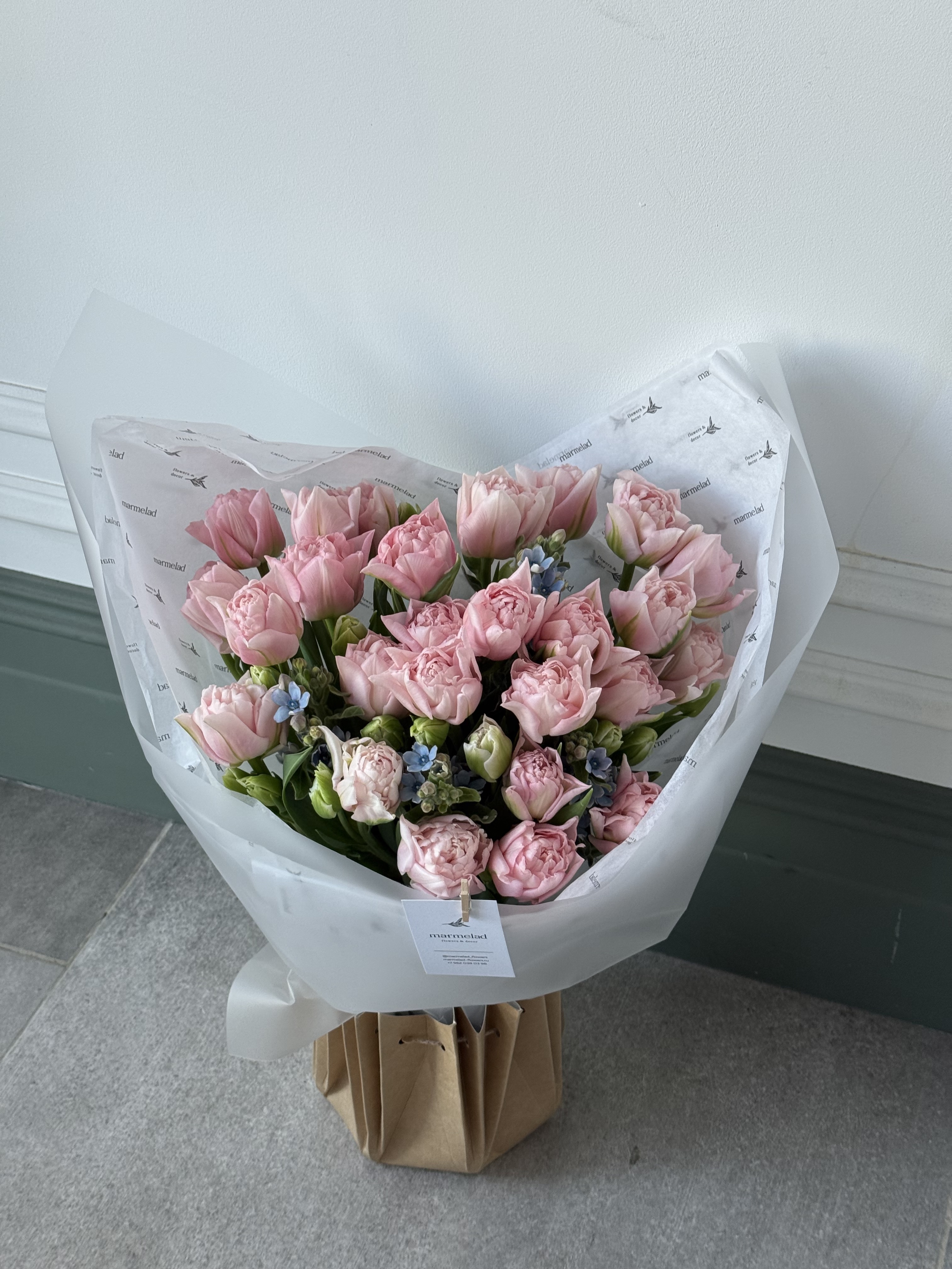 Букет из 27 розовых пионовидных тюльпанов и голубого оксипеталума