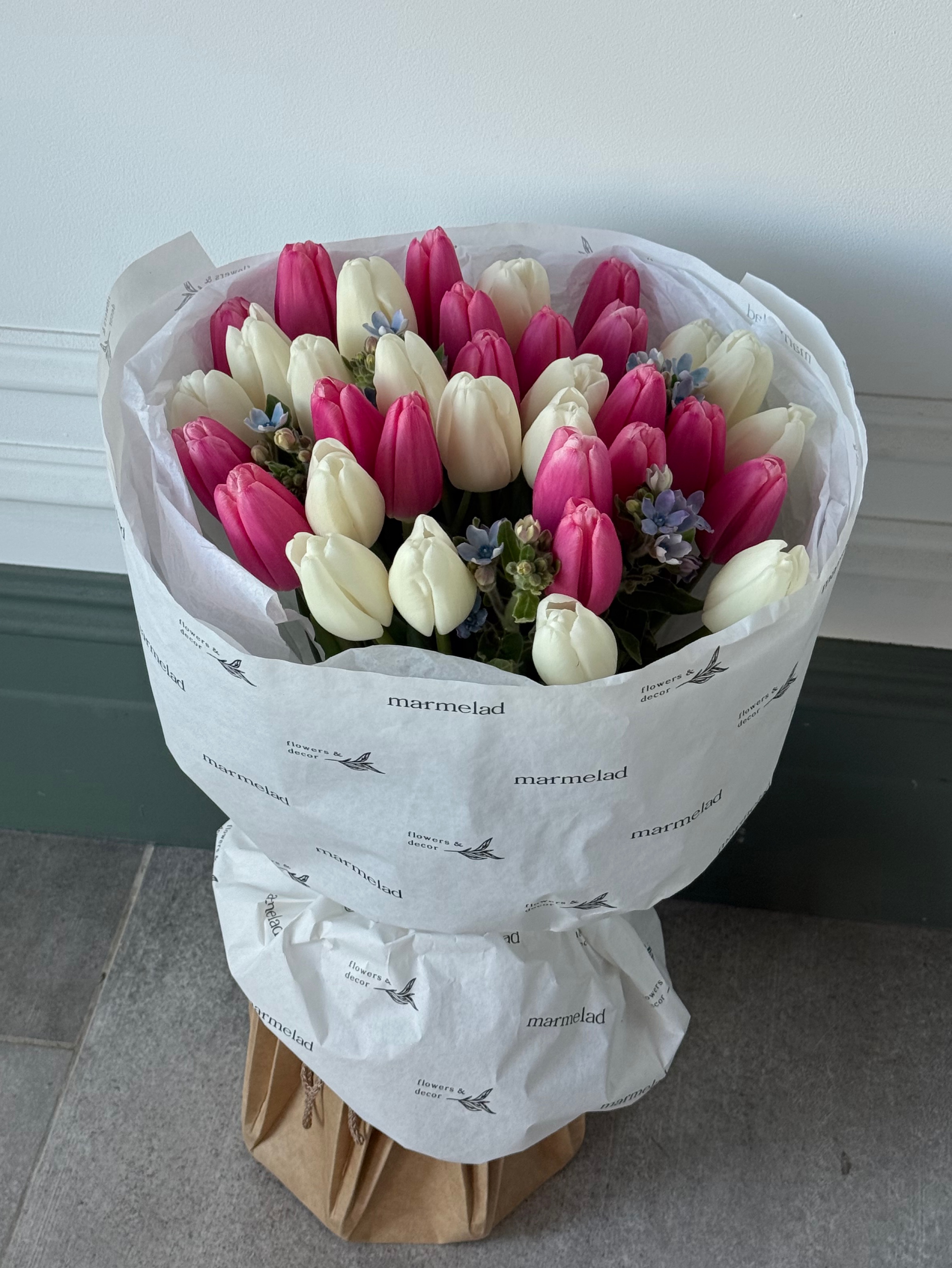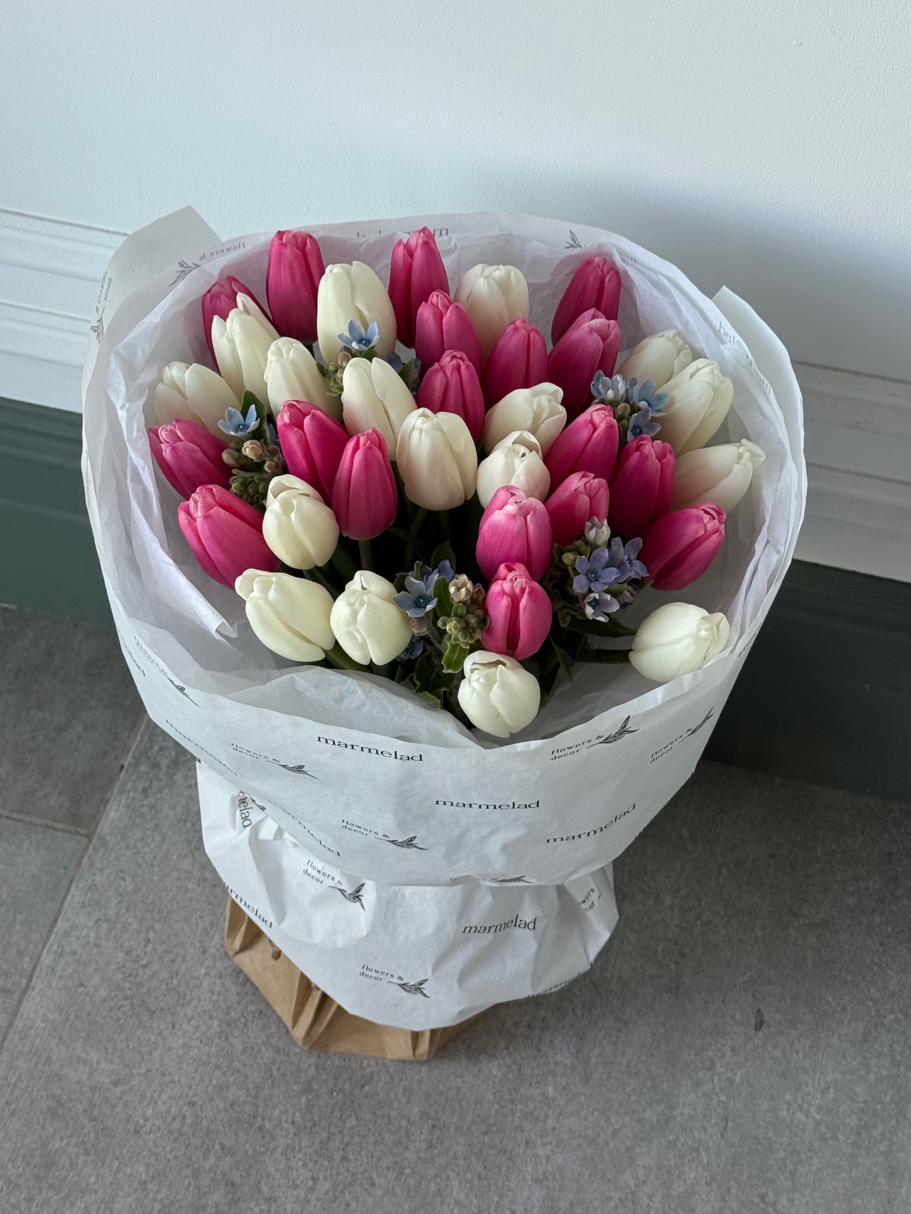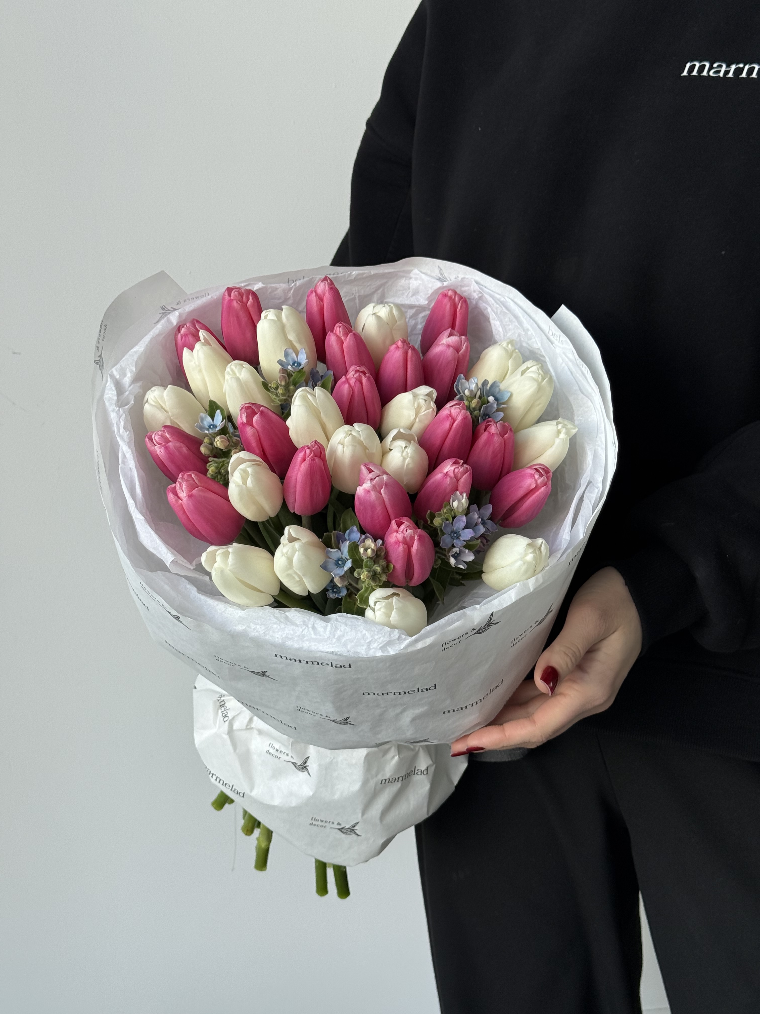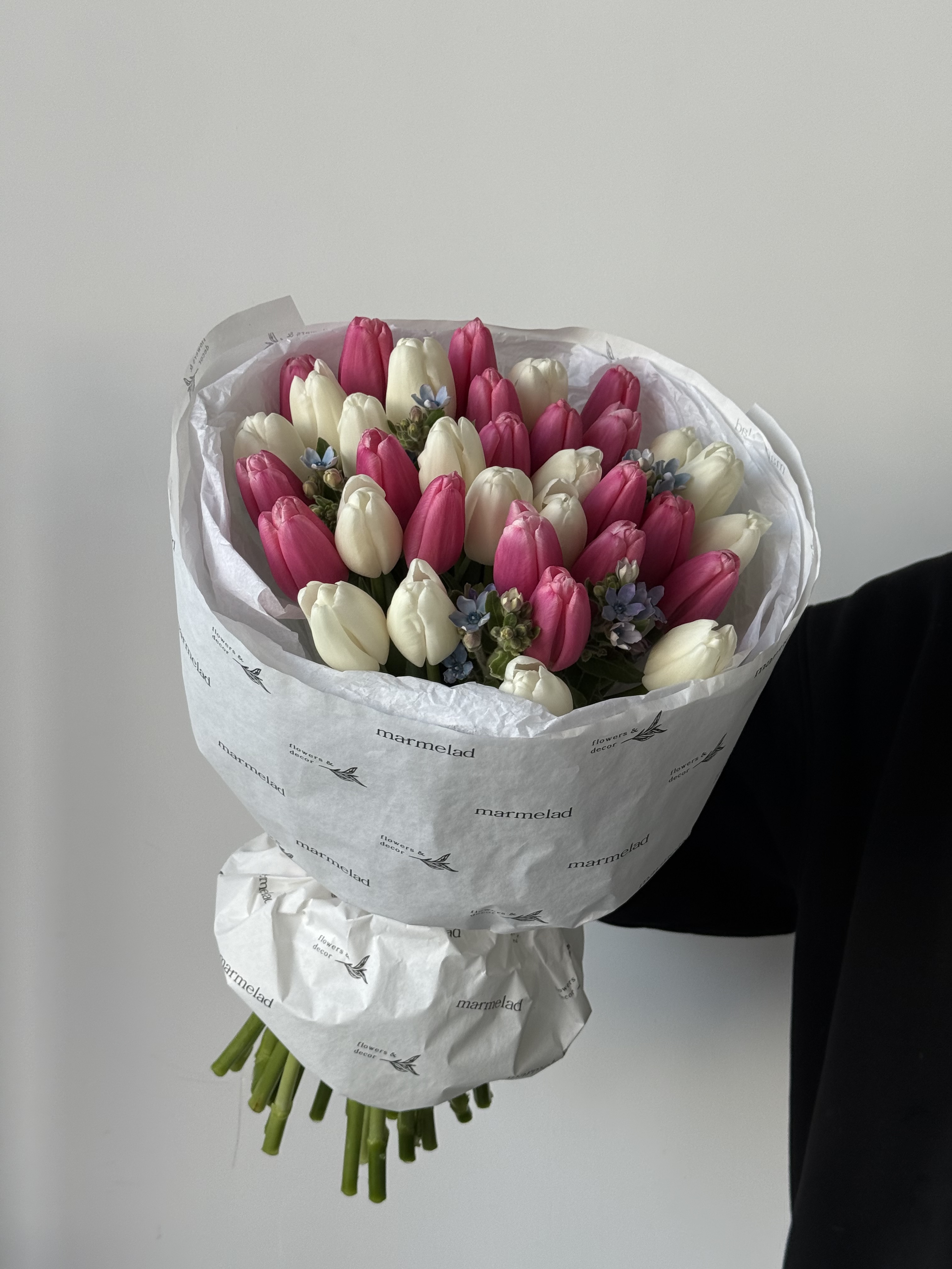 Букет из 21 тюльпана белого, розового цвета и незабудок доступен к заказу с 3.03.2026