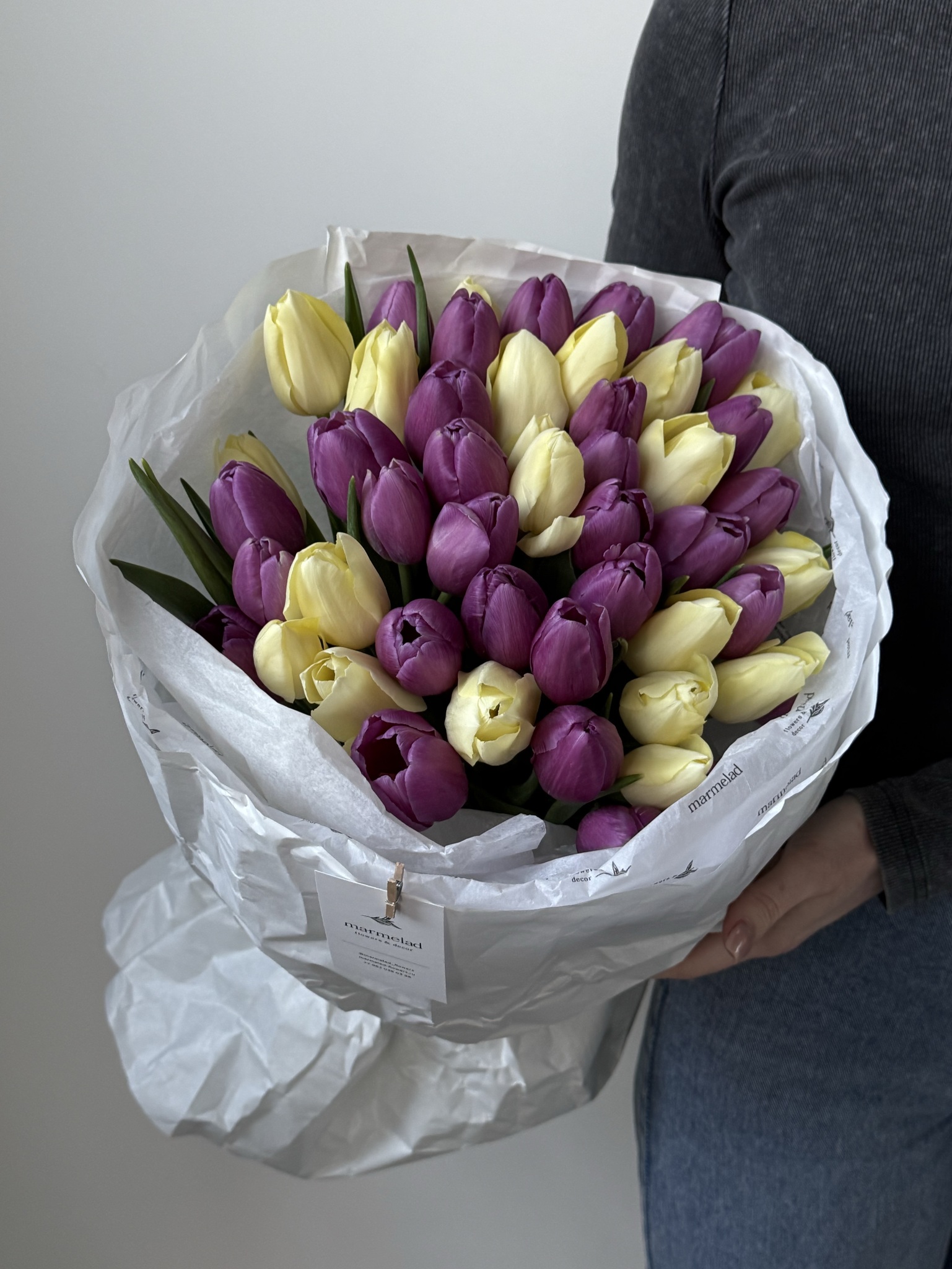 Букет из 51 фиолетового и желтого тюльпана-L