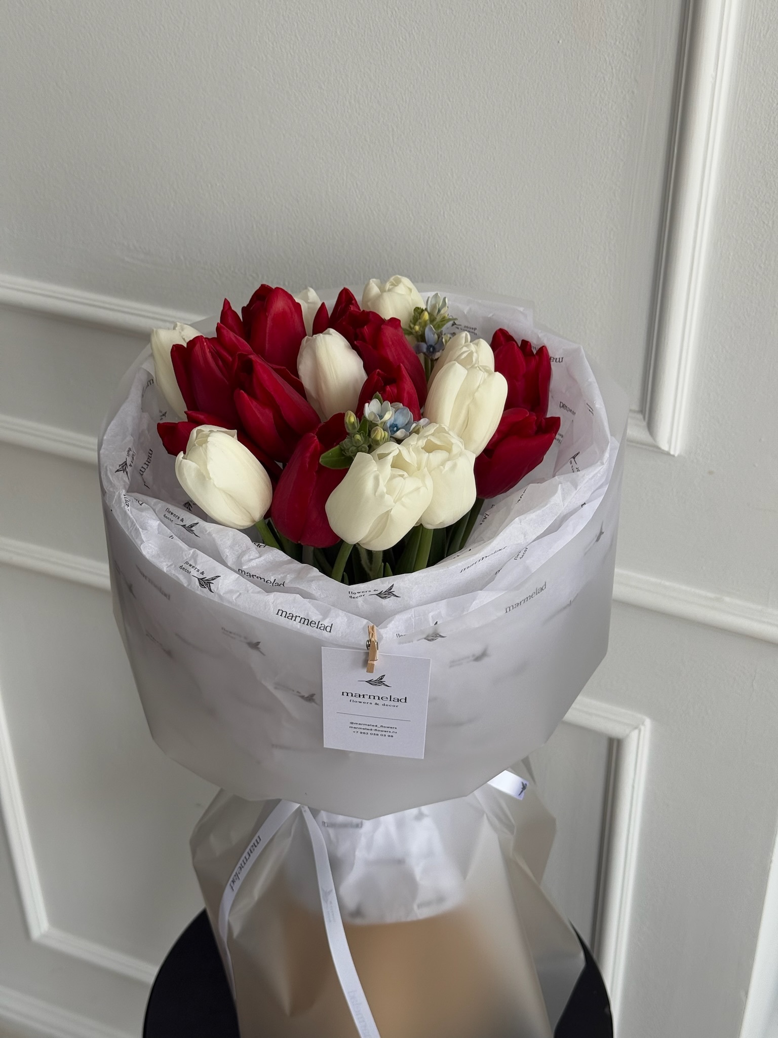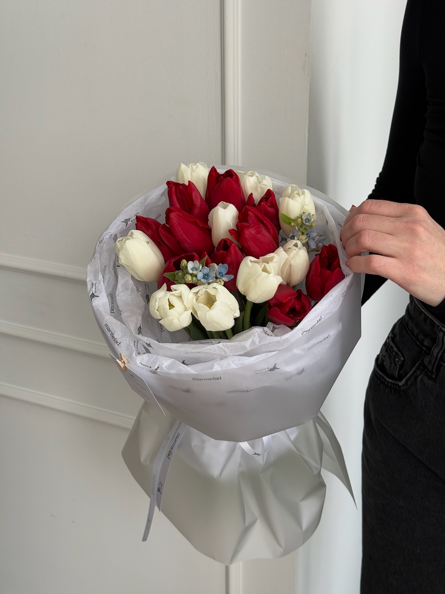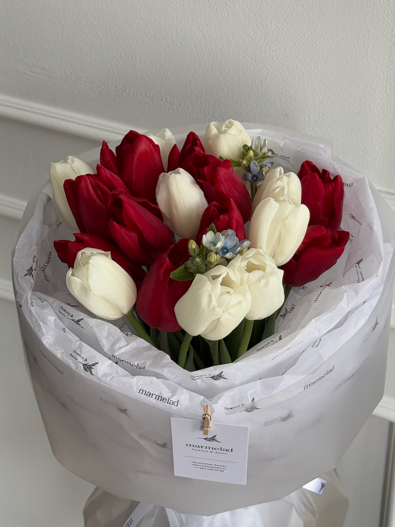 Букет из красных и белых тюльпанов с незабудками в оформлении из фирменной брендированной бумаги