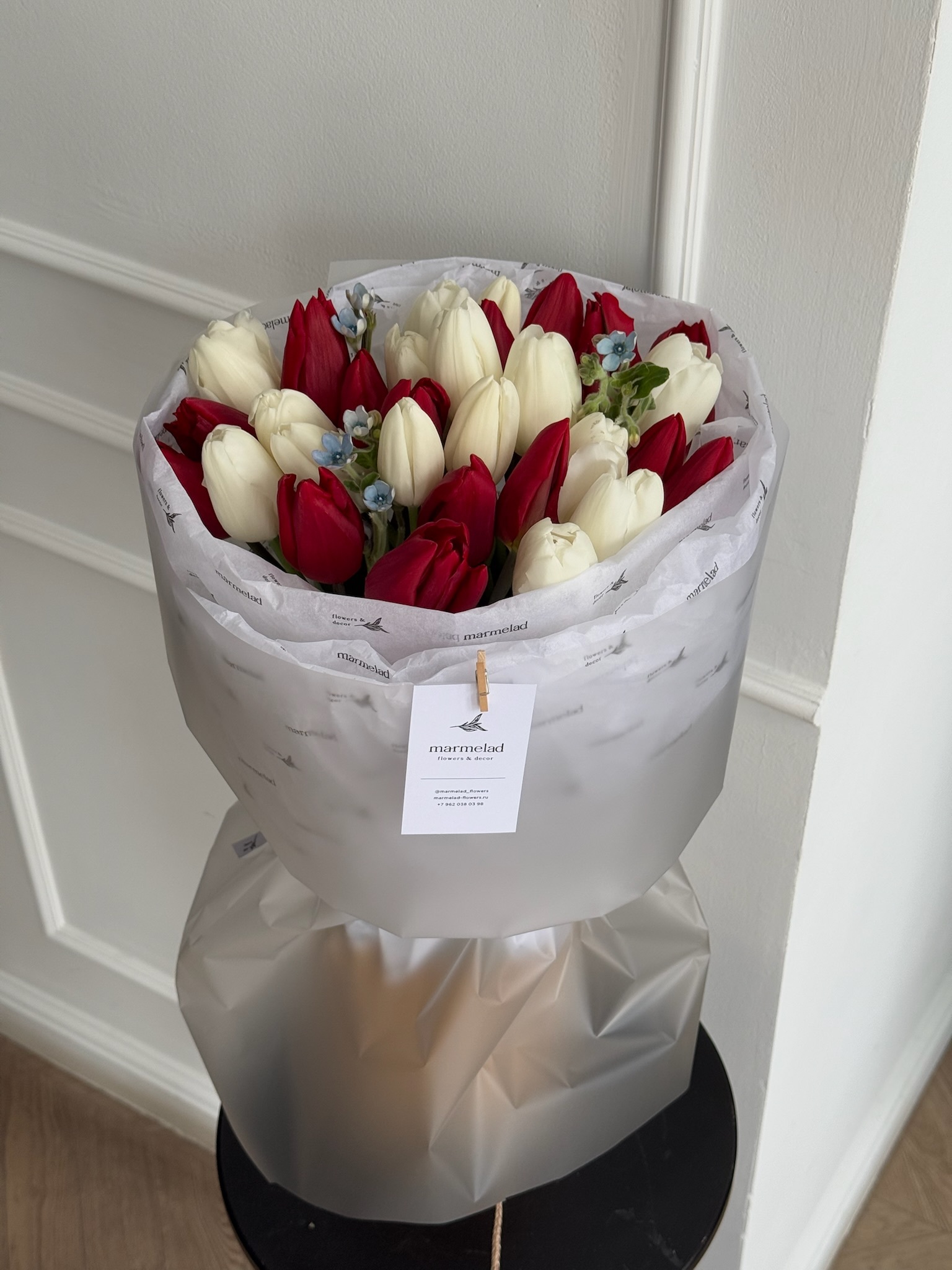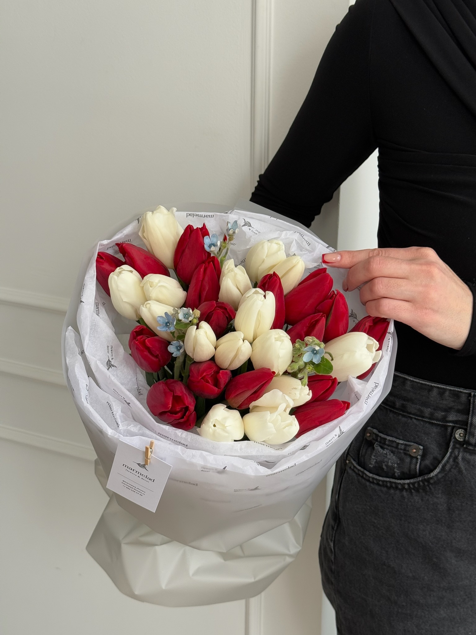 Букет из 31 белых, красных тюльпанов и незабудок - M