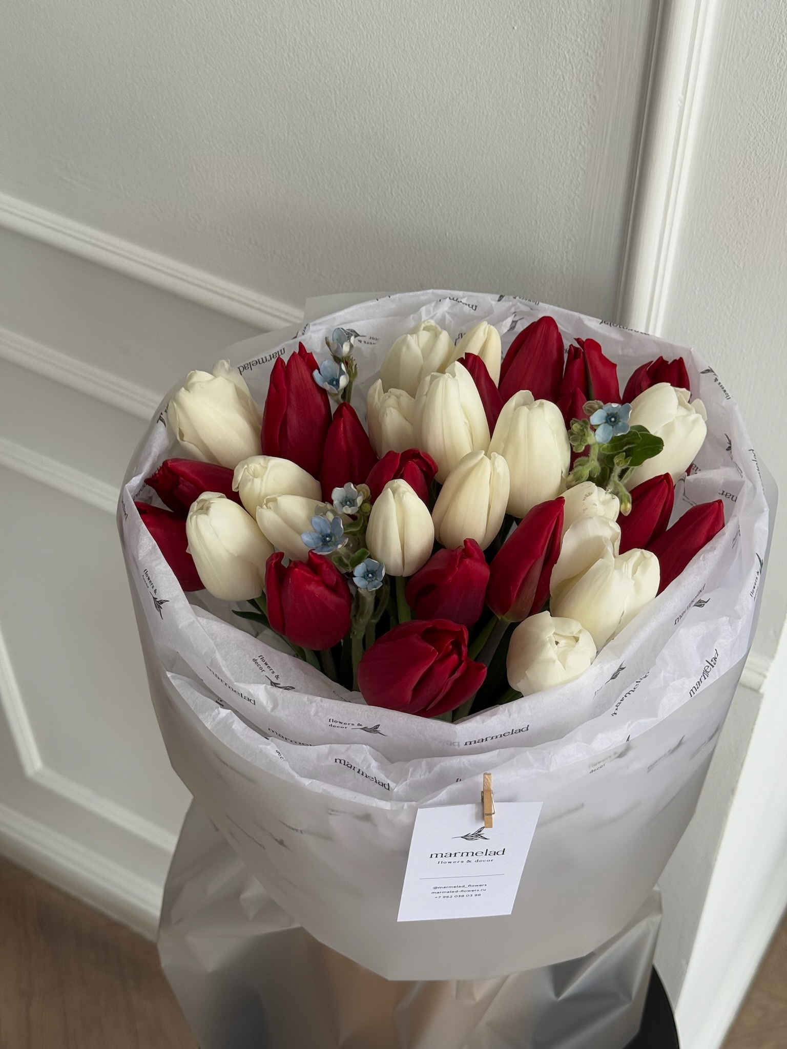Букет из красных и белых тюльпанов с незабудками в оформлении из фирменной брендированной бумаги