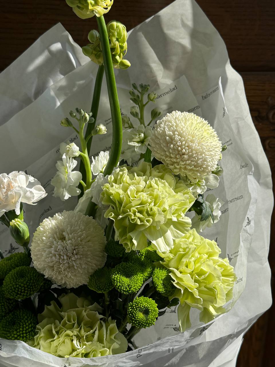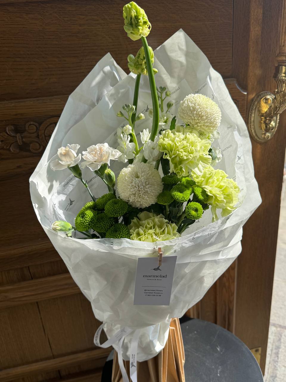 Кулек из диантусов, хризантемы, орнитогалума и маттиолы