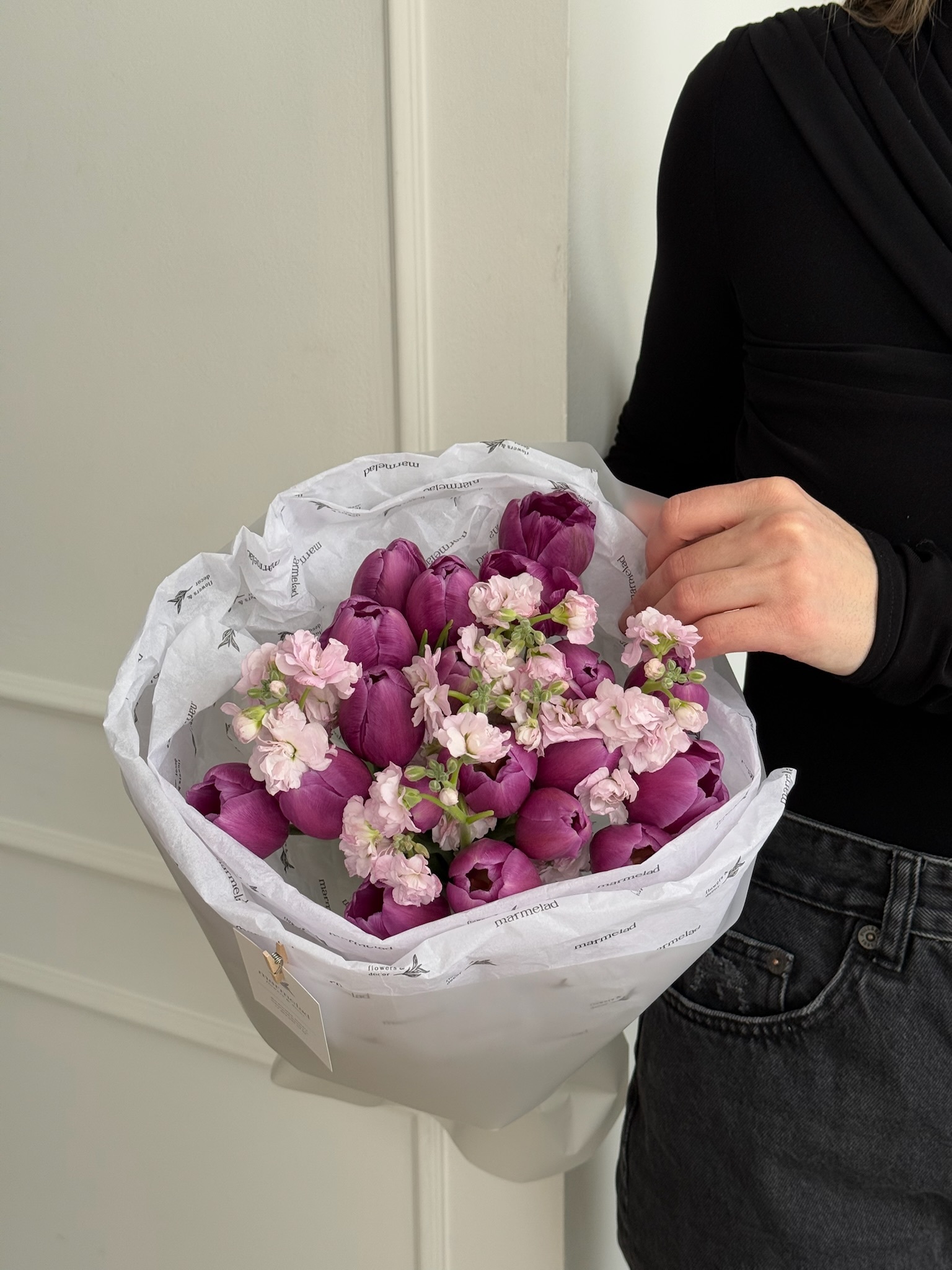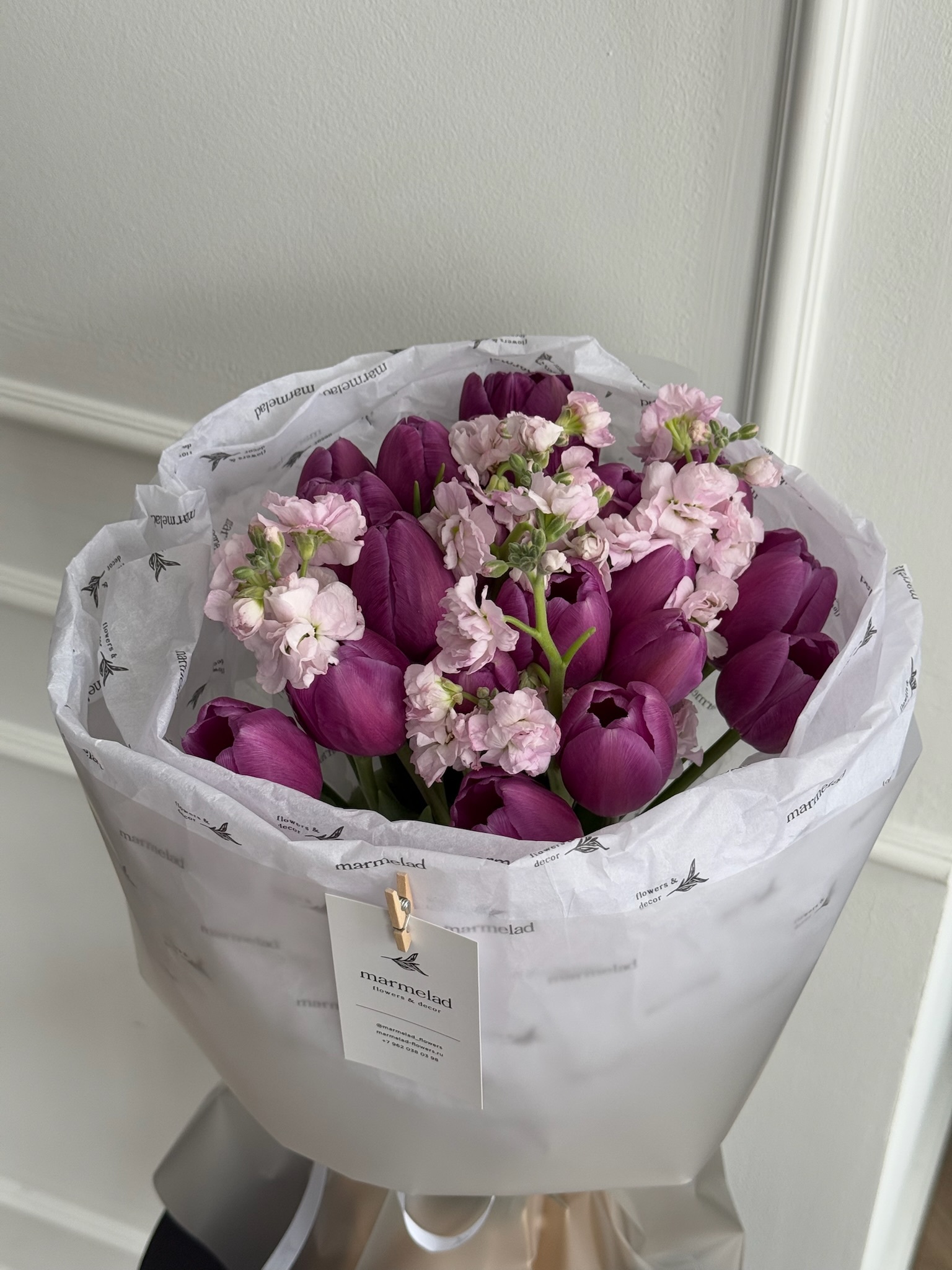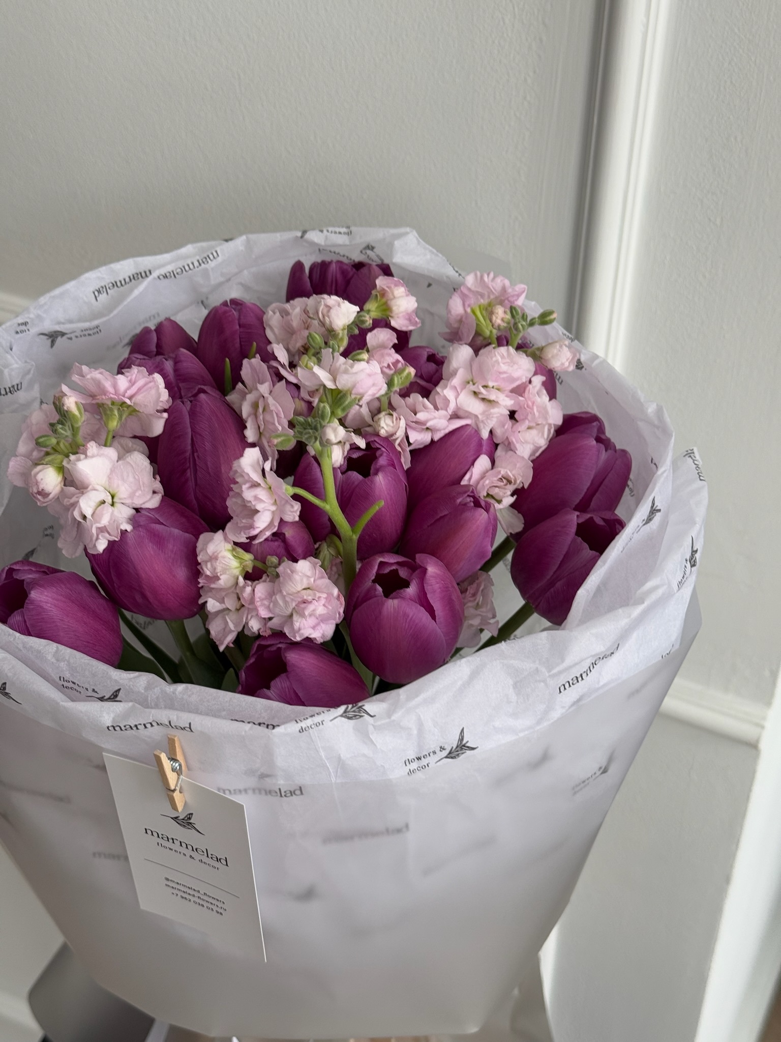 Букет из 19 фиолетовых тюльпанов и розовой маттиолы - S