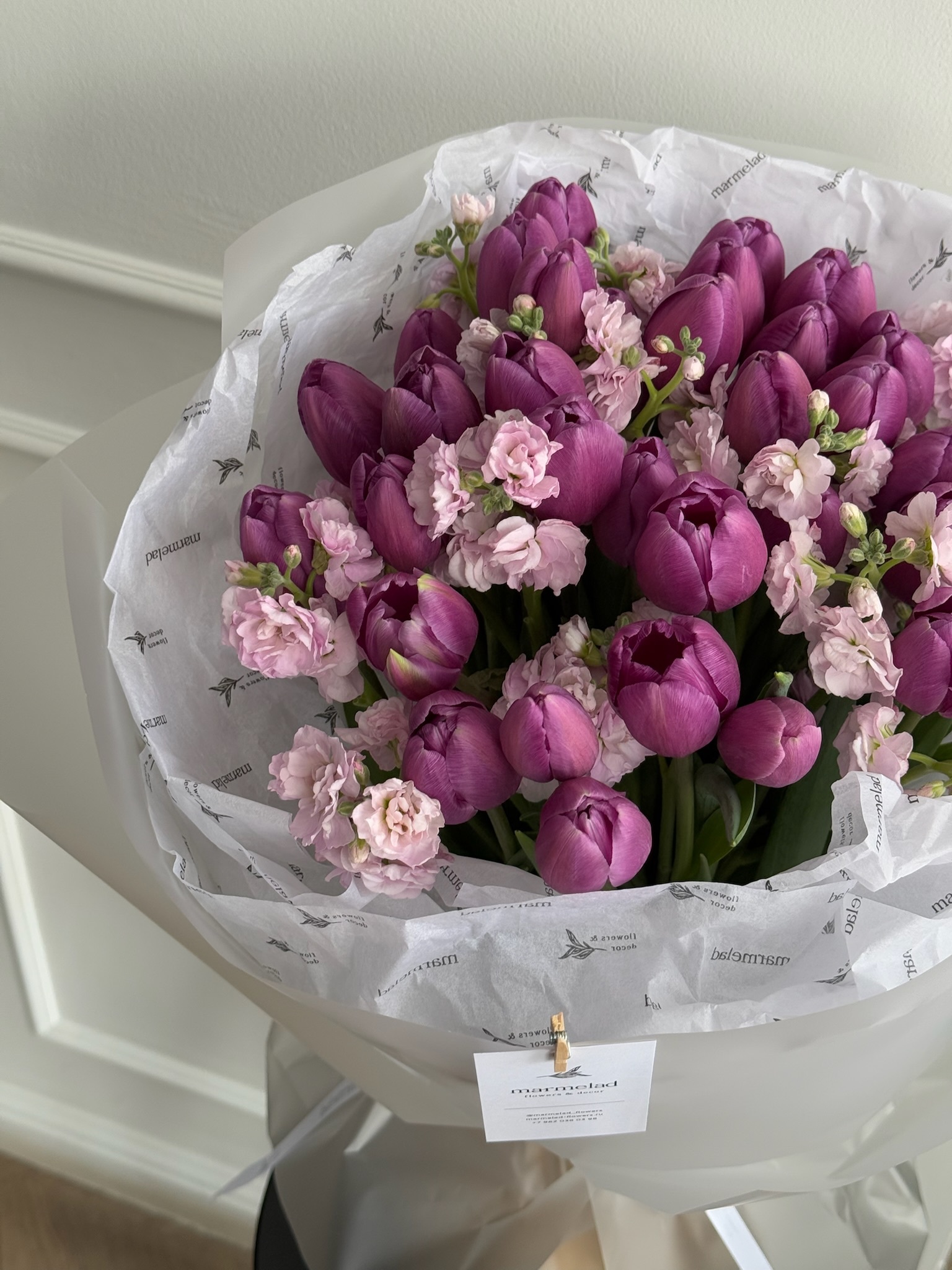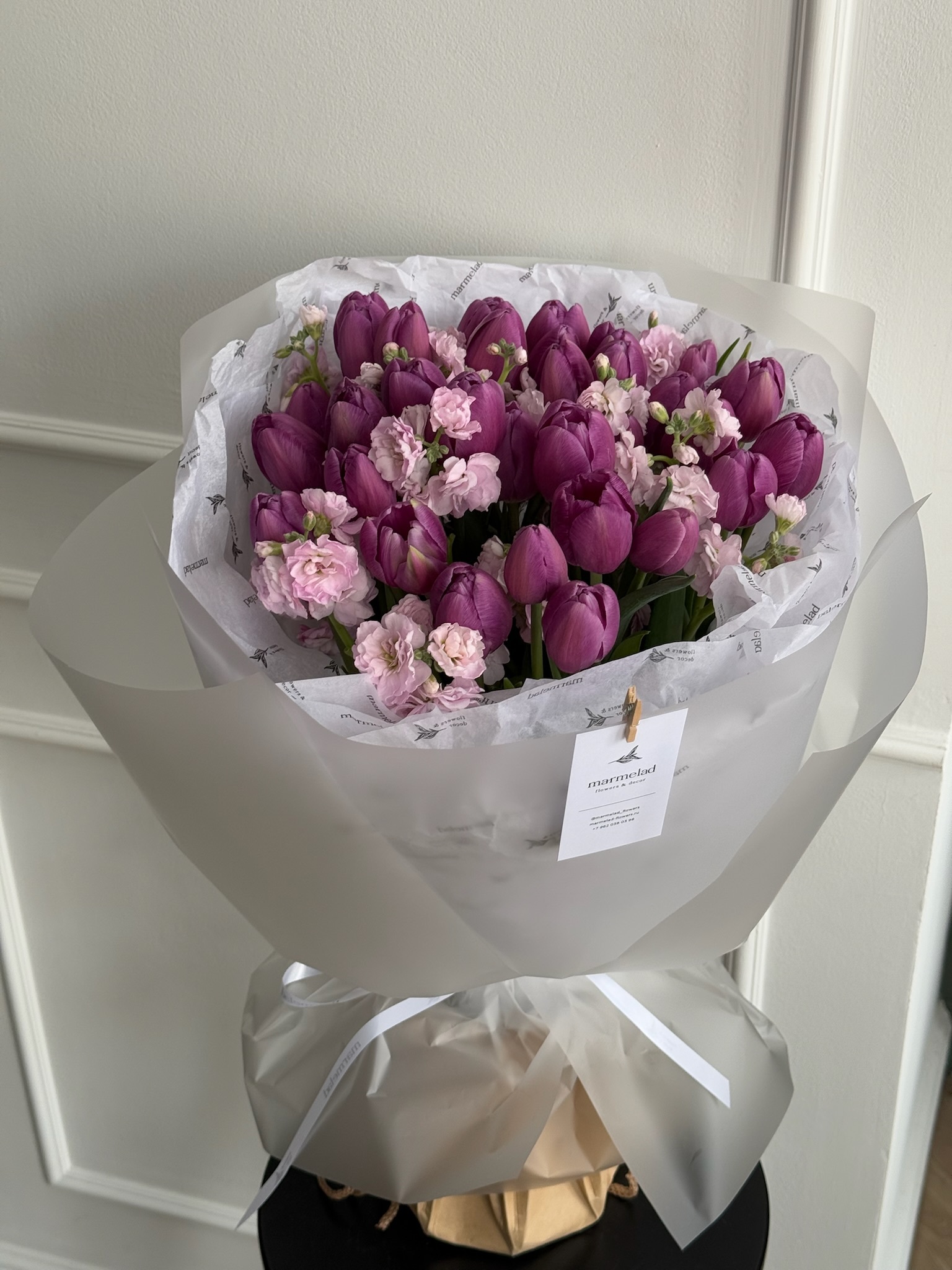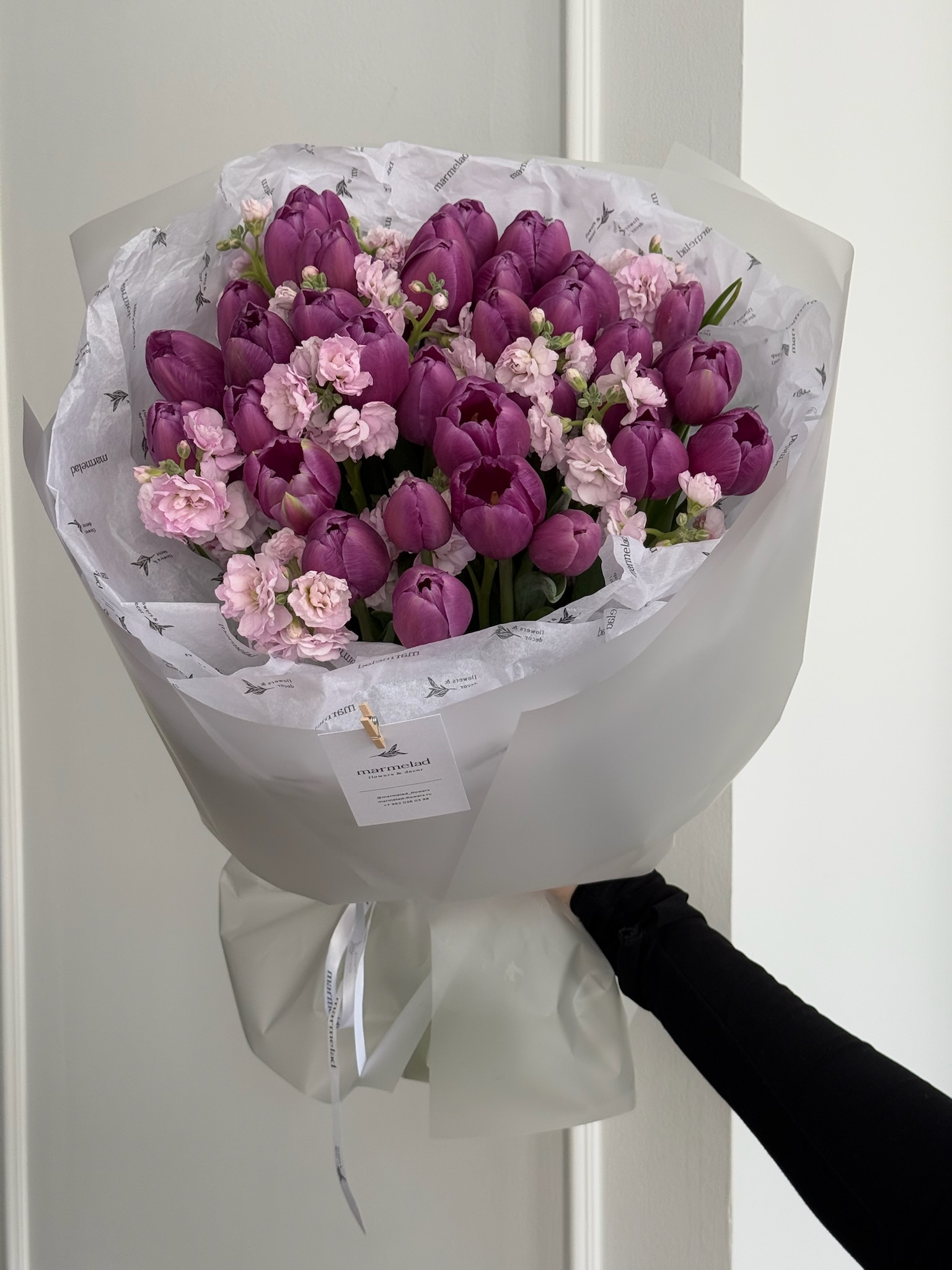 Букет из 35 фиолетовых тюльпанов и розовой маттиолы - M