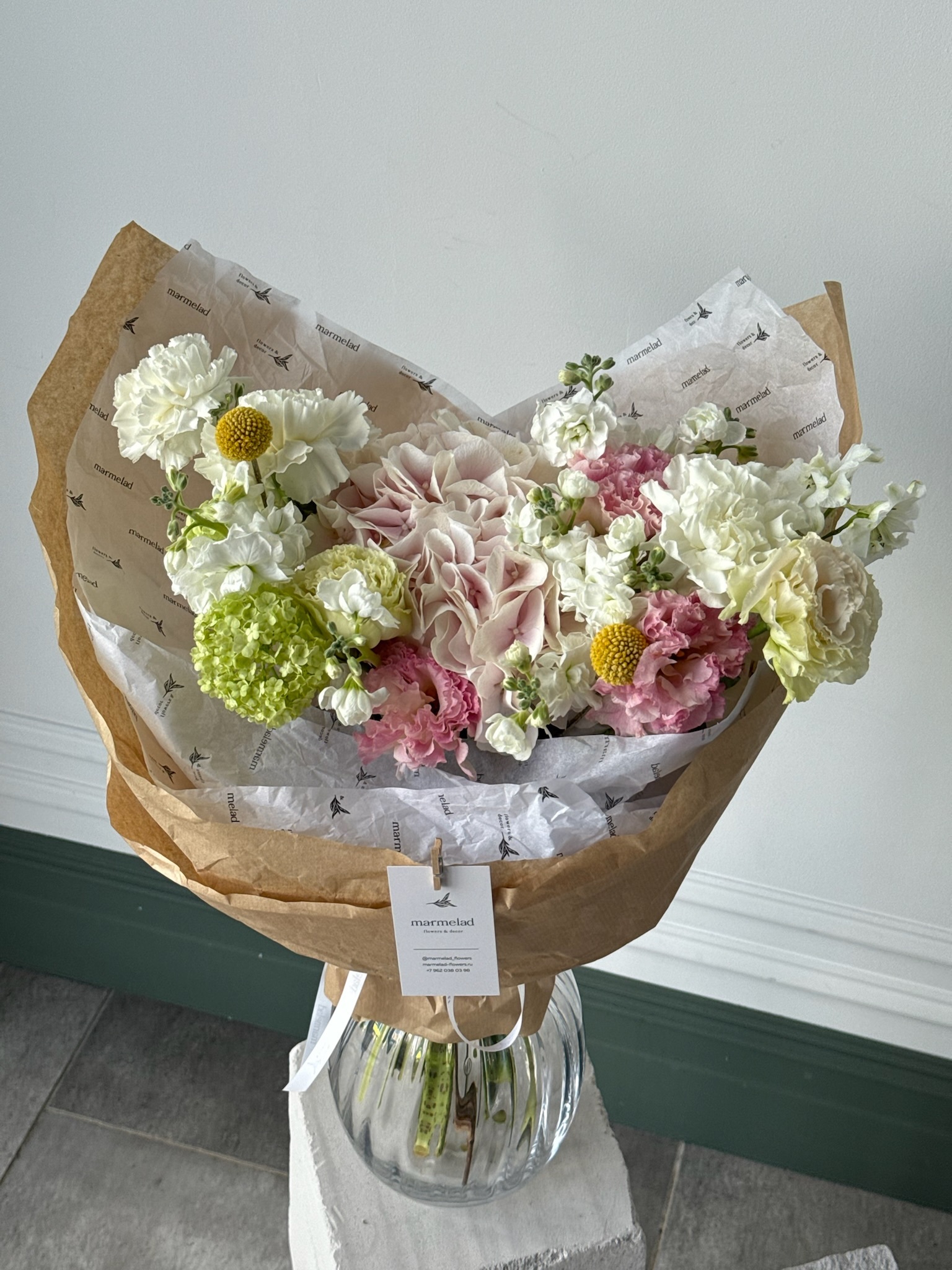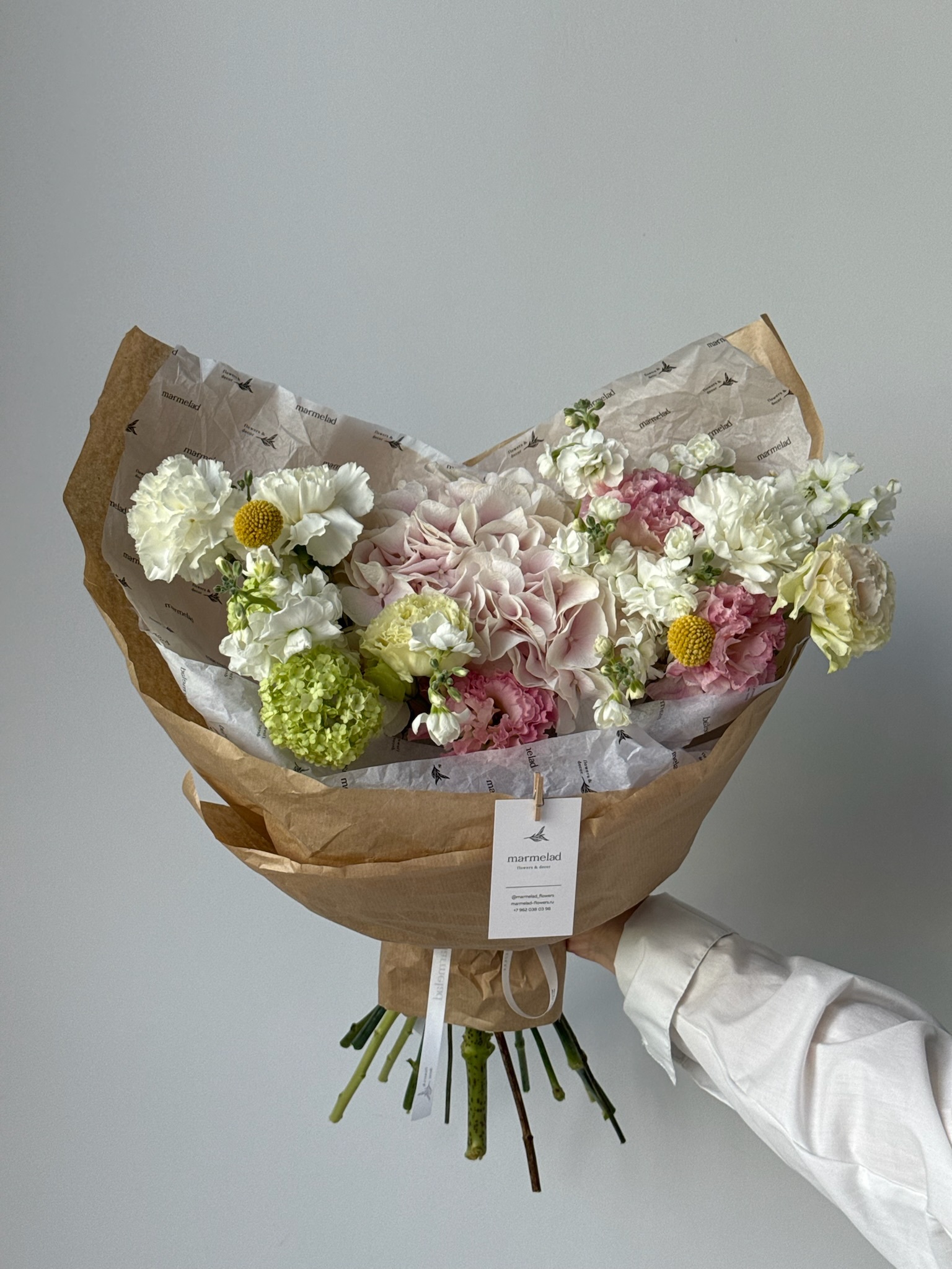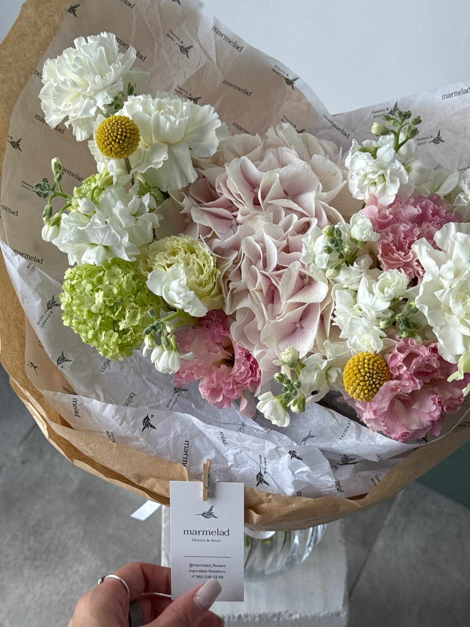 Букет из гортензии, маттиолы, диантусов, лизиантуса и вибурнума