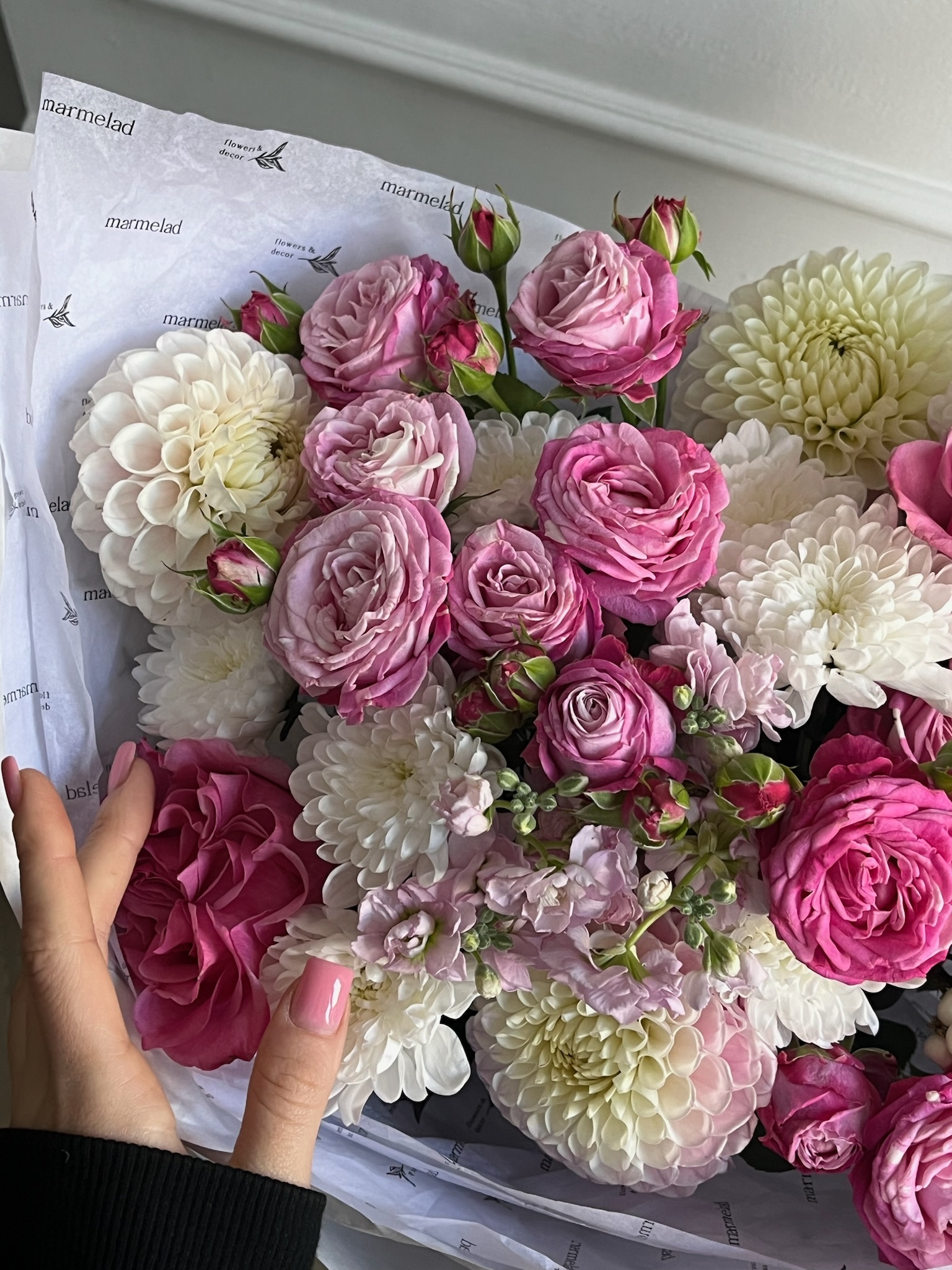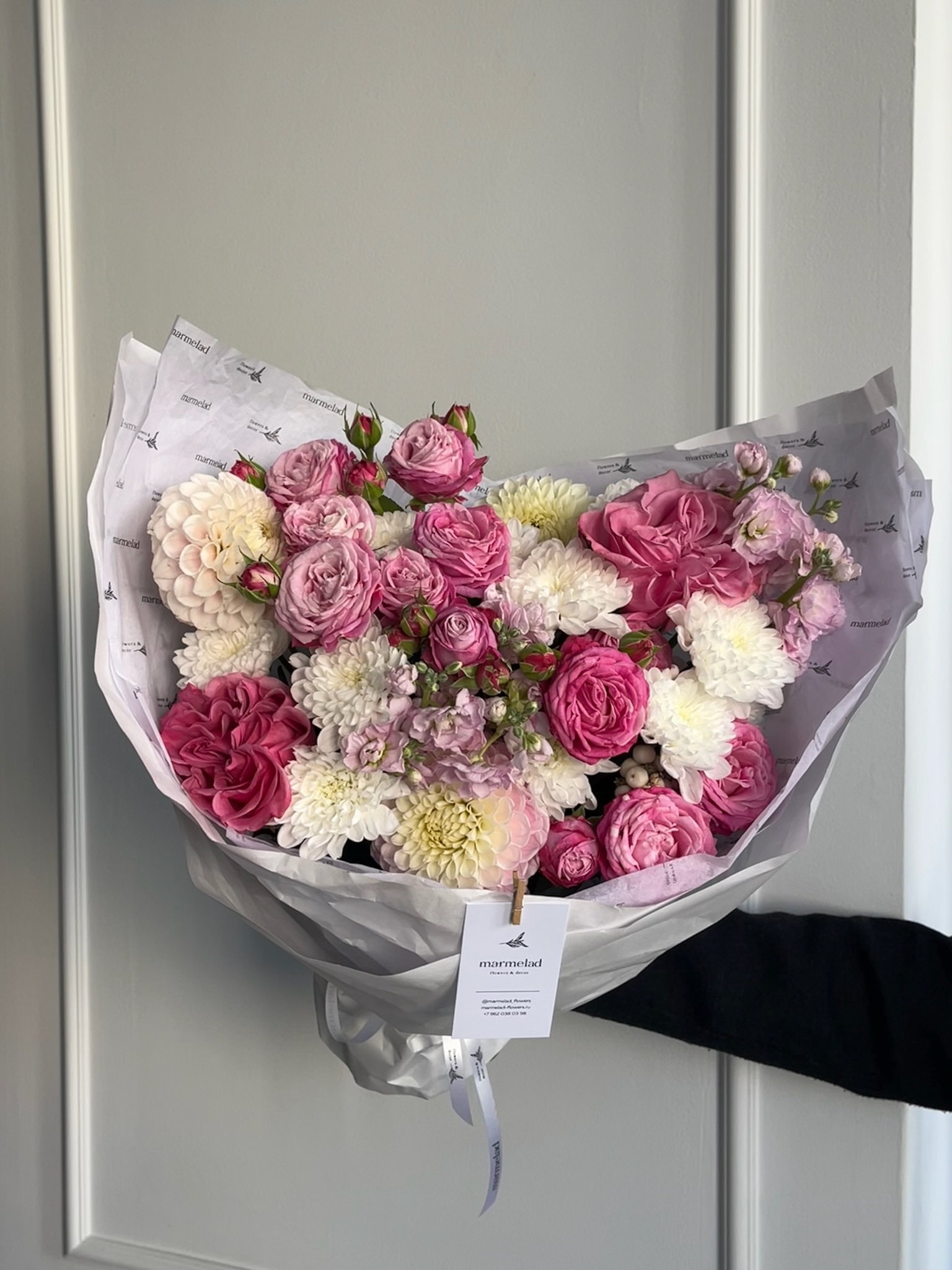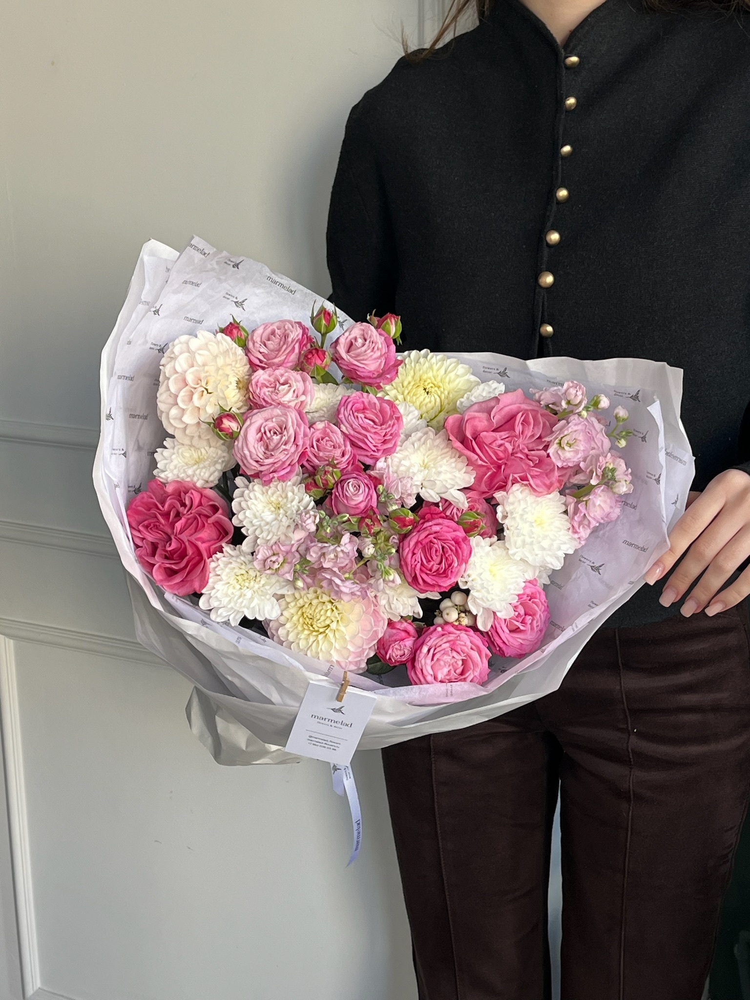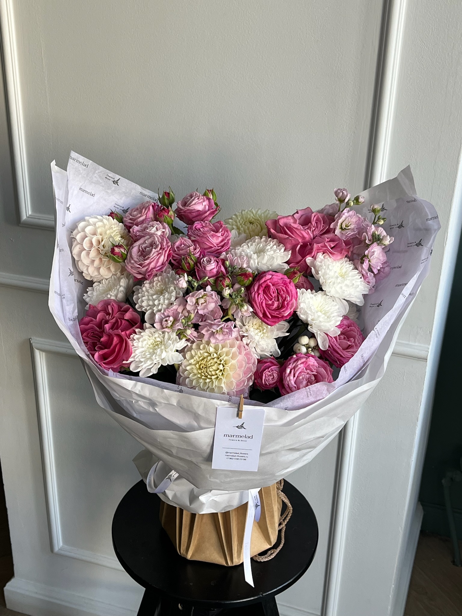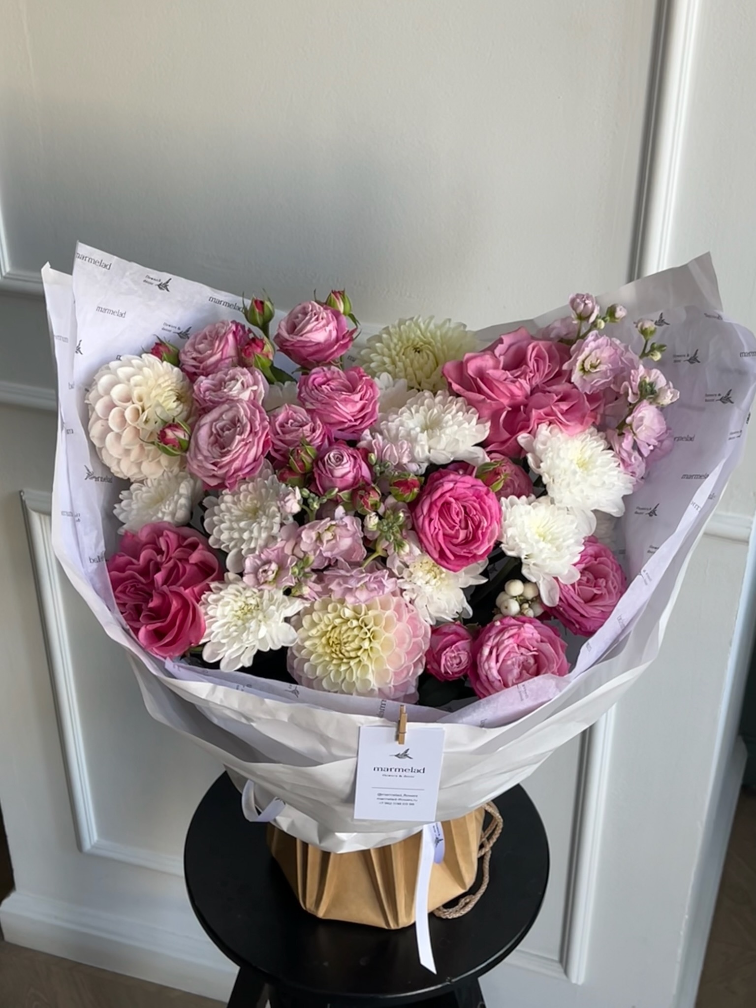 Букет из кустовых пионовидных роз, георгин, маттиолы и хризантемы