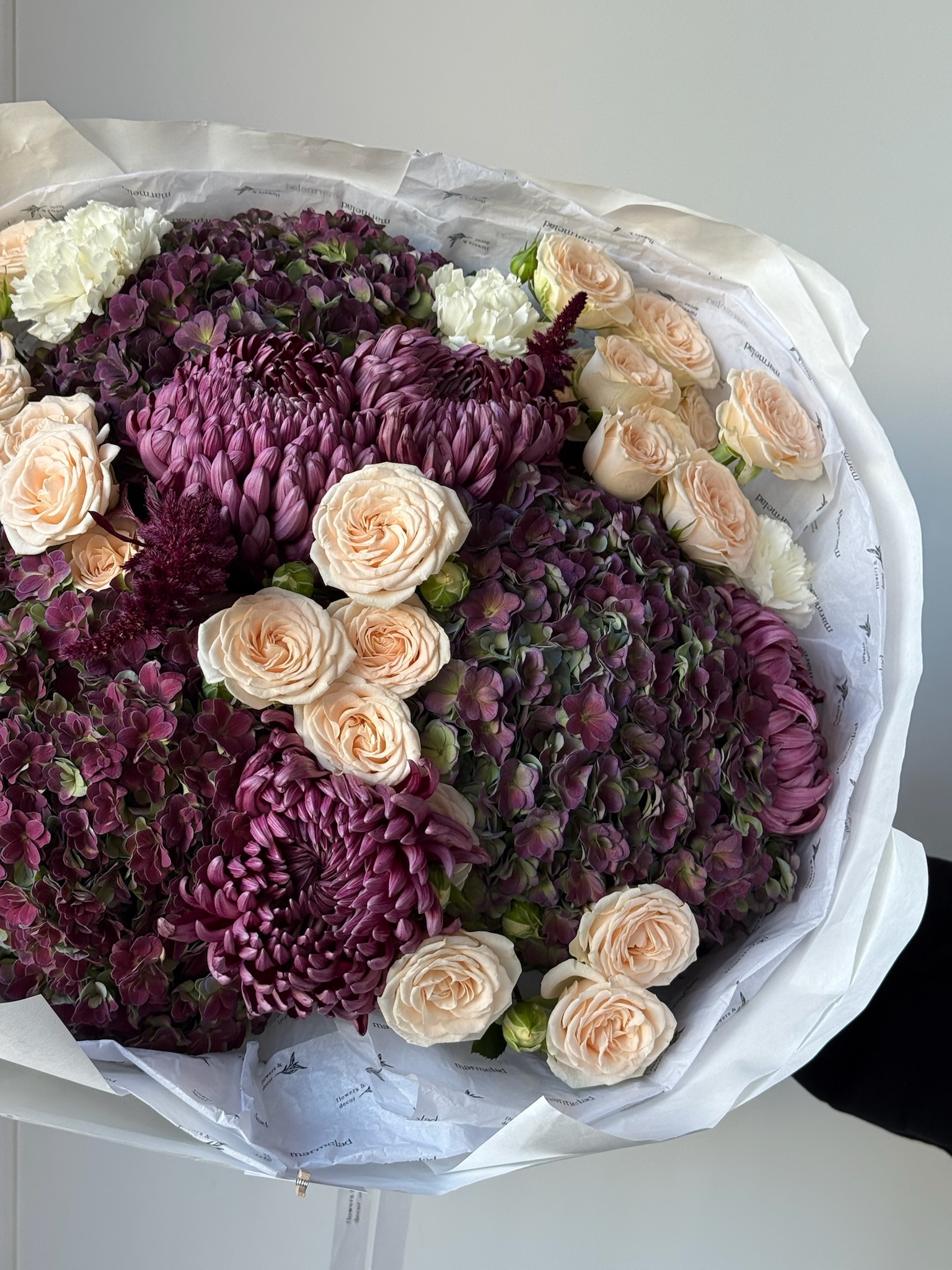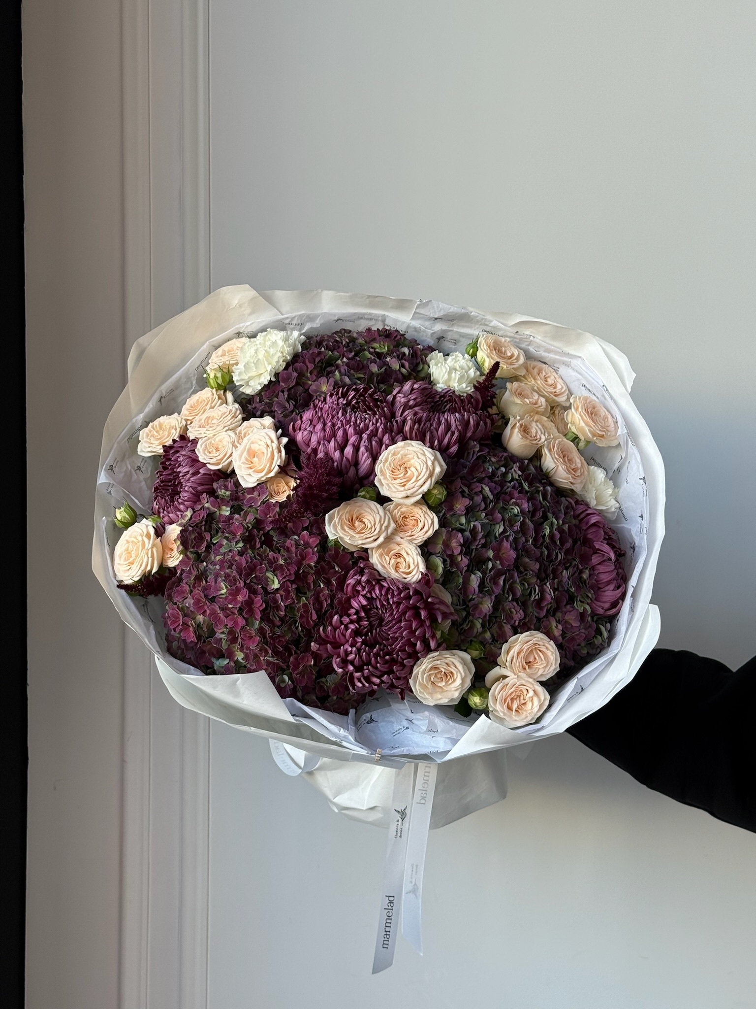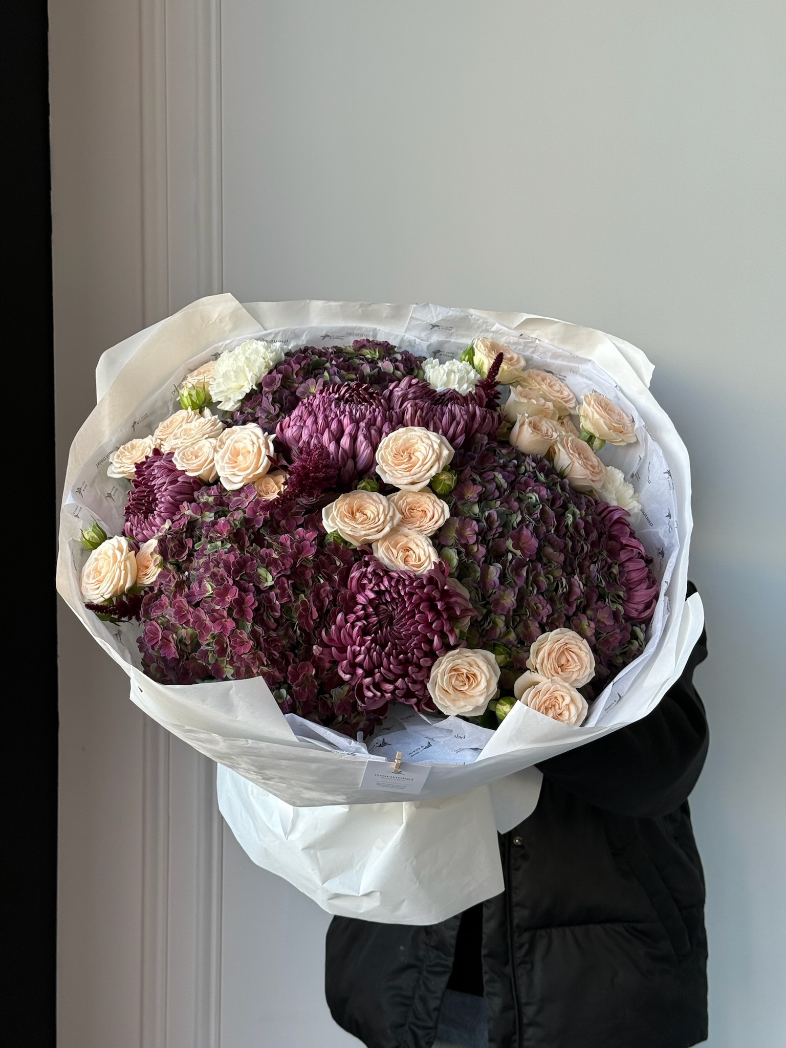 Букет из гортензии, хризантемы бигуди и кустовых пионовидных роз