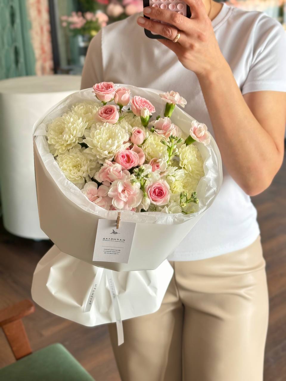 Букет из хризантемы, диантусов, кустовой розы и маттиолы