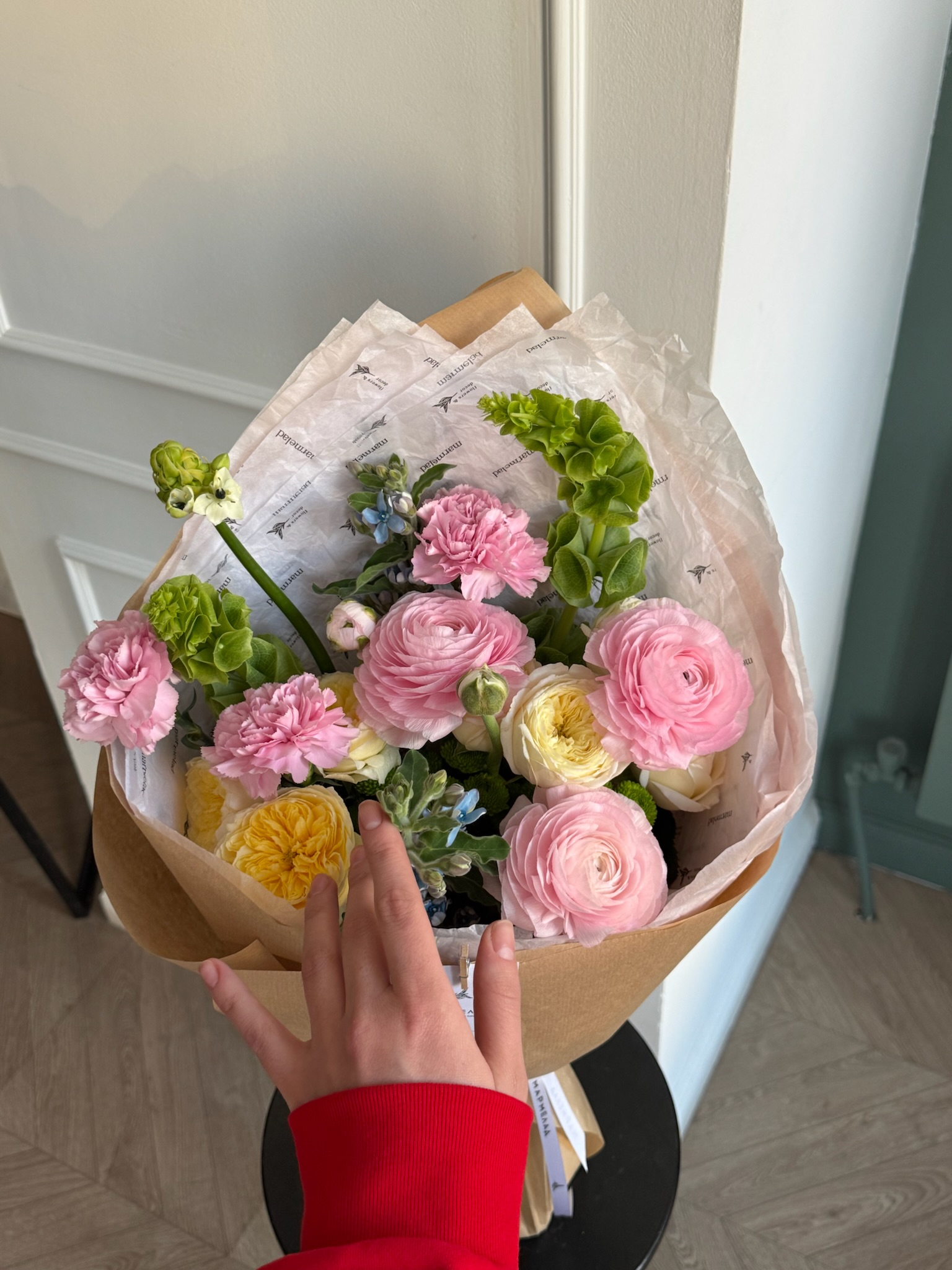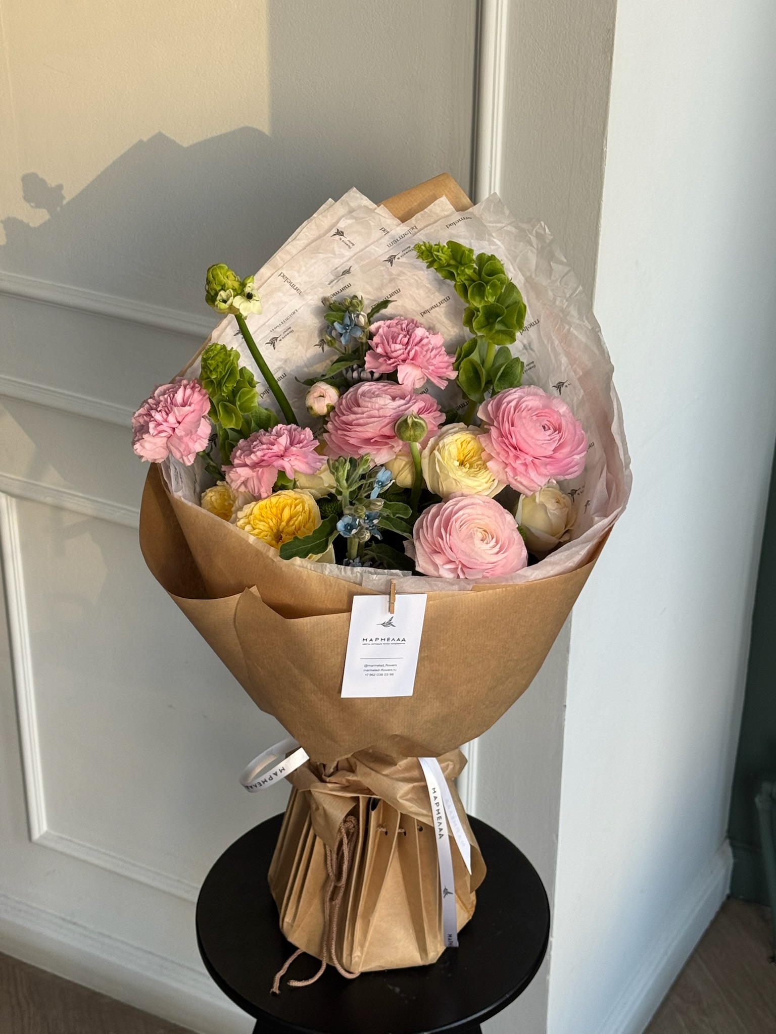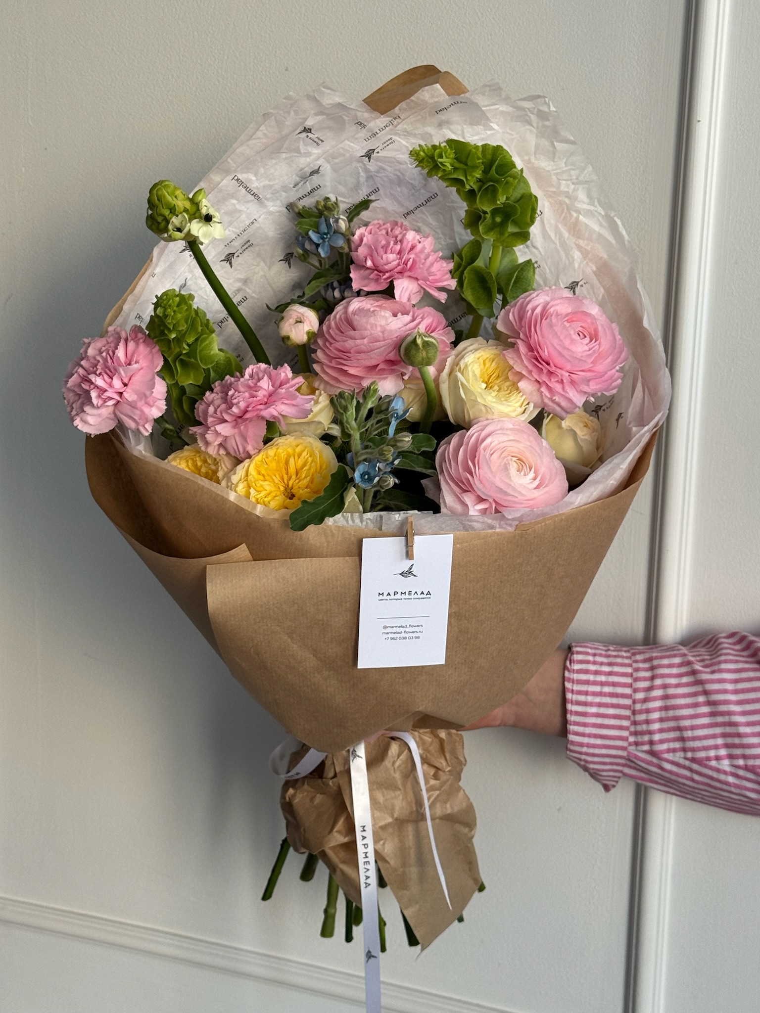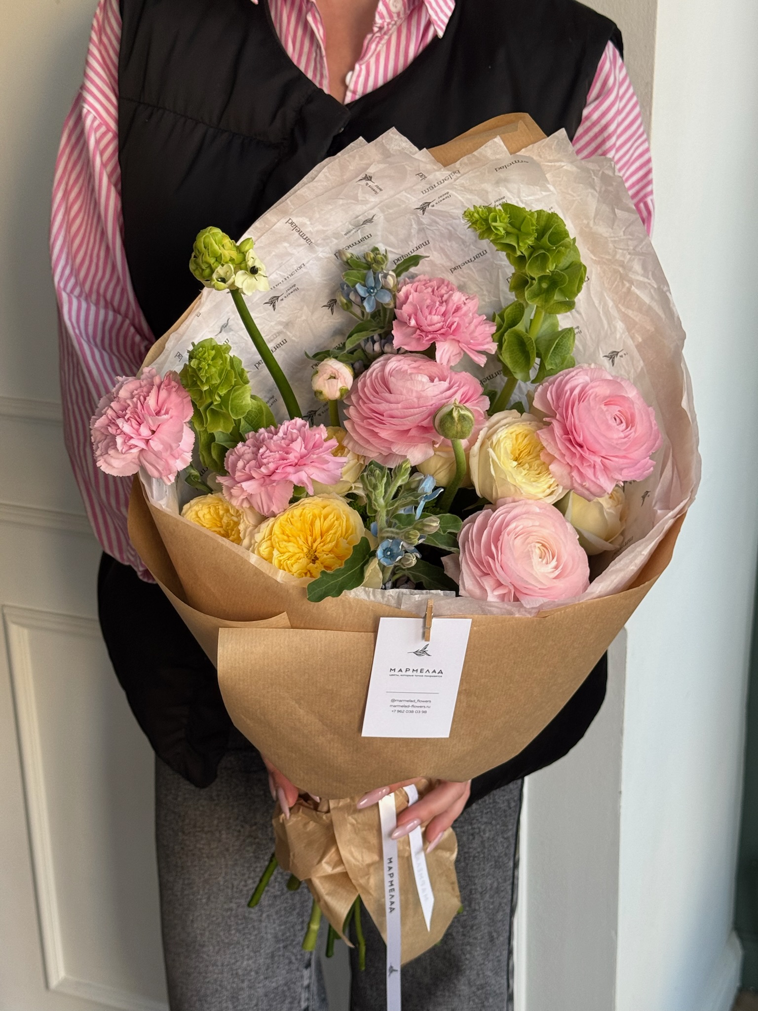 Букет из диантусов, оксипеталума, ранункулюсов, молюцеллы и кустовых пионовидных роз