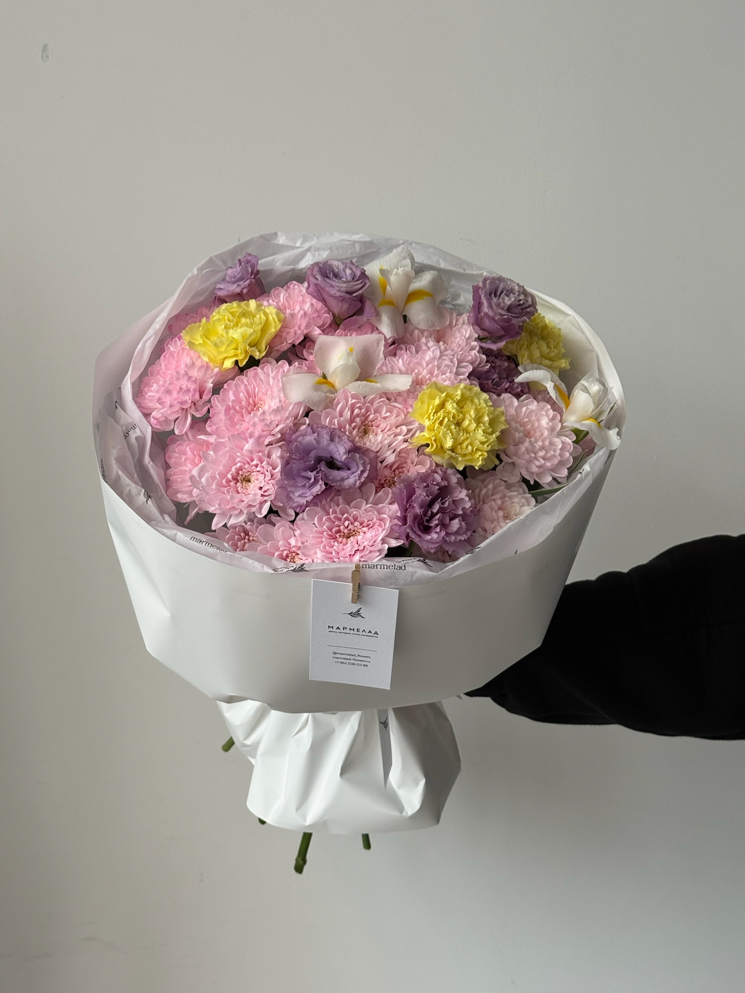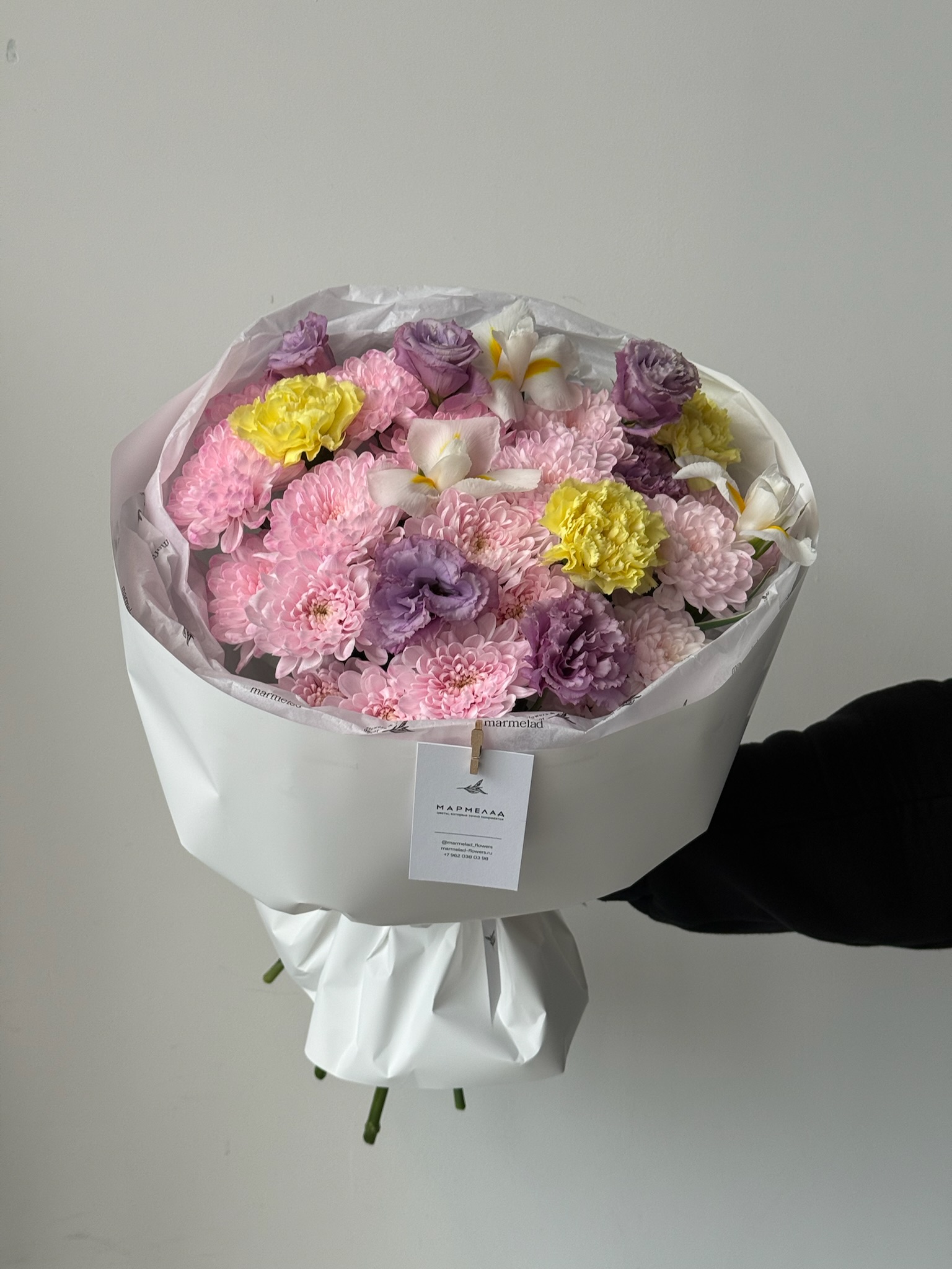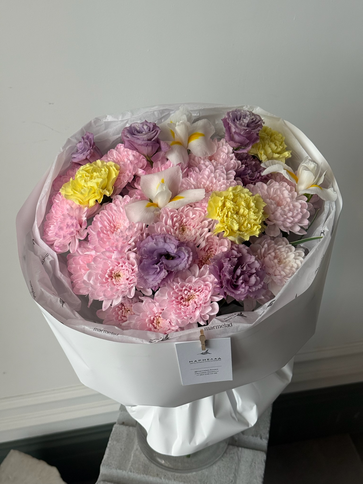 Букет из хризантемы в розовом оттенке, диантусов, ирисов и лизиантуса