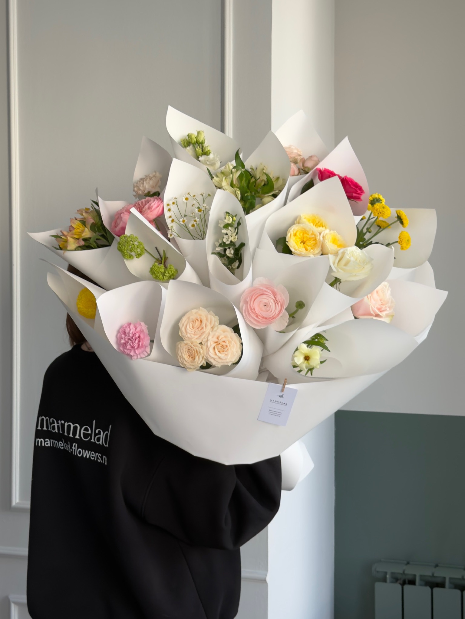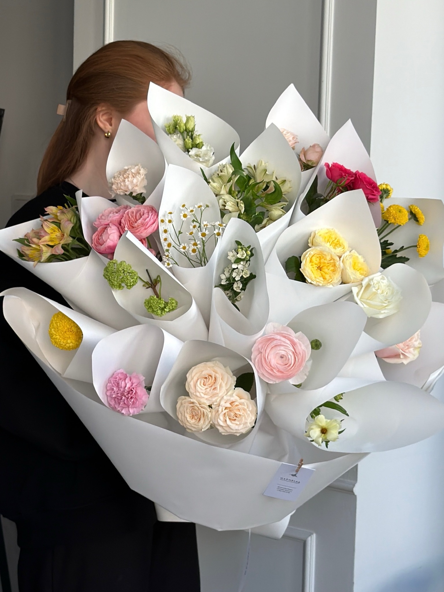 Наш ассортимент разнообразен и состоит из регулярных цветов и сезонных, которые сменяются, поэтому если каких-то цветов из предложенного букета не будет в наличии, мы всегда сможем предложить вам альтернативную замену