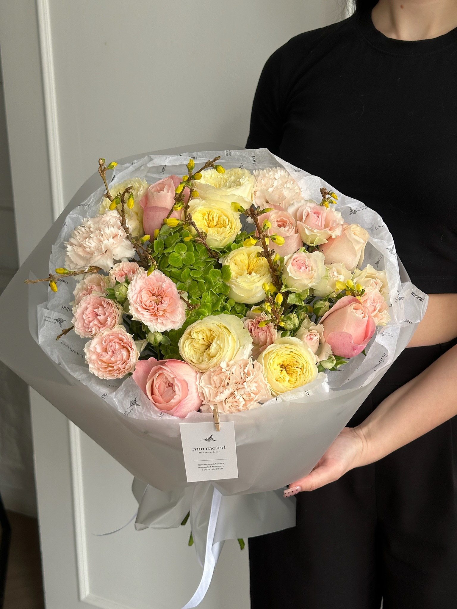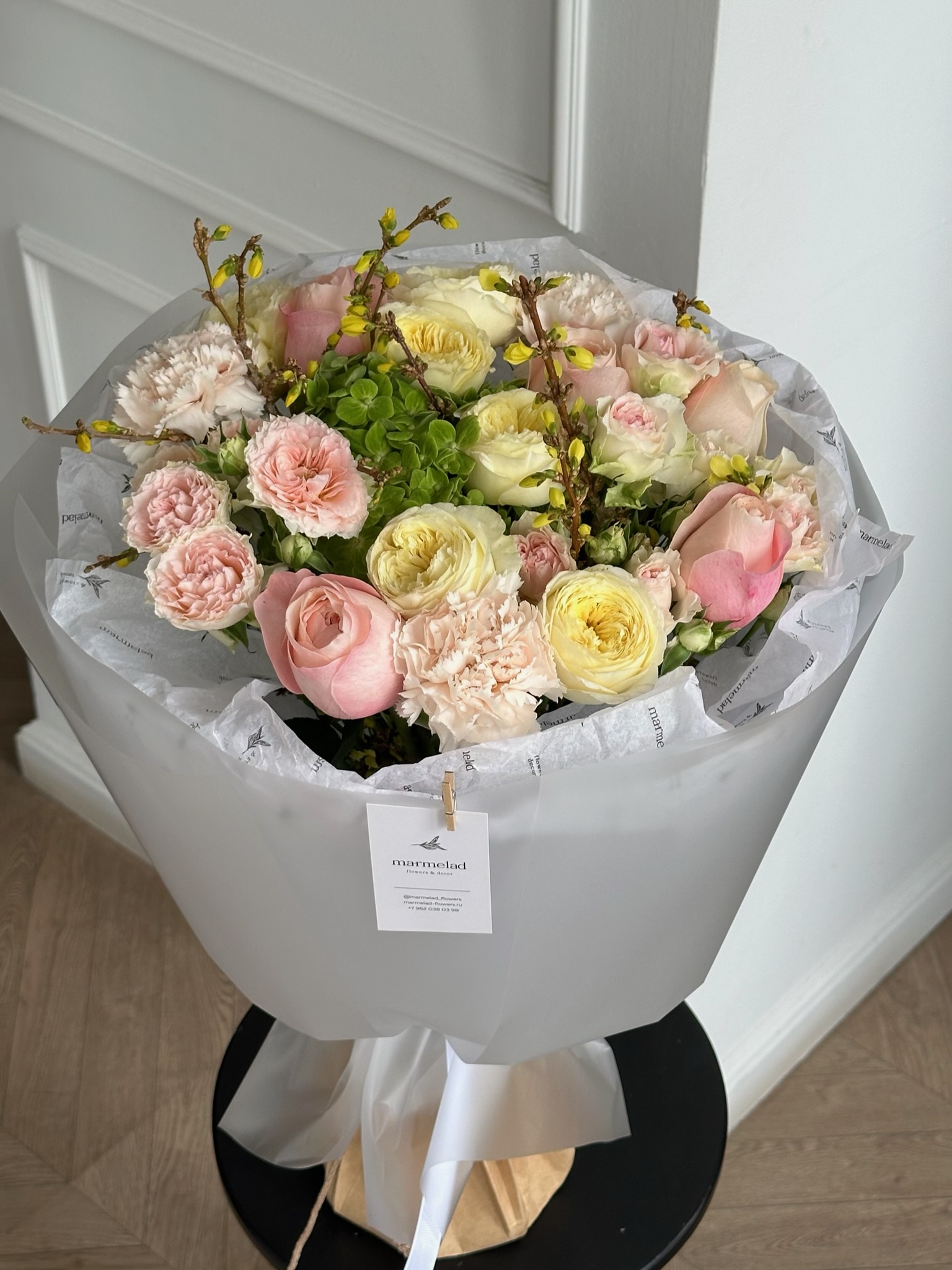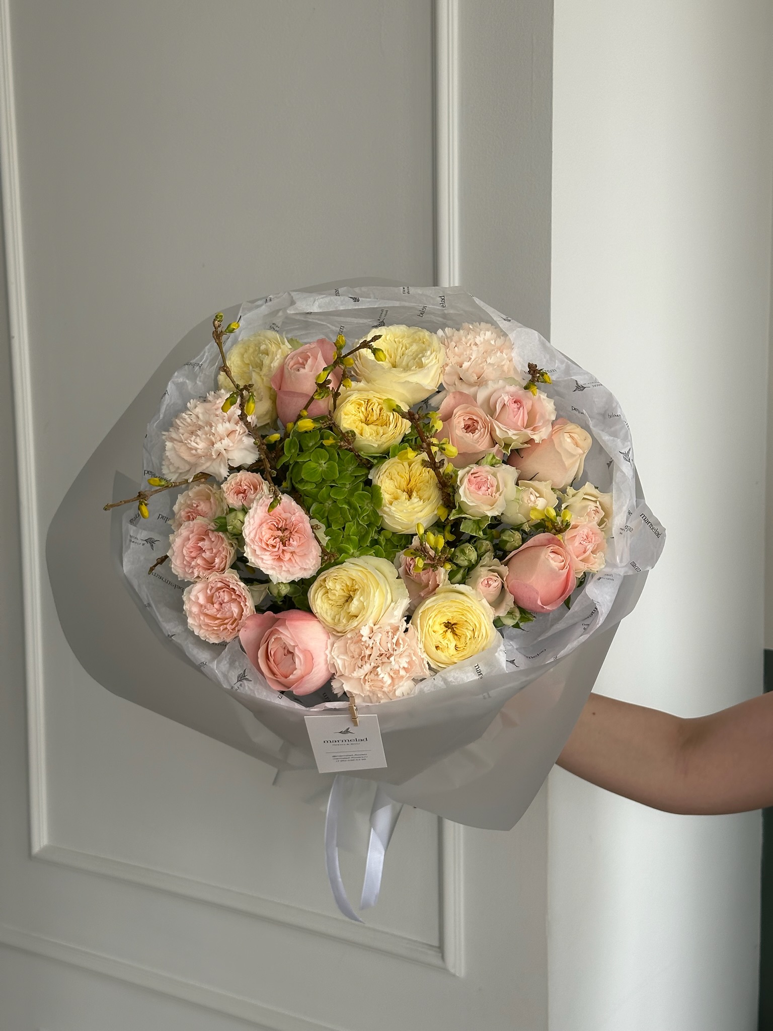 Букет из кустовых роз, гортензии, диантусов и форзиции