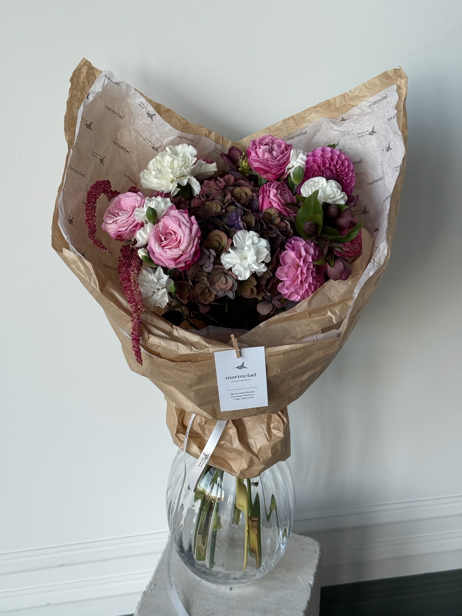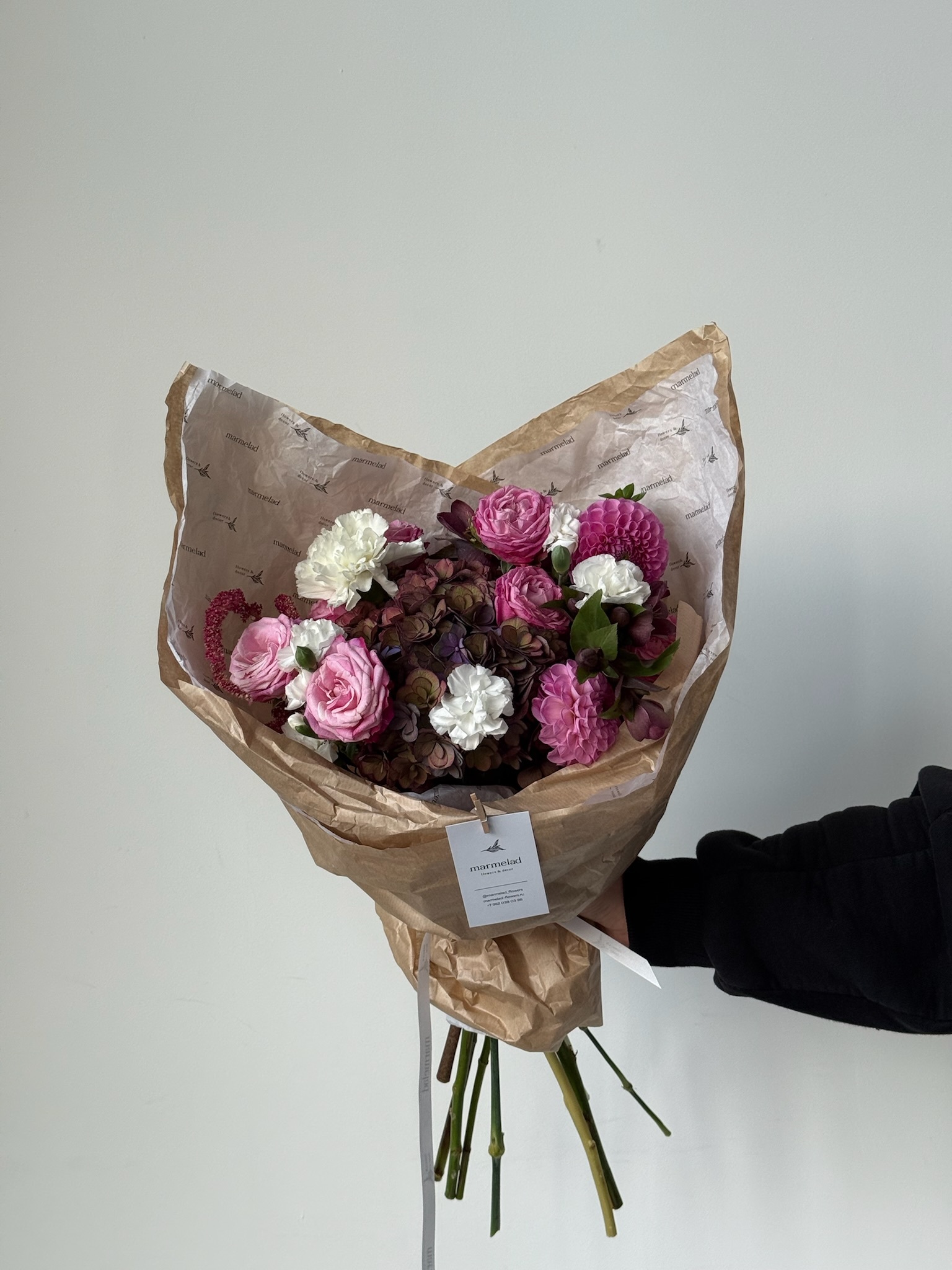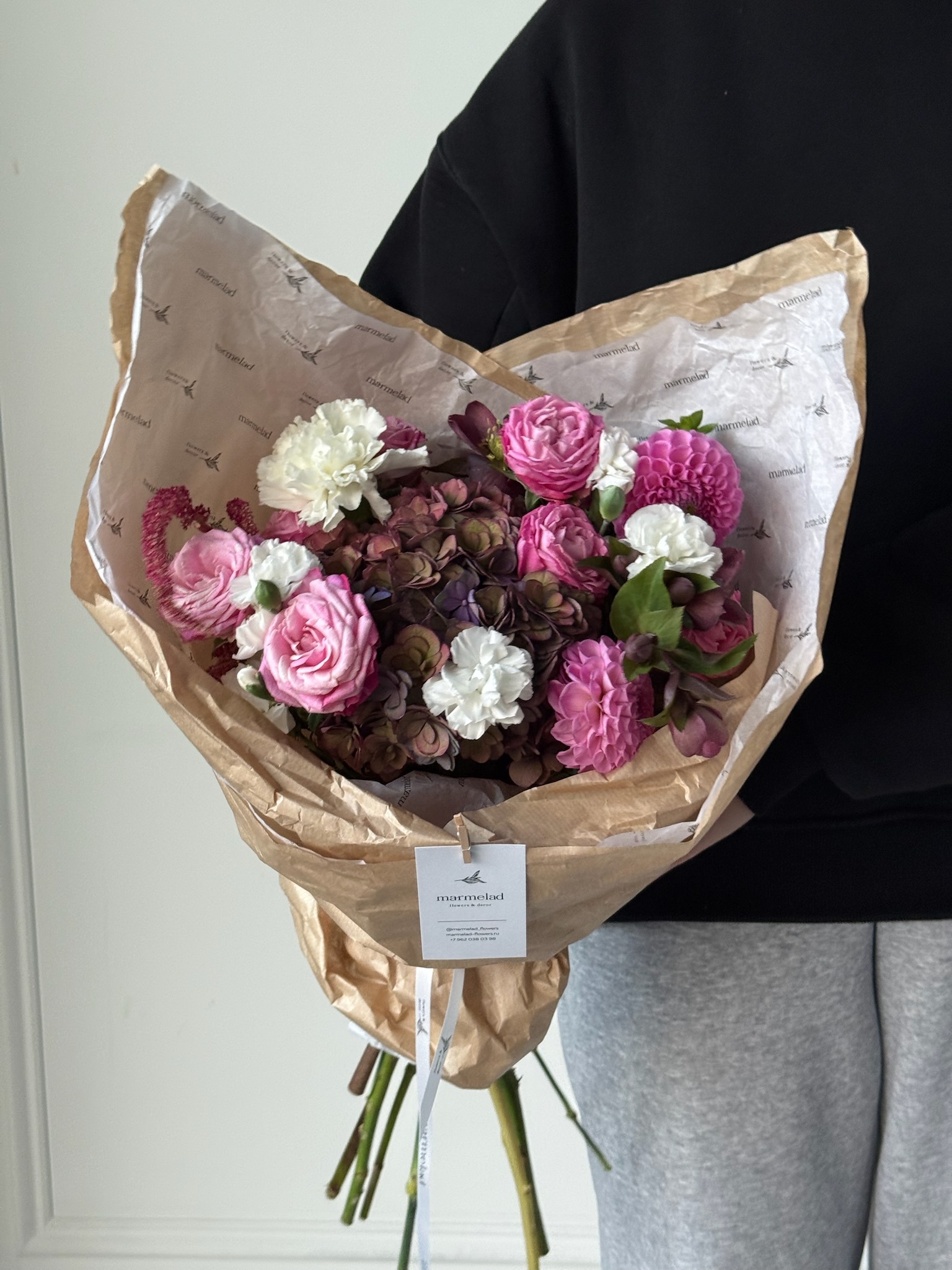 Букет из кустовых пионовидных роз, гортензии, георгин, кустовых диантусов и хелеборуса