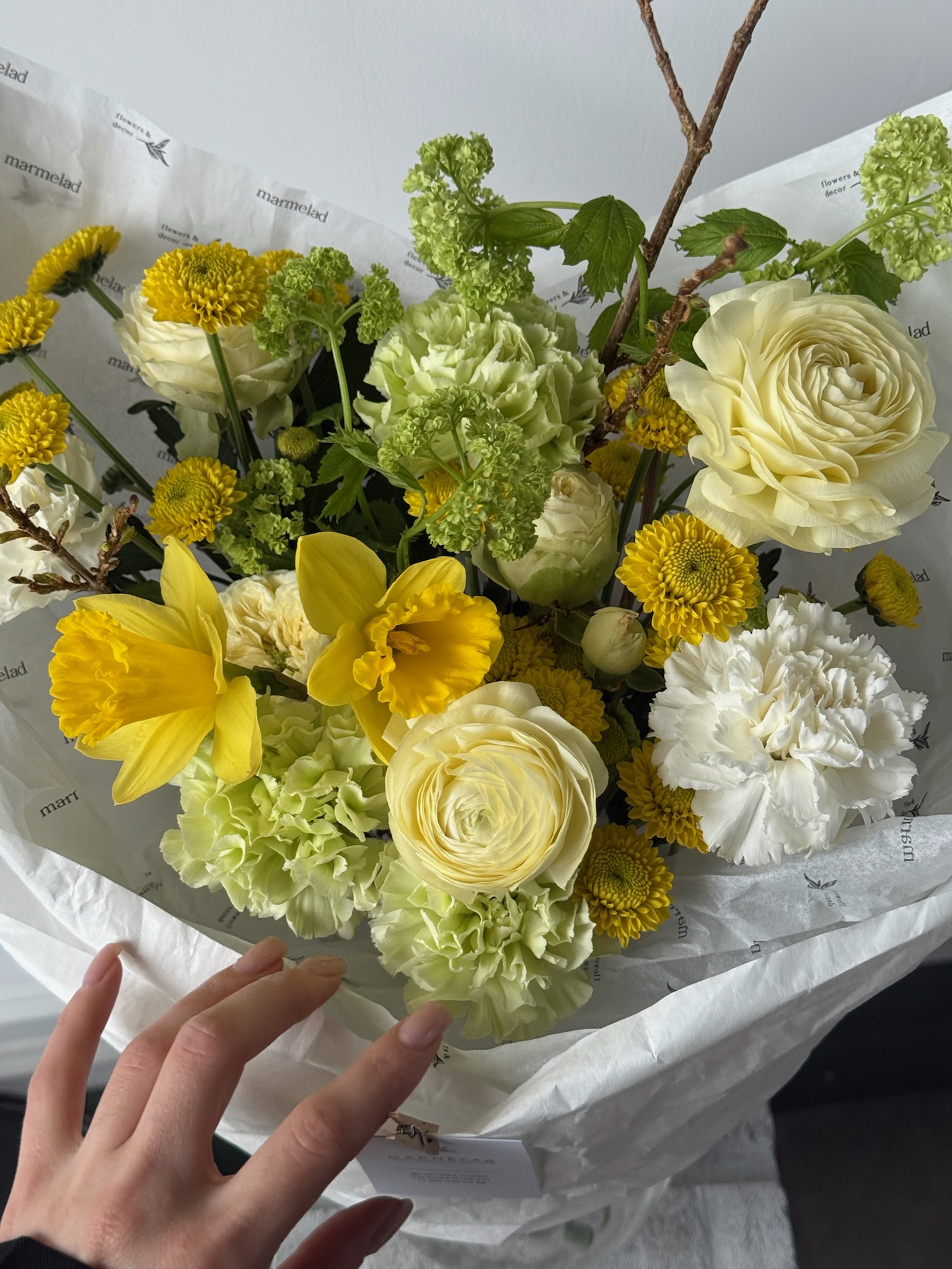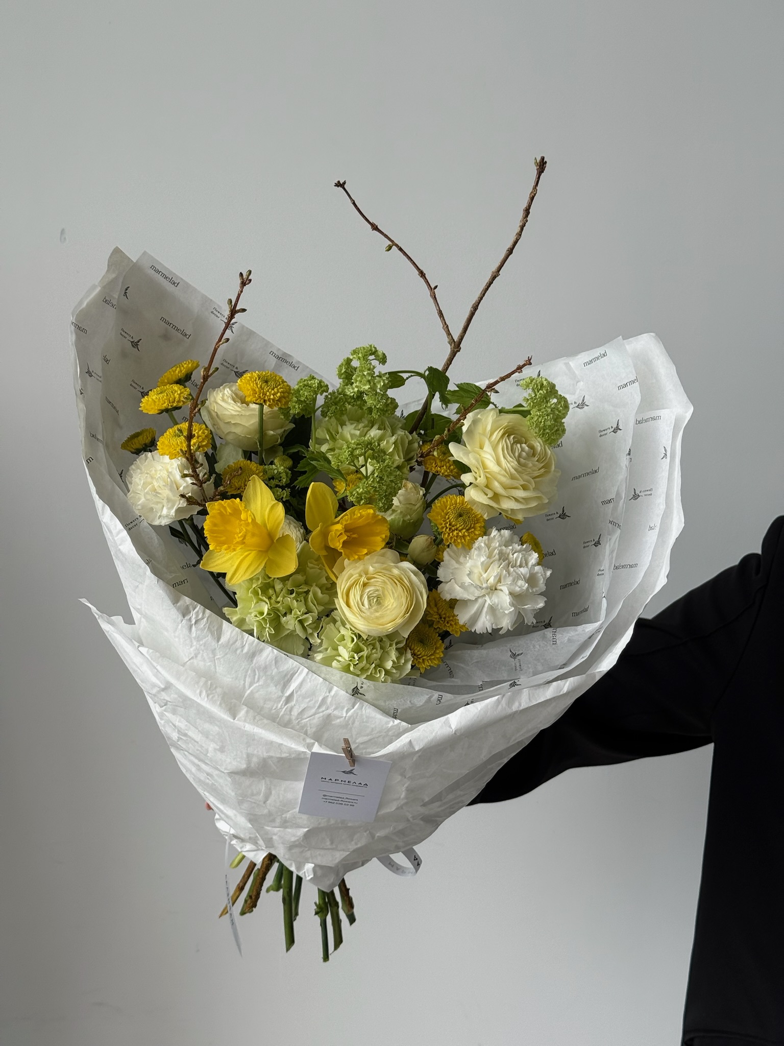 Букет из кустовых пионовидных роз, ранункулюсов, нарциссов, вибурнума и форзиции