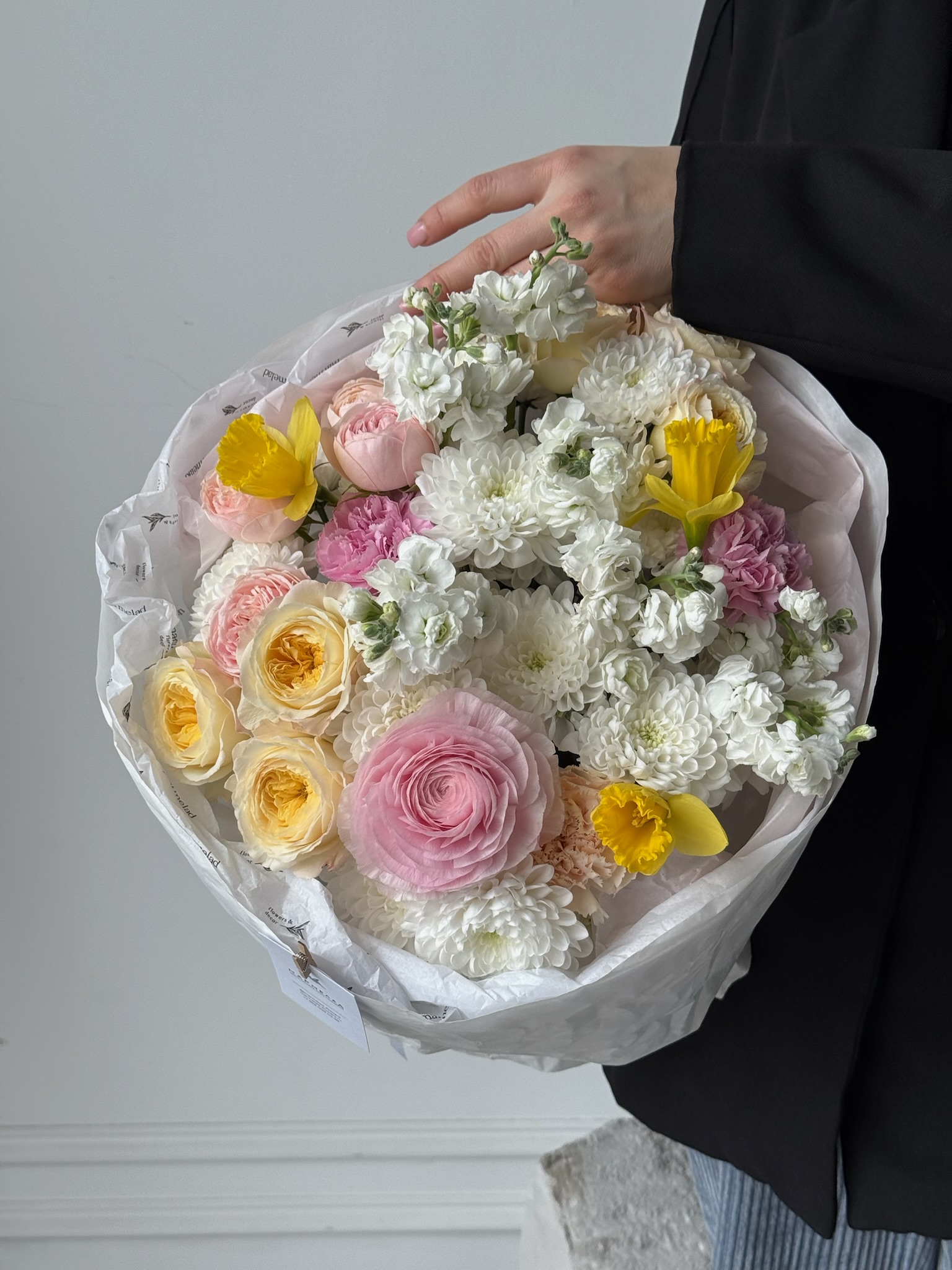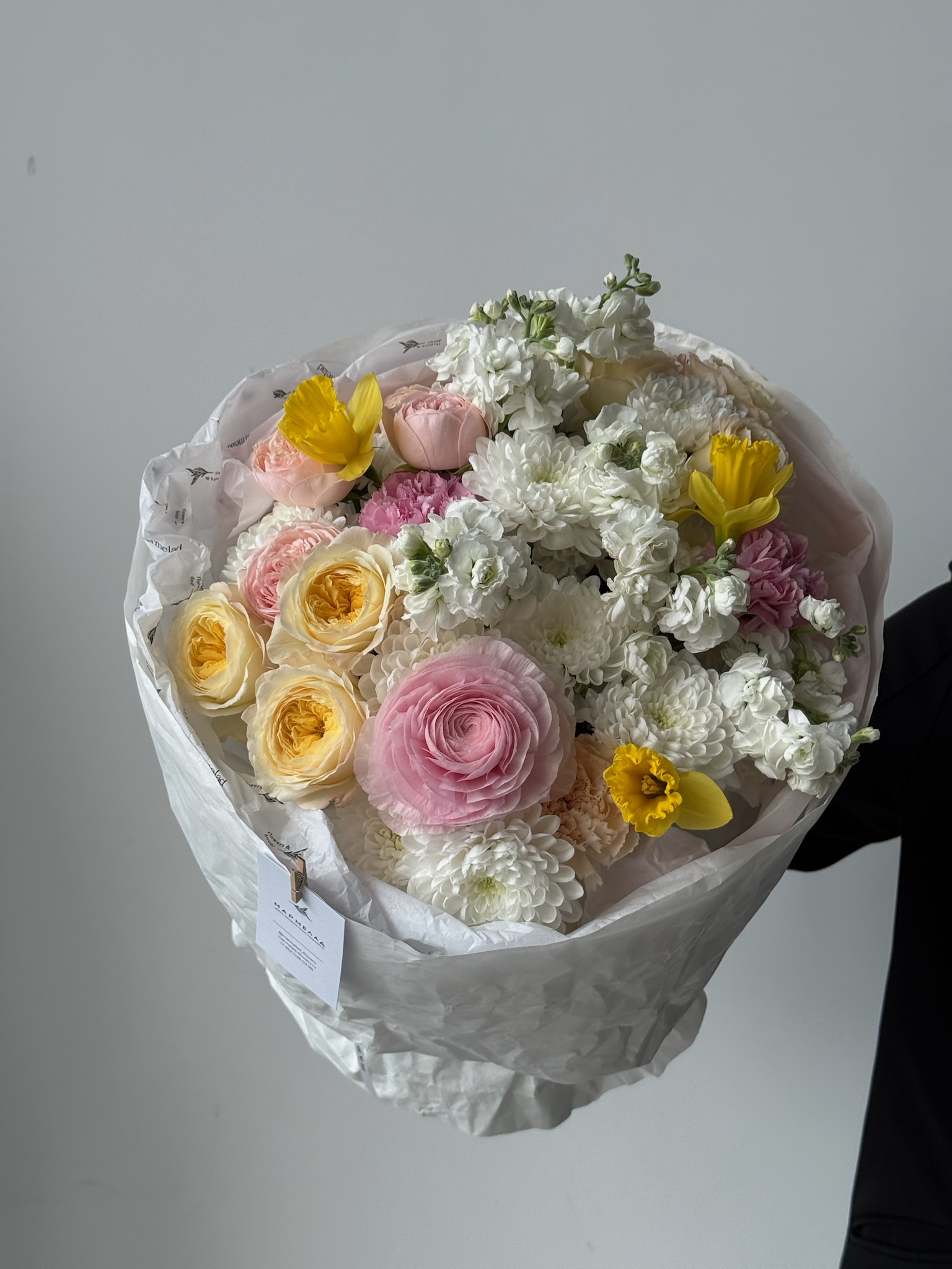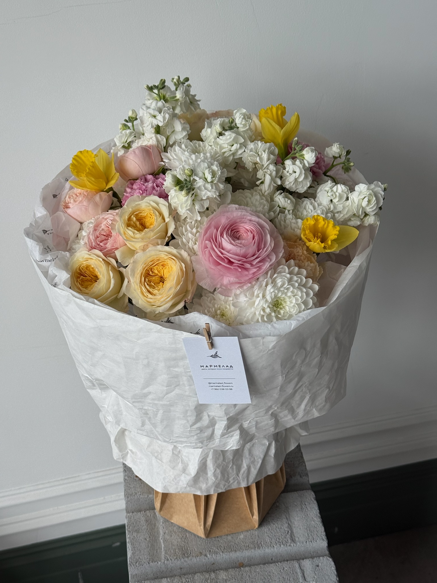 Букет из кустовых пионовидных роз, хризантемы, диантусов, ранункулюсов и маттиолы