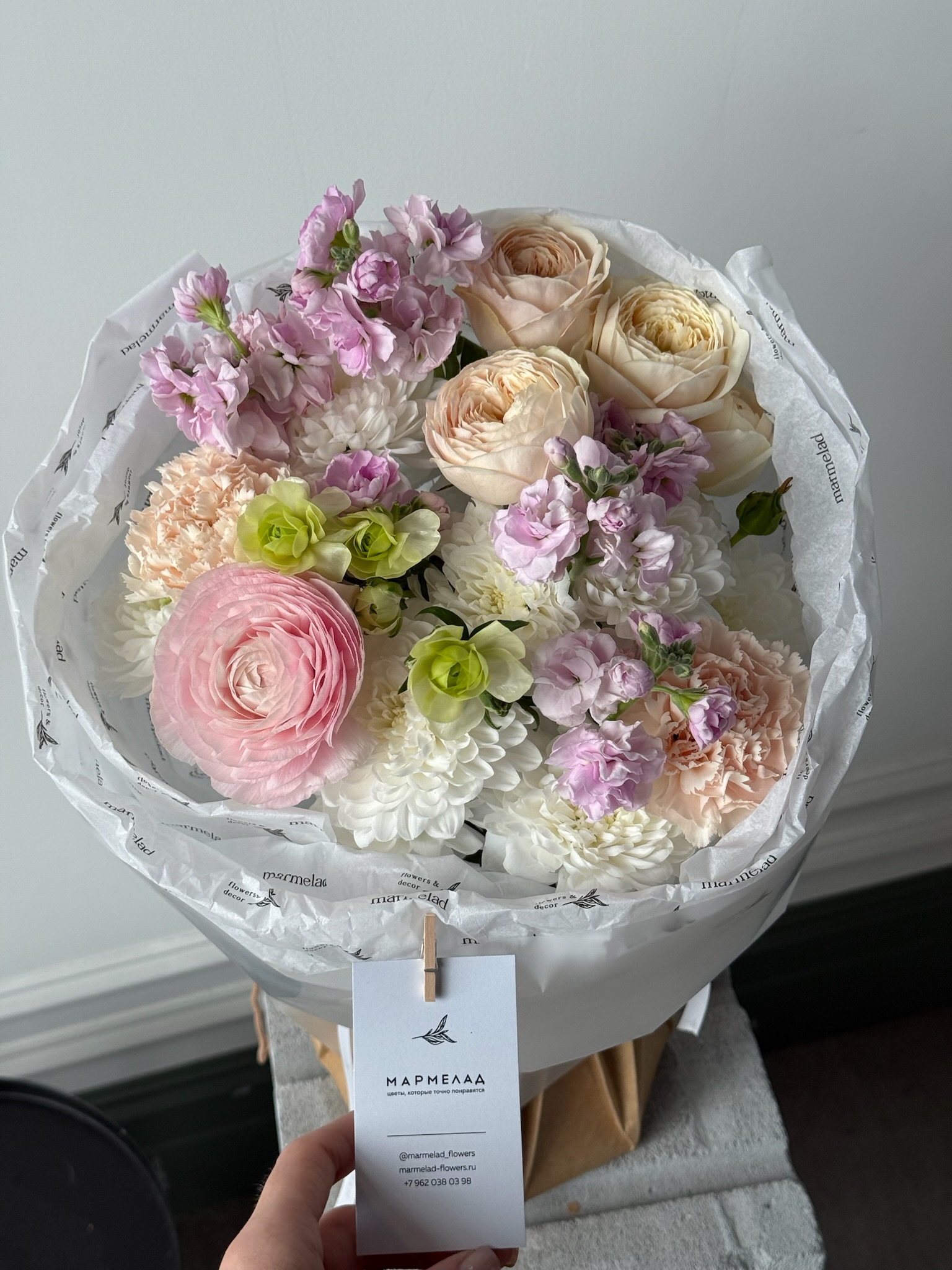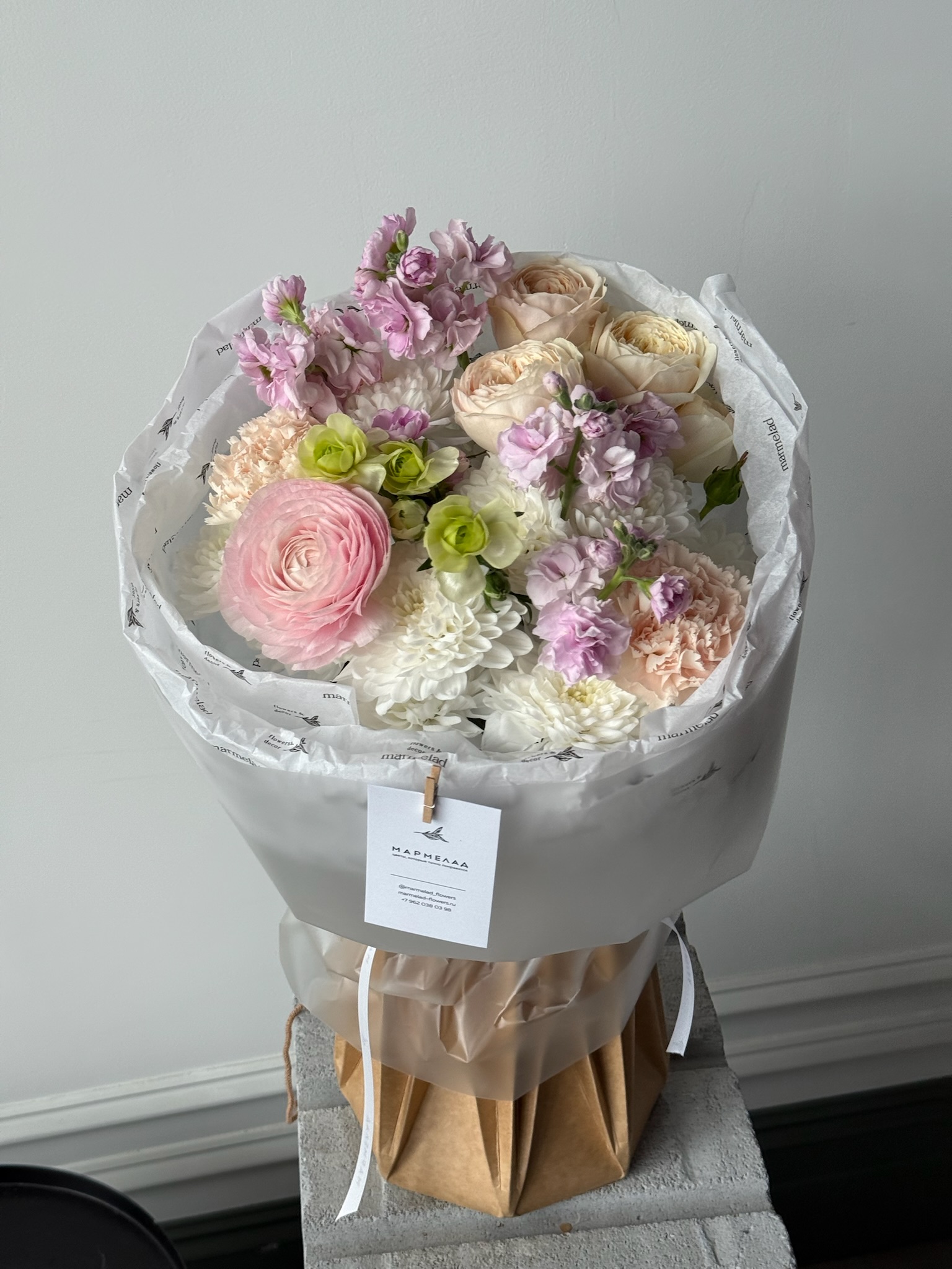 Букет из кустовых пионовидных роз, хризантемы, ранункулюсов и маттиолы