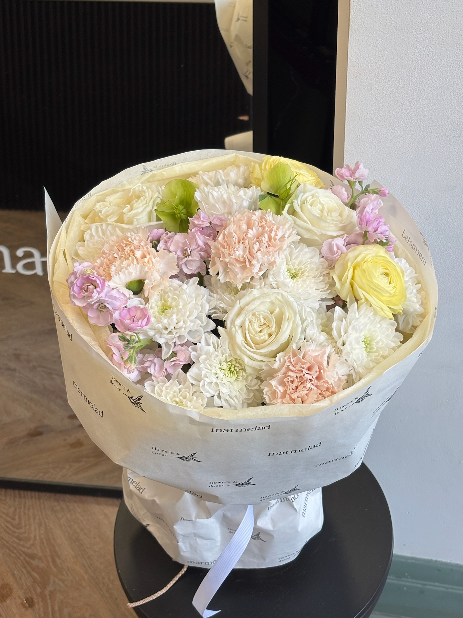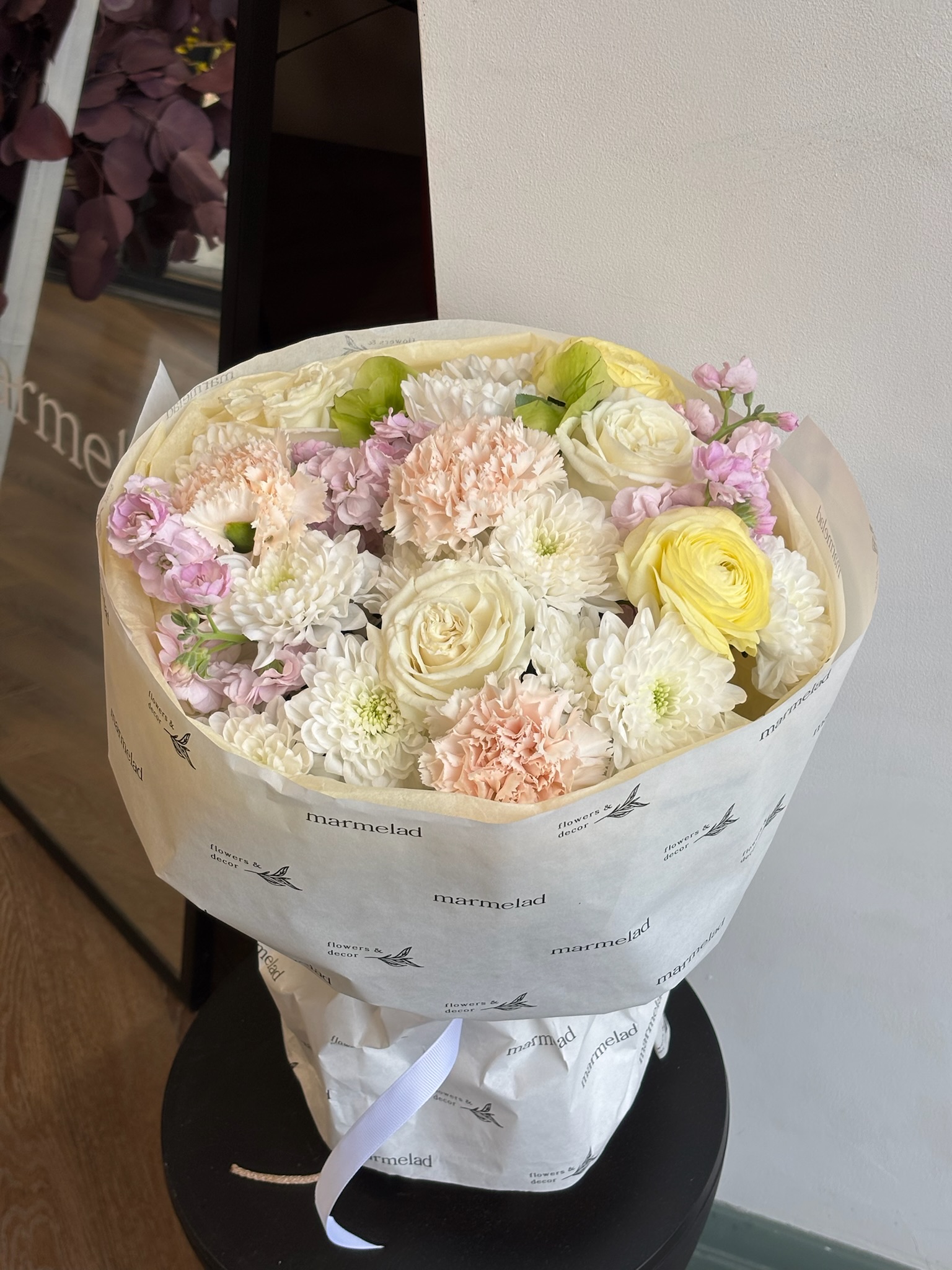 Букет из хризантемы, диантусов, ранункулюсов, хелеборуса и маттиолы