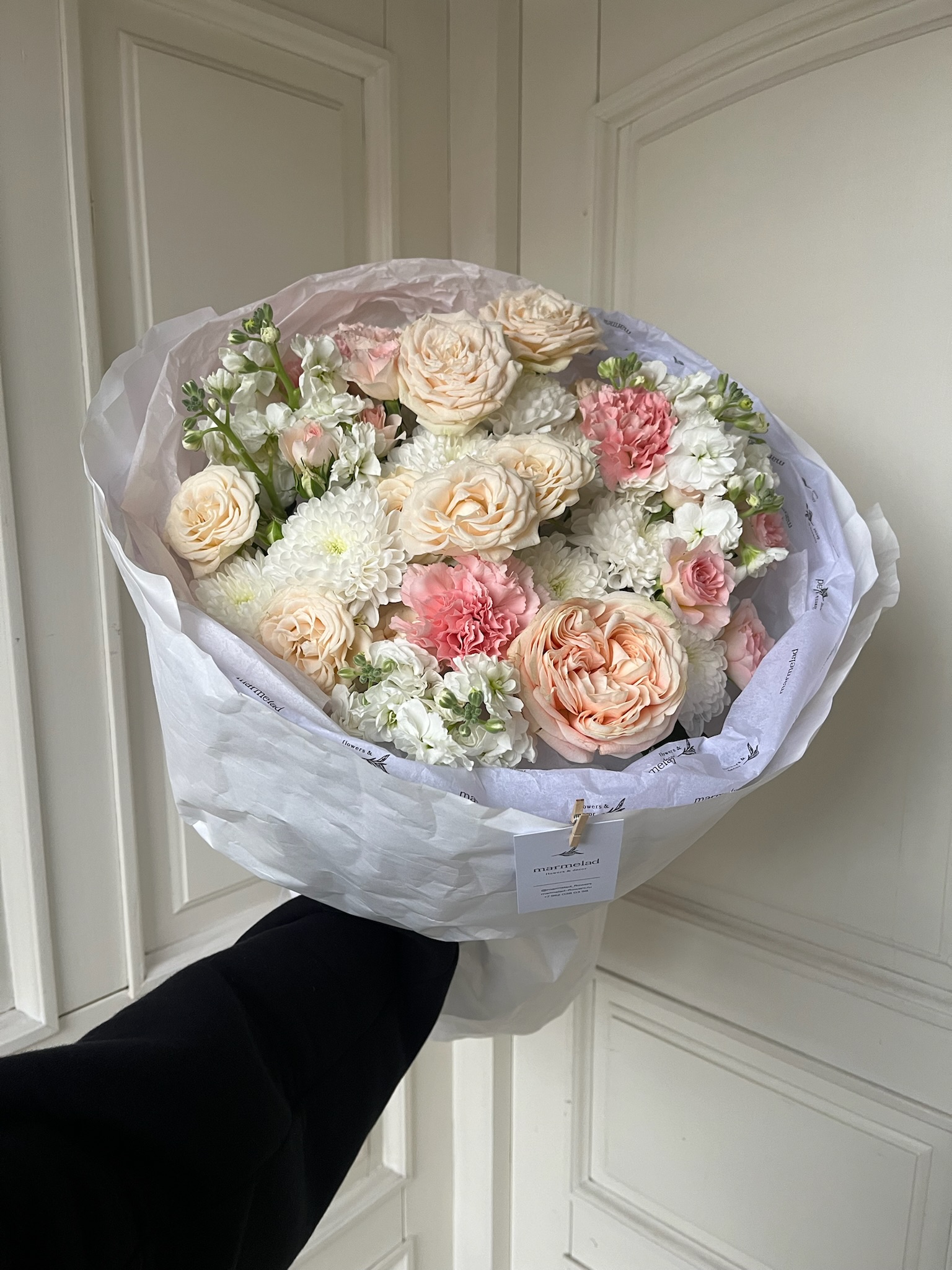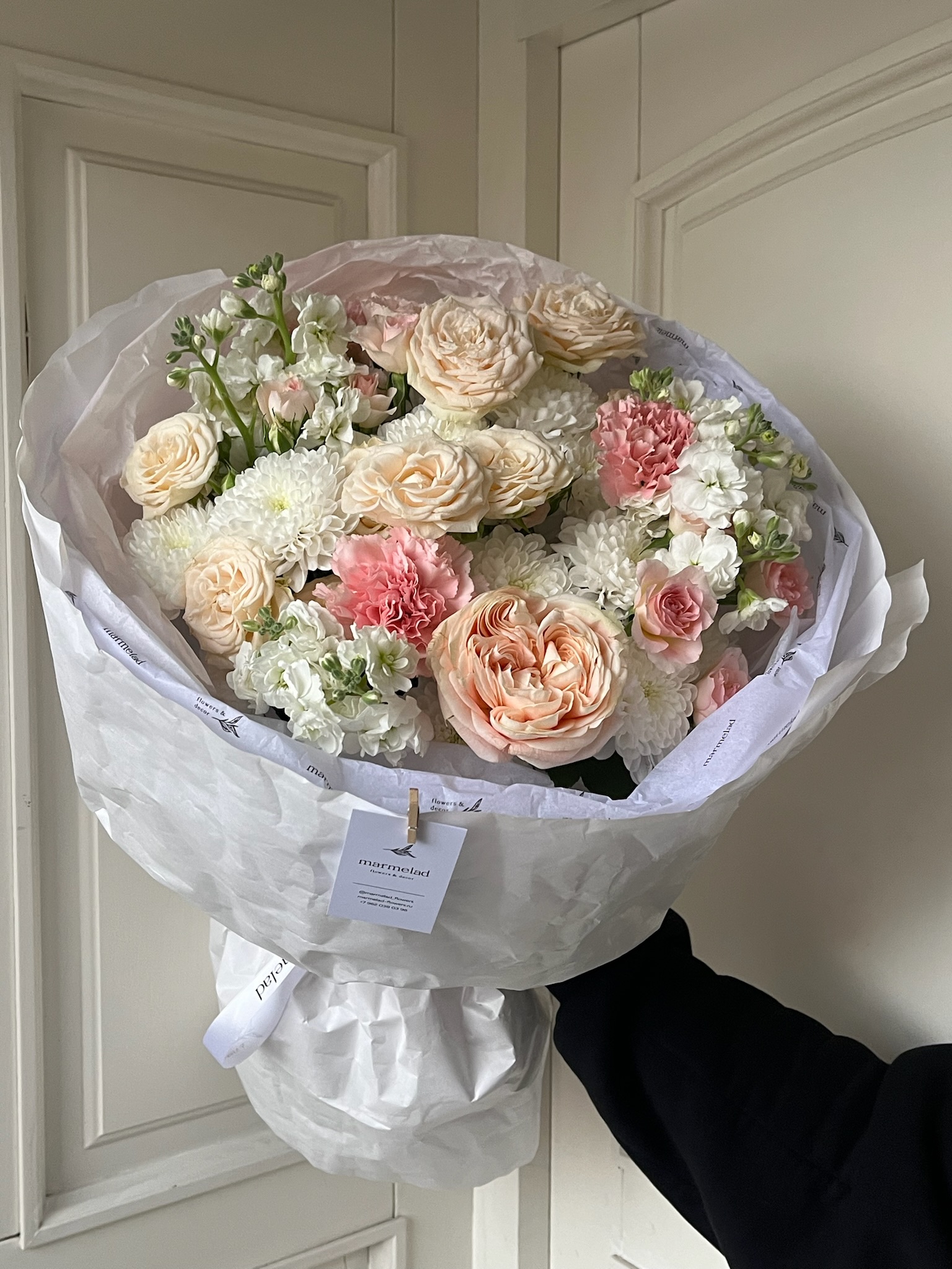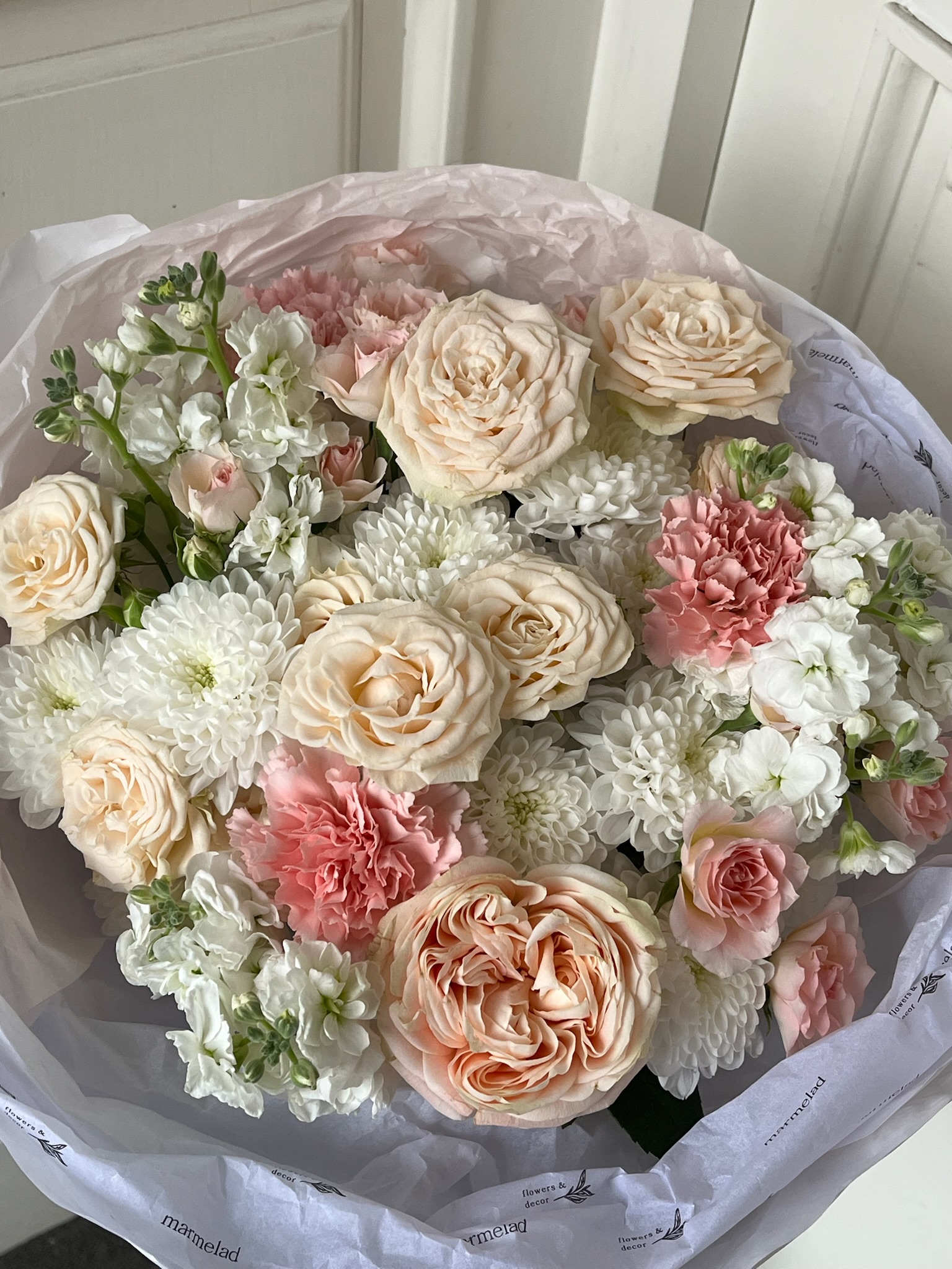 Букет из кустовых пионовидных роз, маттиолы, диантусов и хризантемы