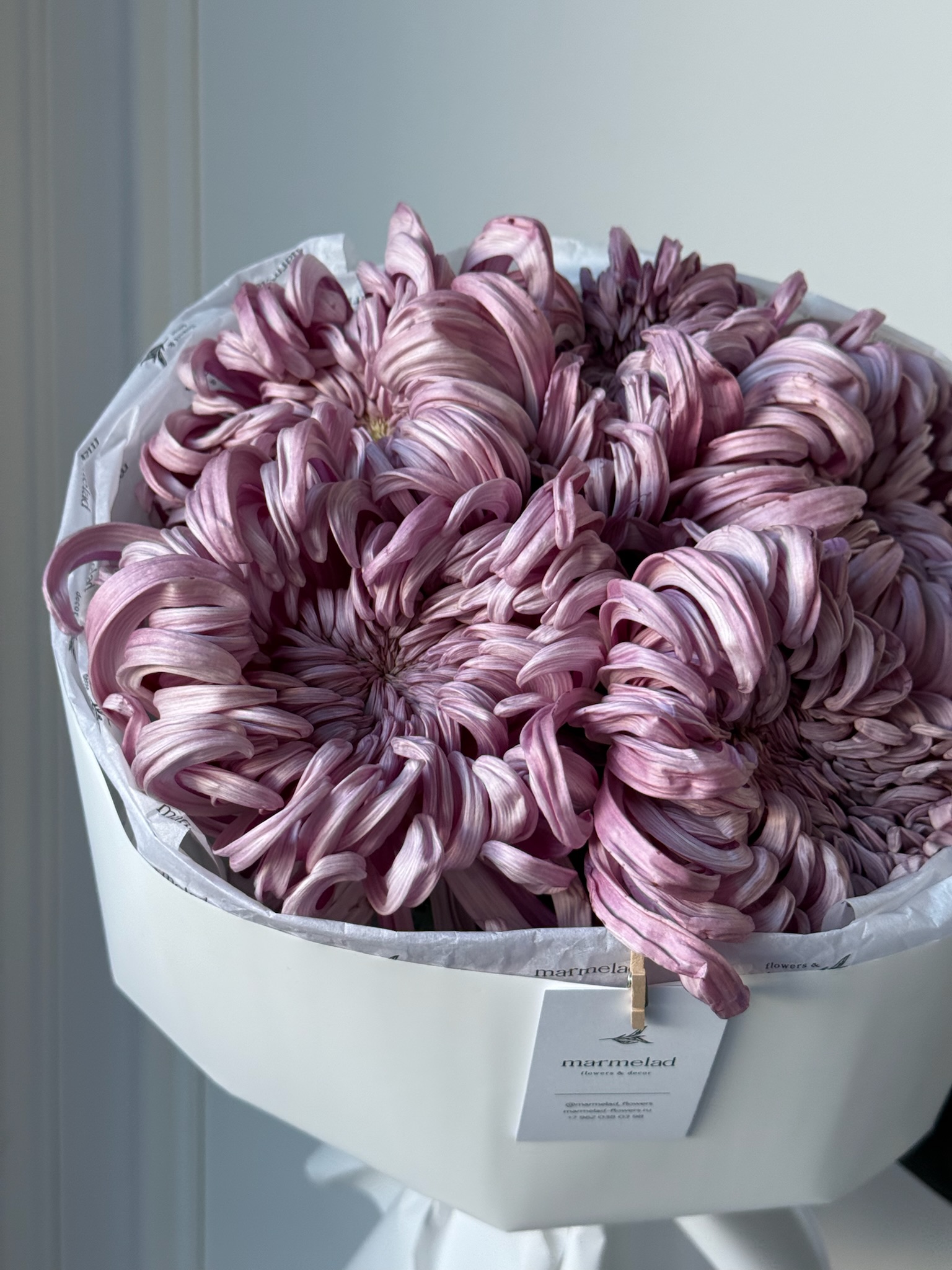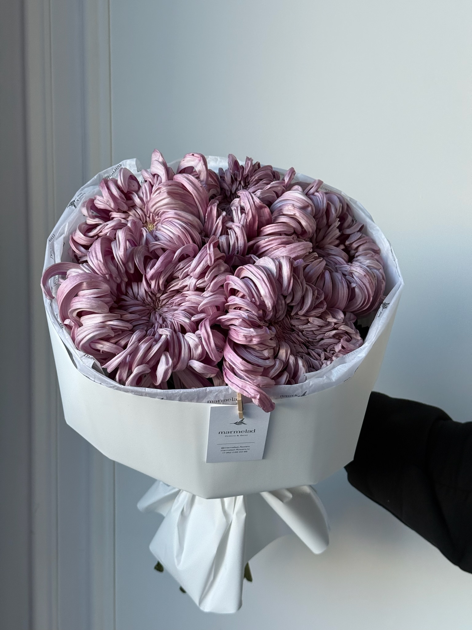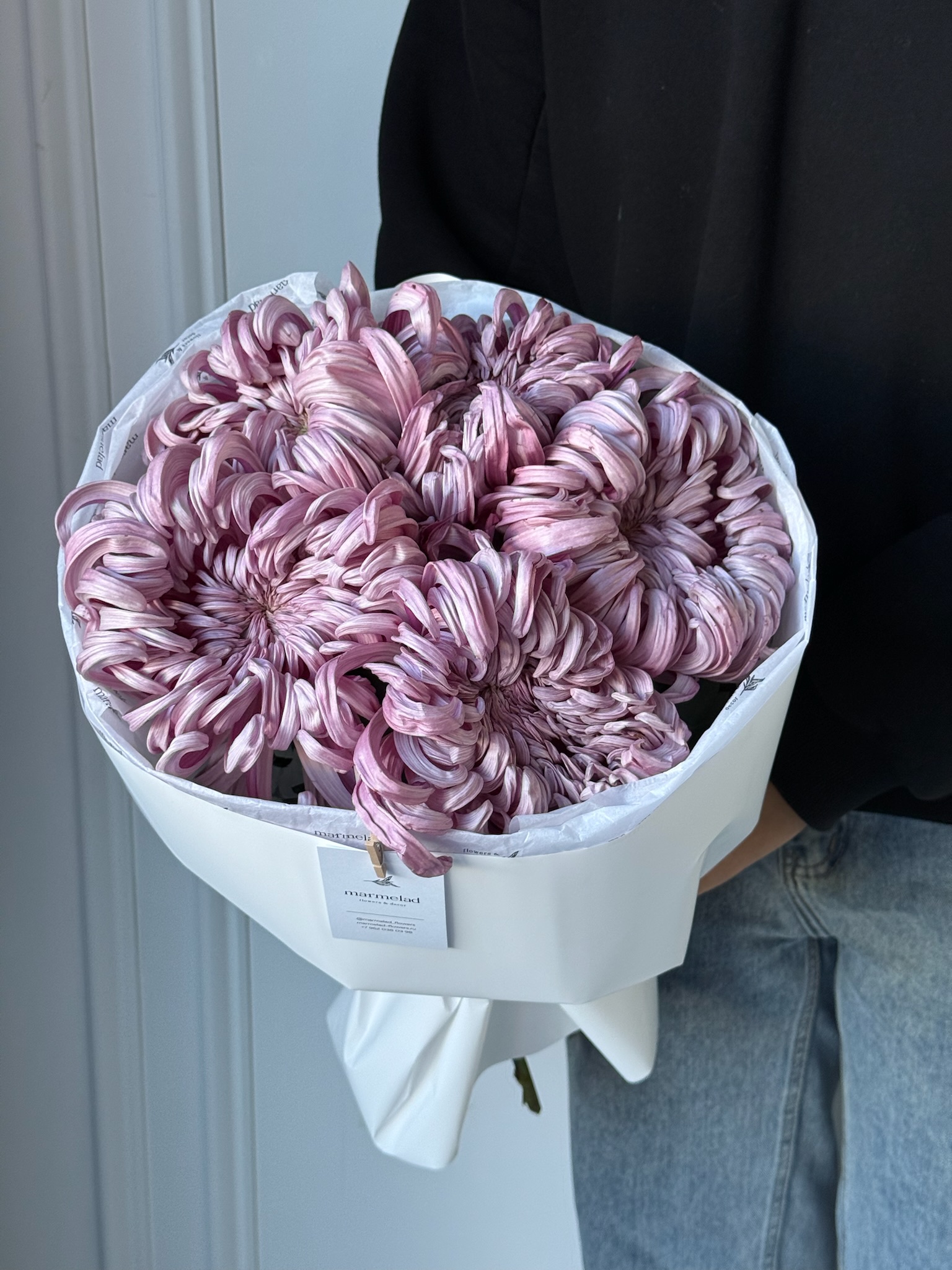 Моно букет из одноголовой кудрявой хризантемы в розовом оттенке