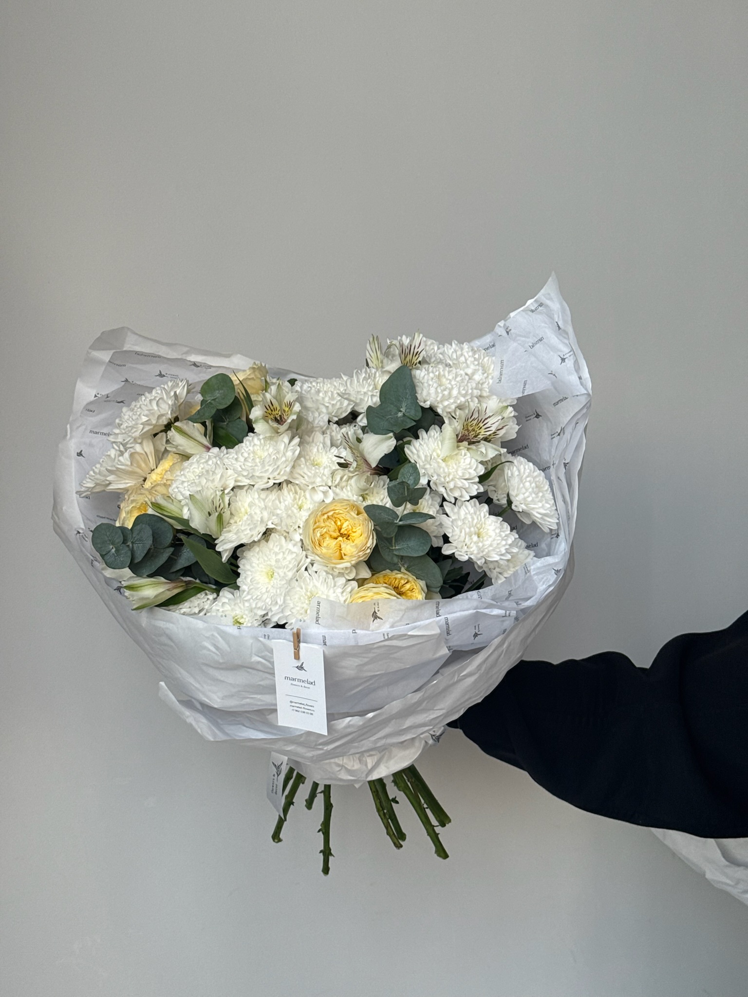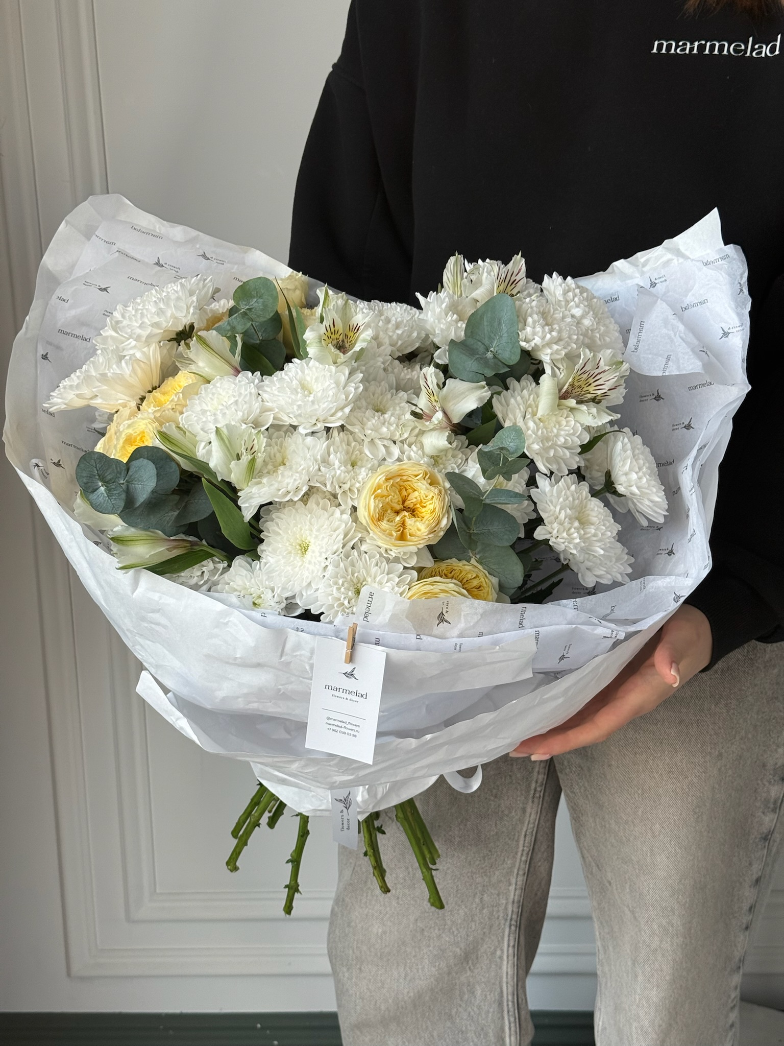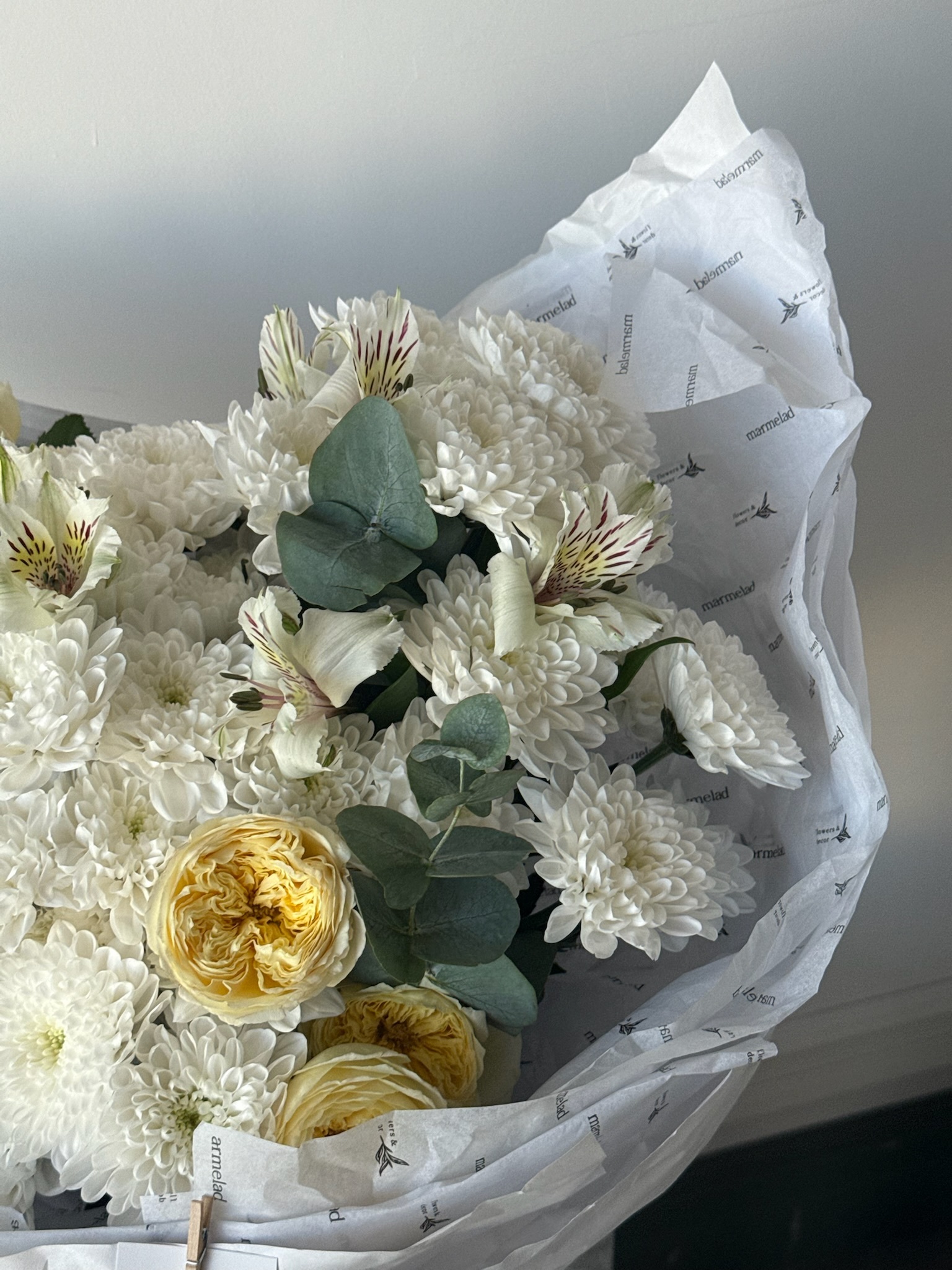 Букет из кустовых пионовивидных роз, хризантемы, альстромерии и эвкалипта