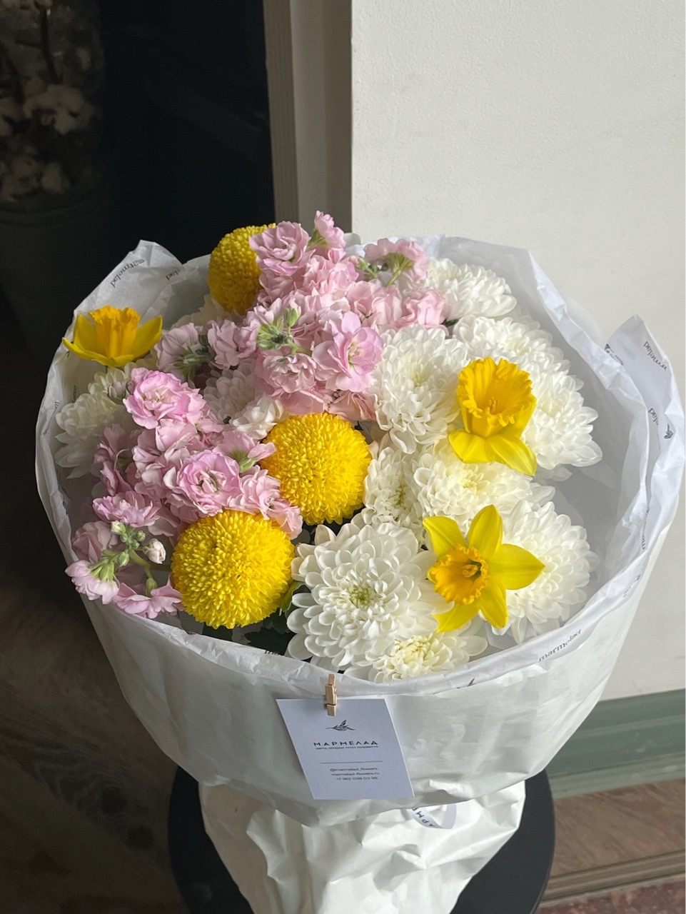 Букет из хризантемы, нарциссов и маттиолы