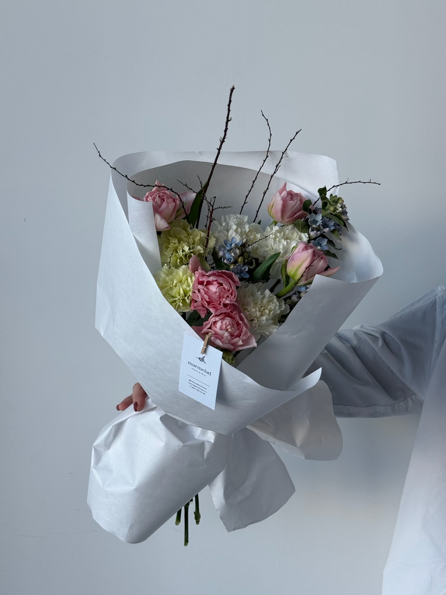 Букет из маттиолы, форзиции, тюльпанов, диантусов и оксипеталума