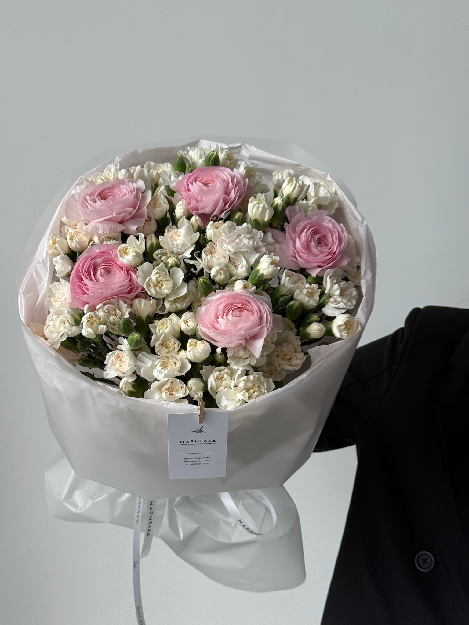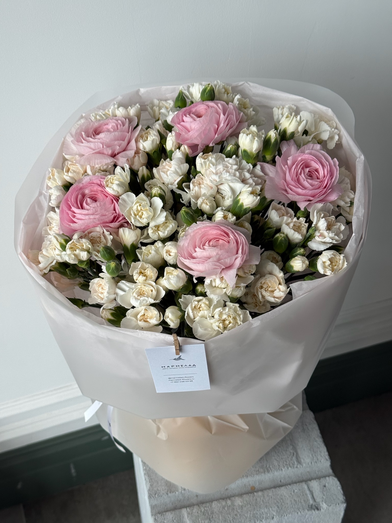 Букет из ранункулюсов и кустовых диантусов