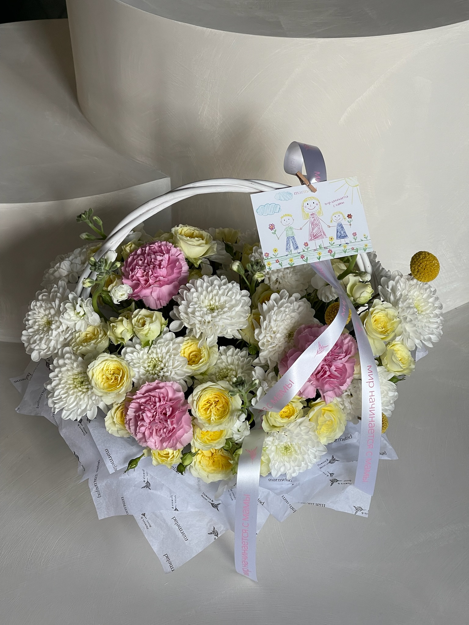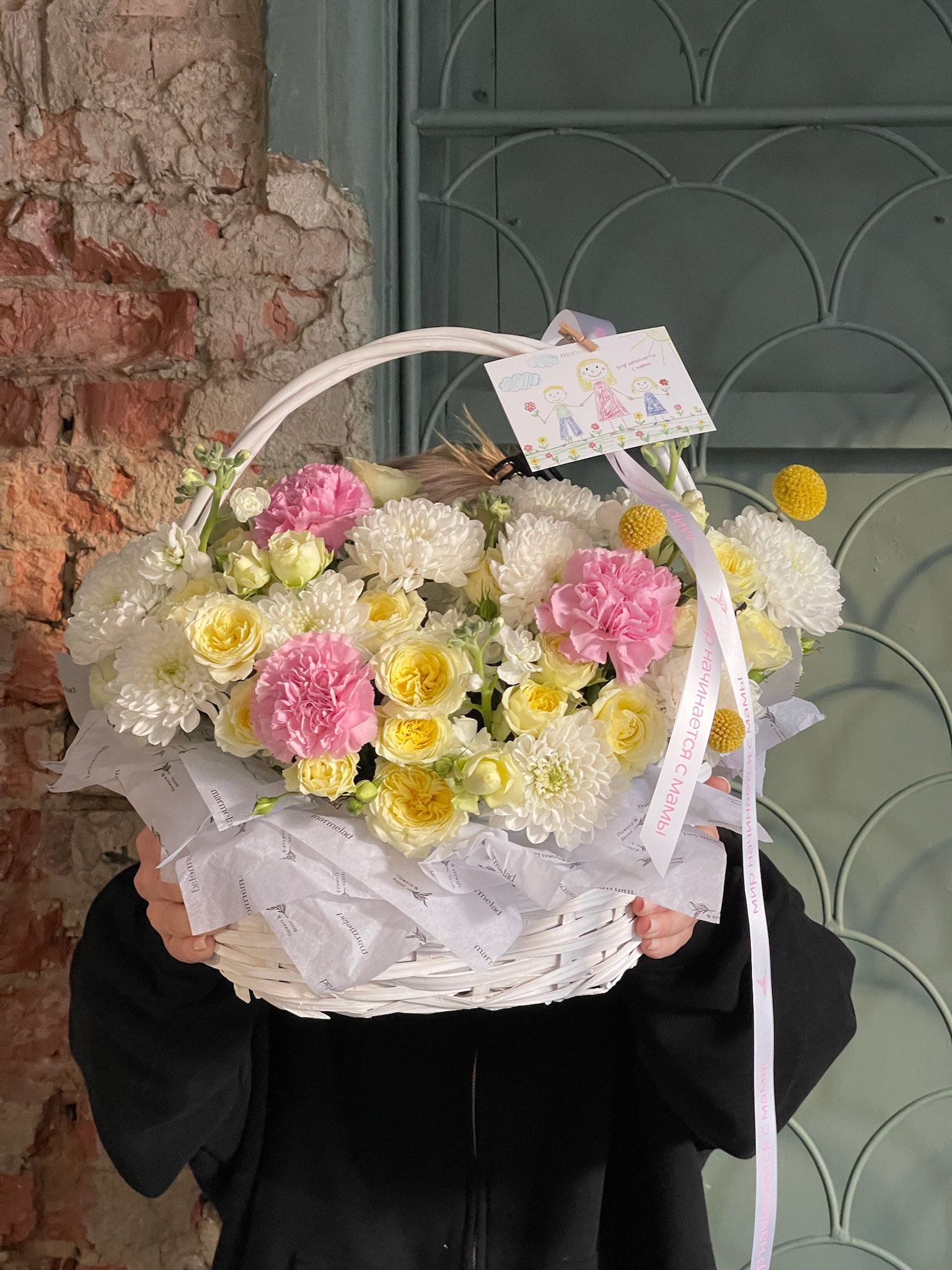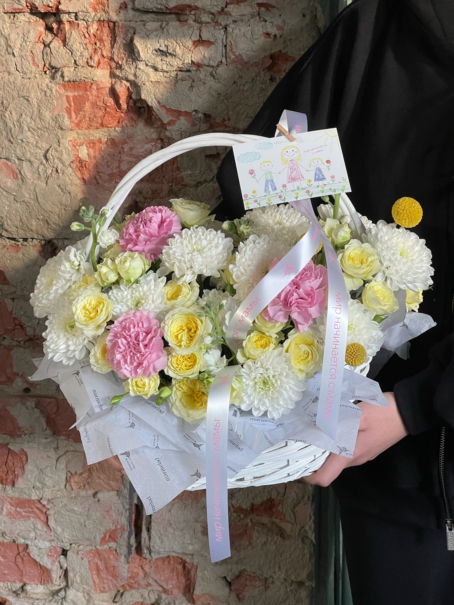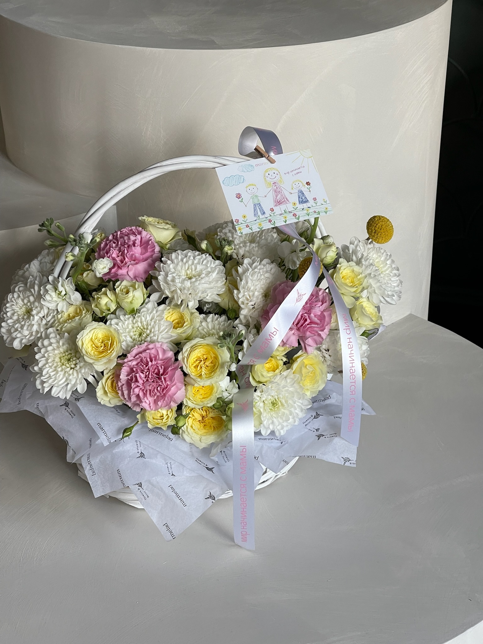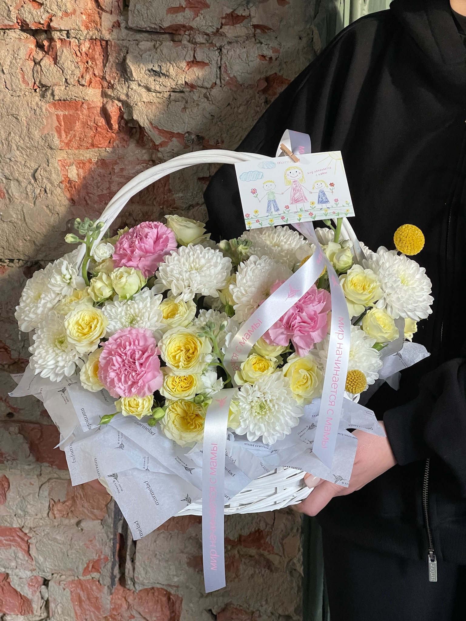 Корзина сборная из кустовой пионовидной розы, диантусов, хризантемы и маттиолы