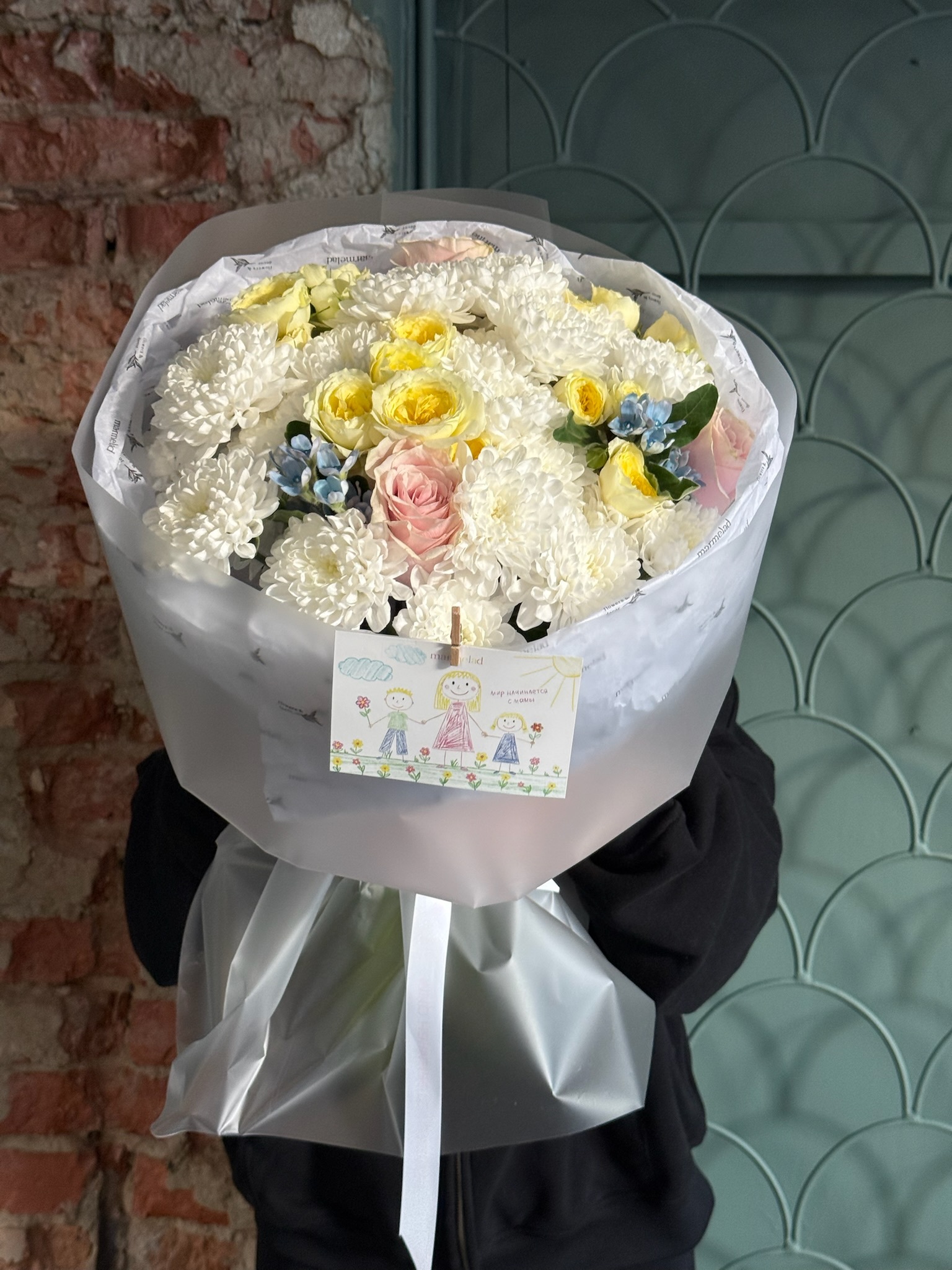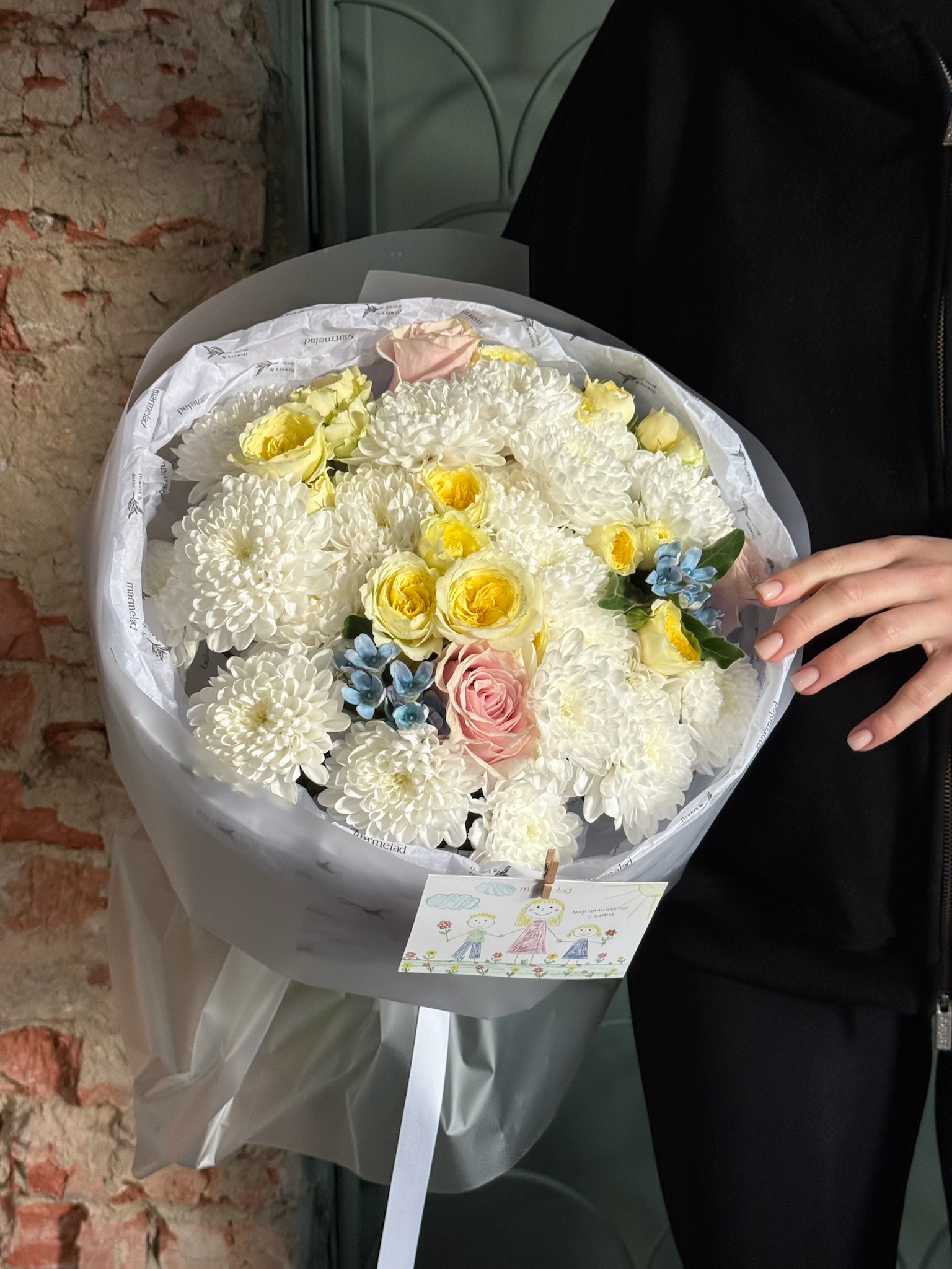 Букет из кустовых пионовидных роз, одноголовой розы, оксипеталума и хризантемы