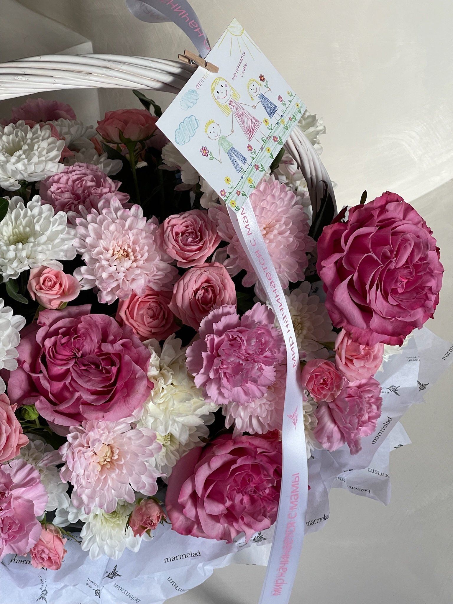 Корзина сборная из кустовых пионовидных роз, одноголовых роз, диантусов, хризантемы и оксипеталума