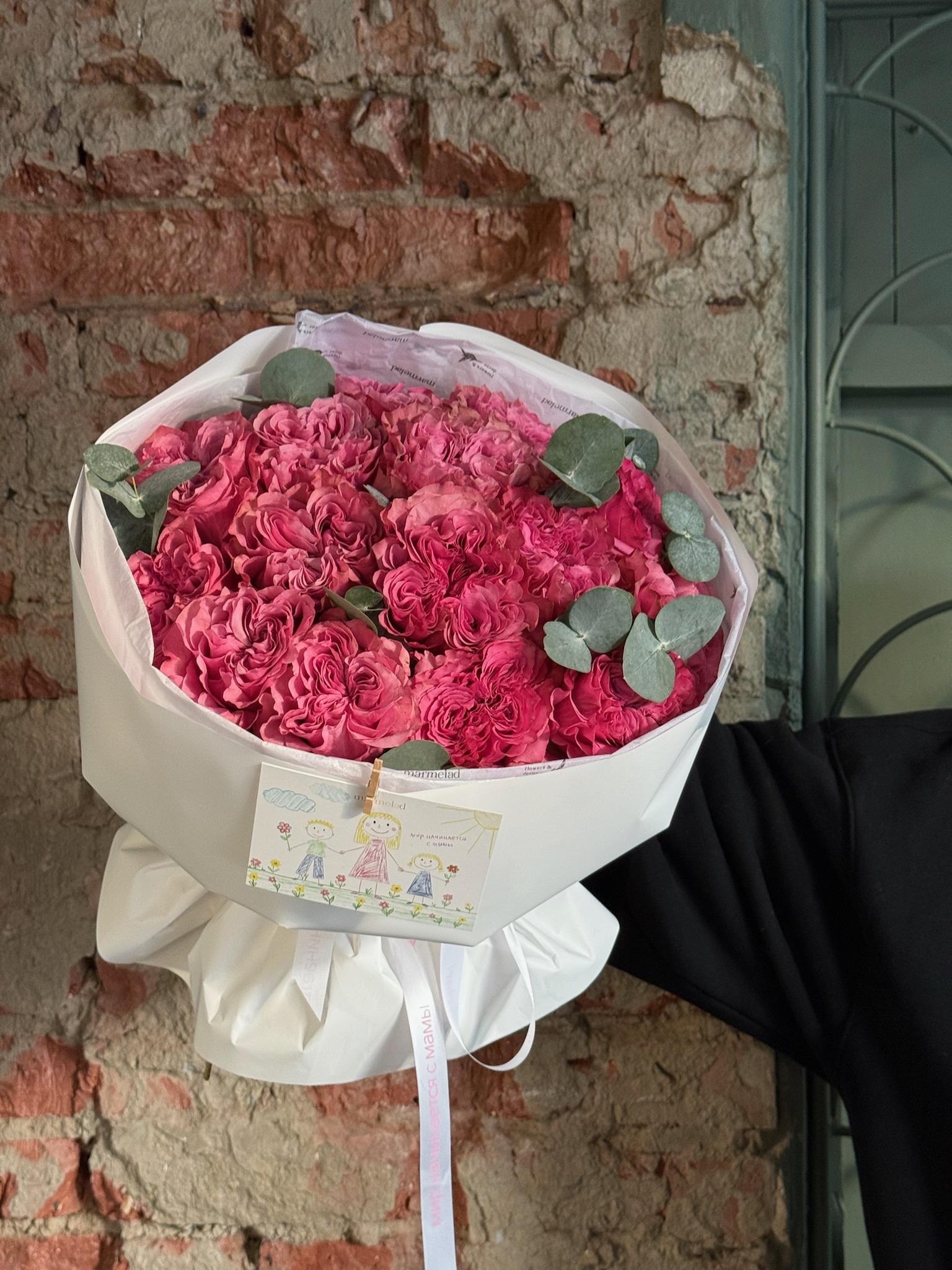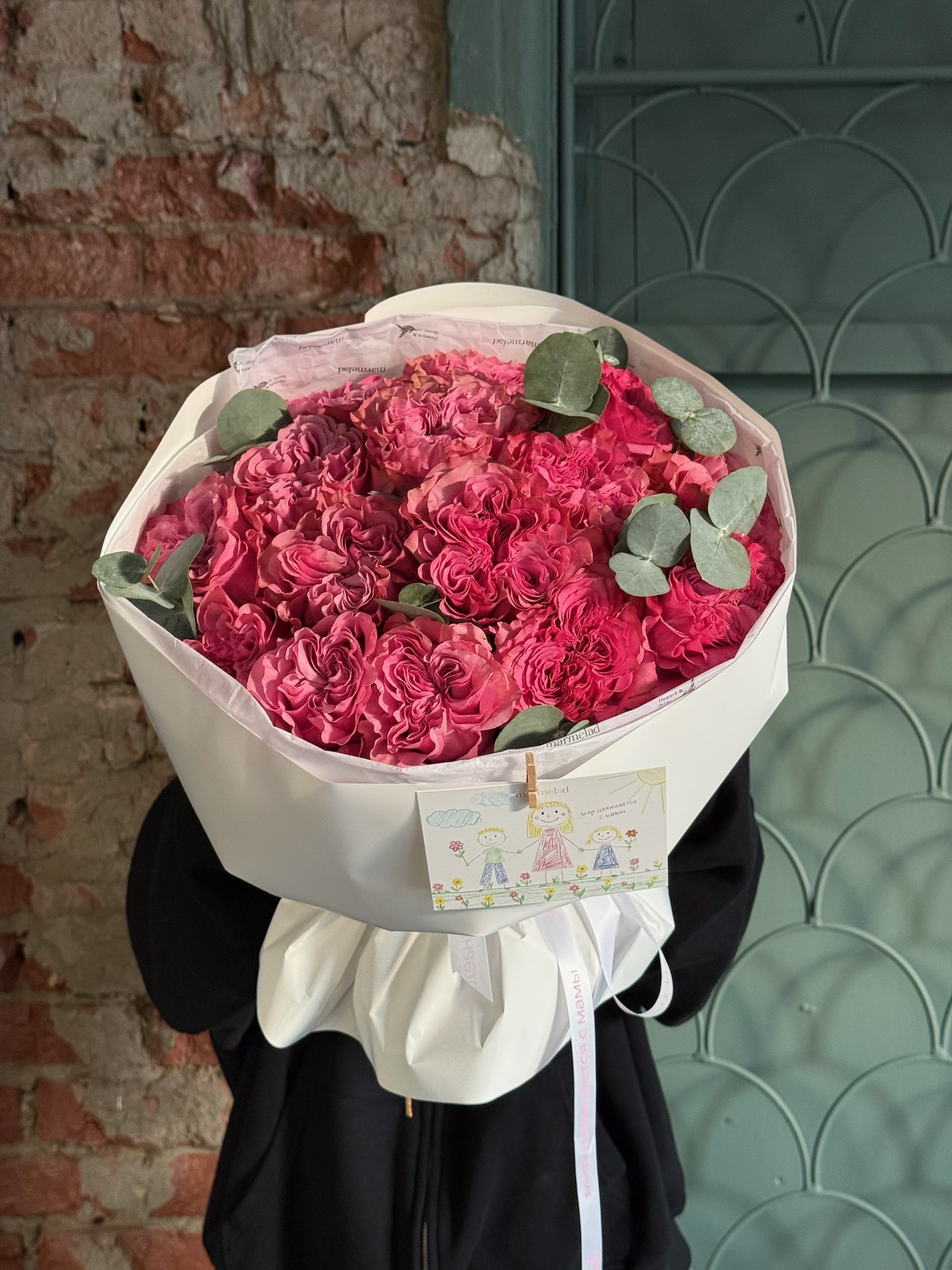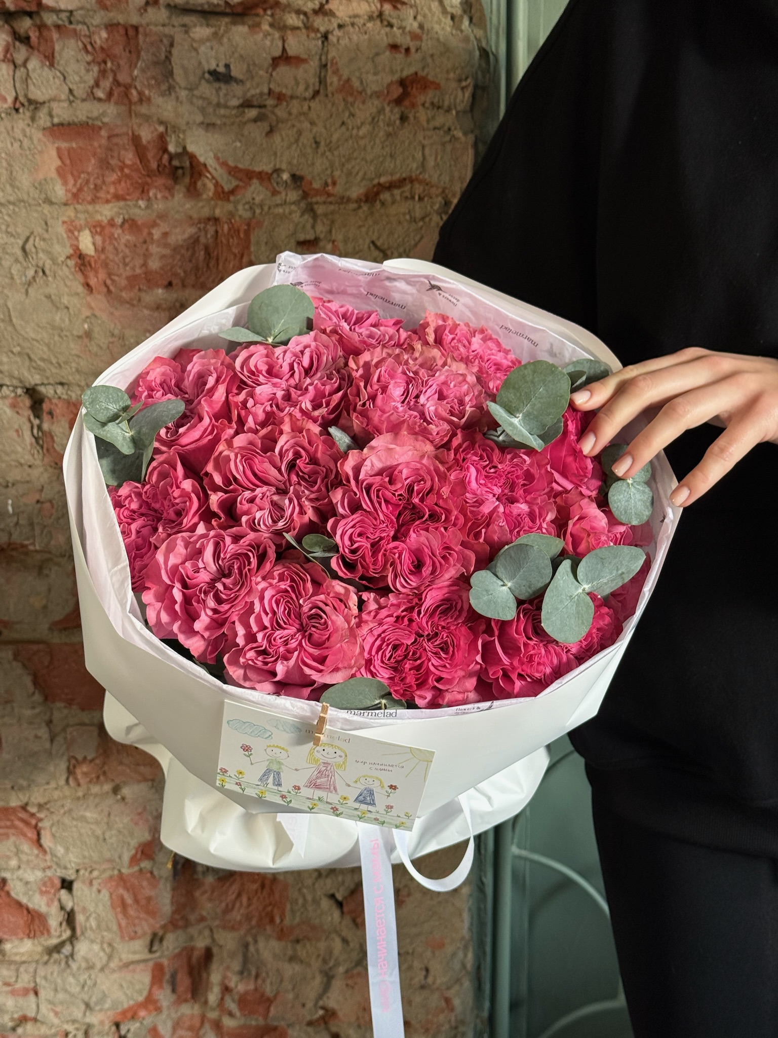 Букет из яркой одноголовой розы и эвкалипта 15 шт
