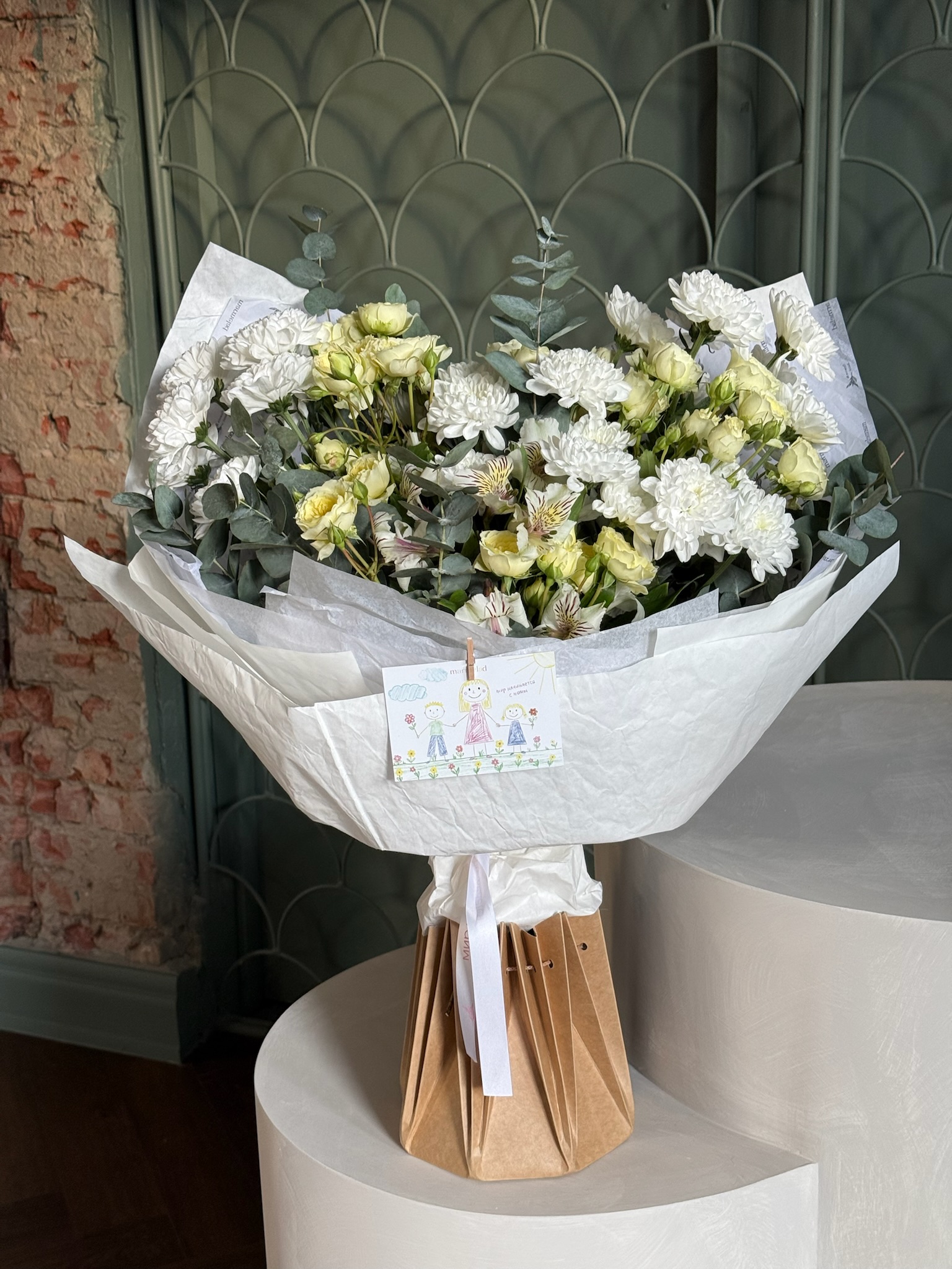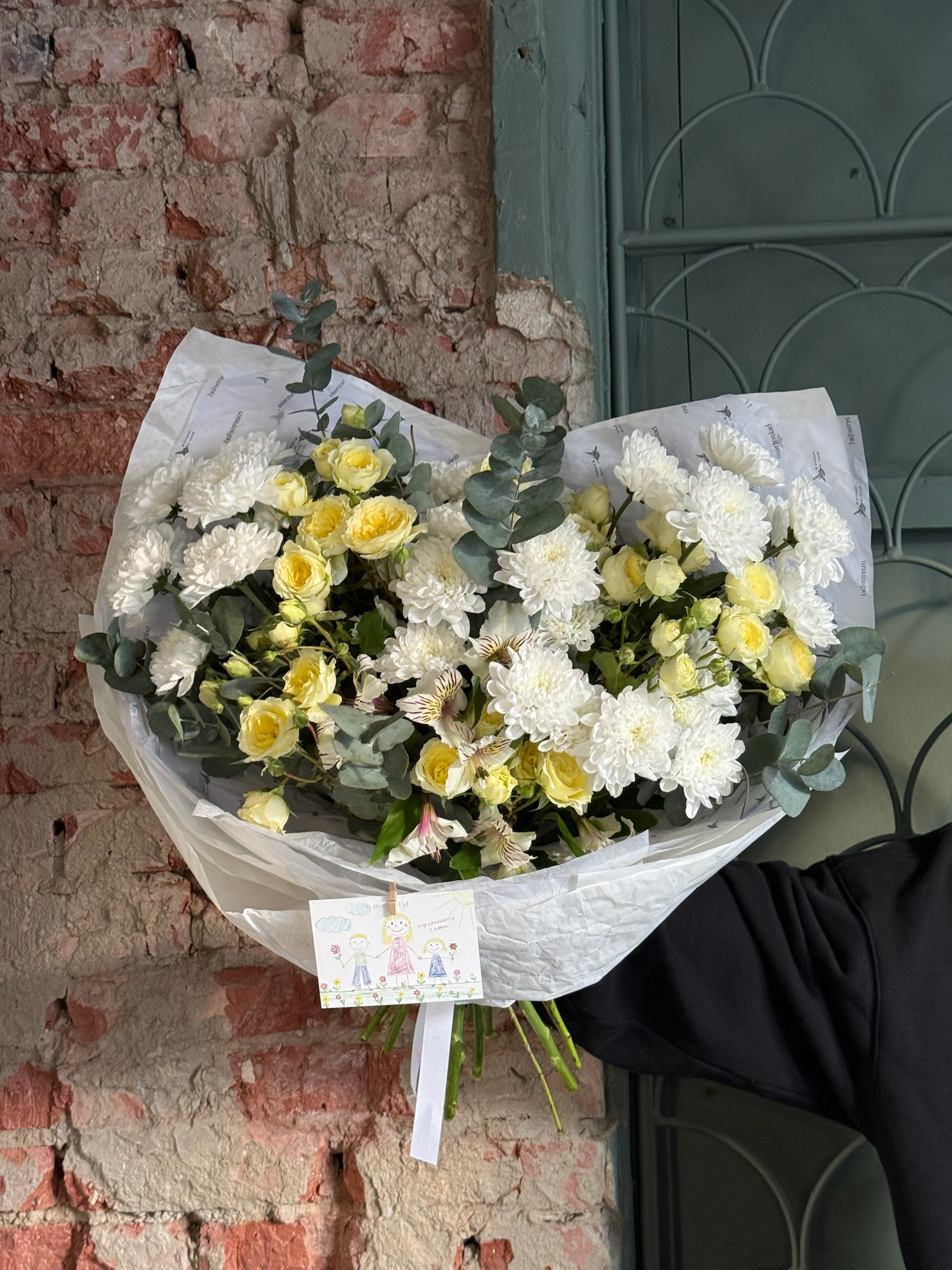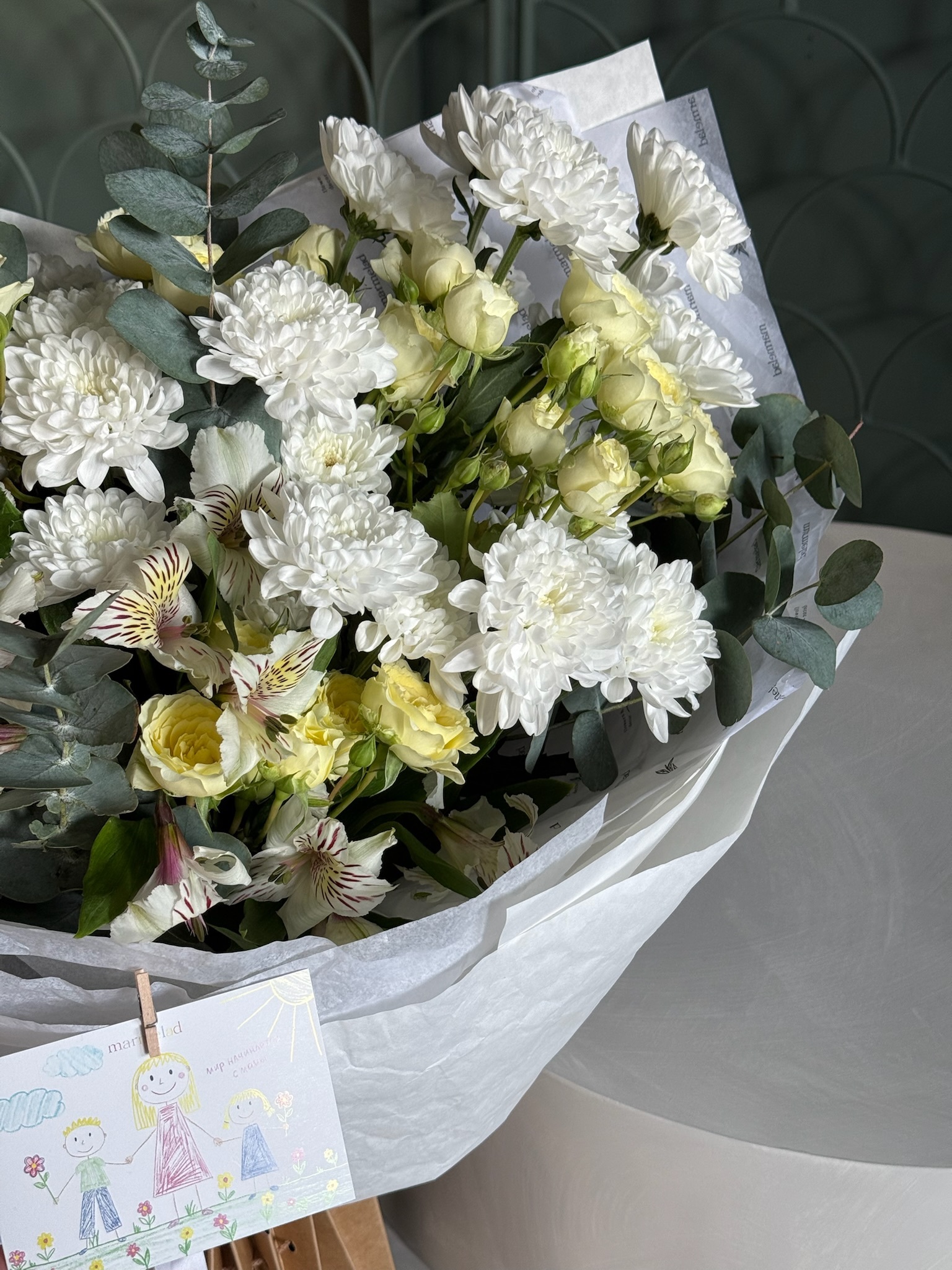 Букет из кустовой пионовидной розы, альстромерии, эвкалипта и хризантемы