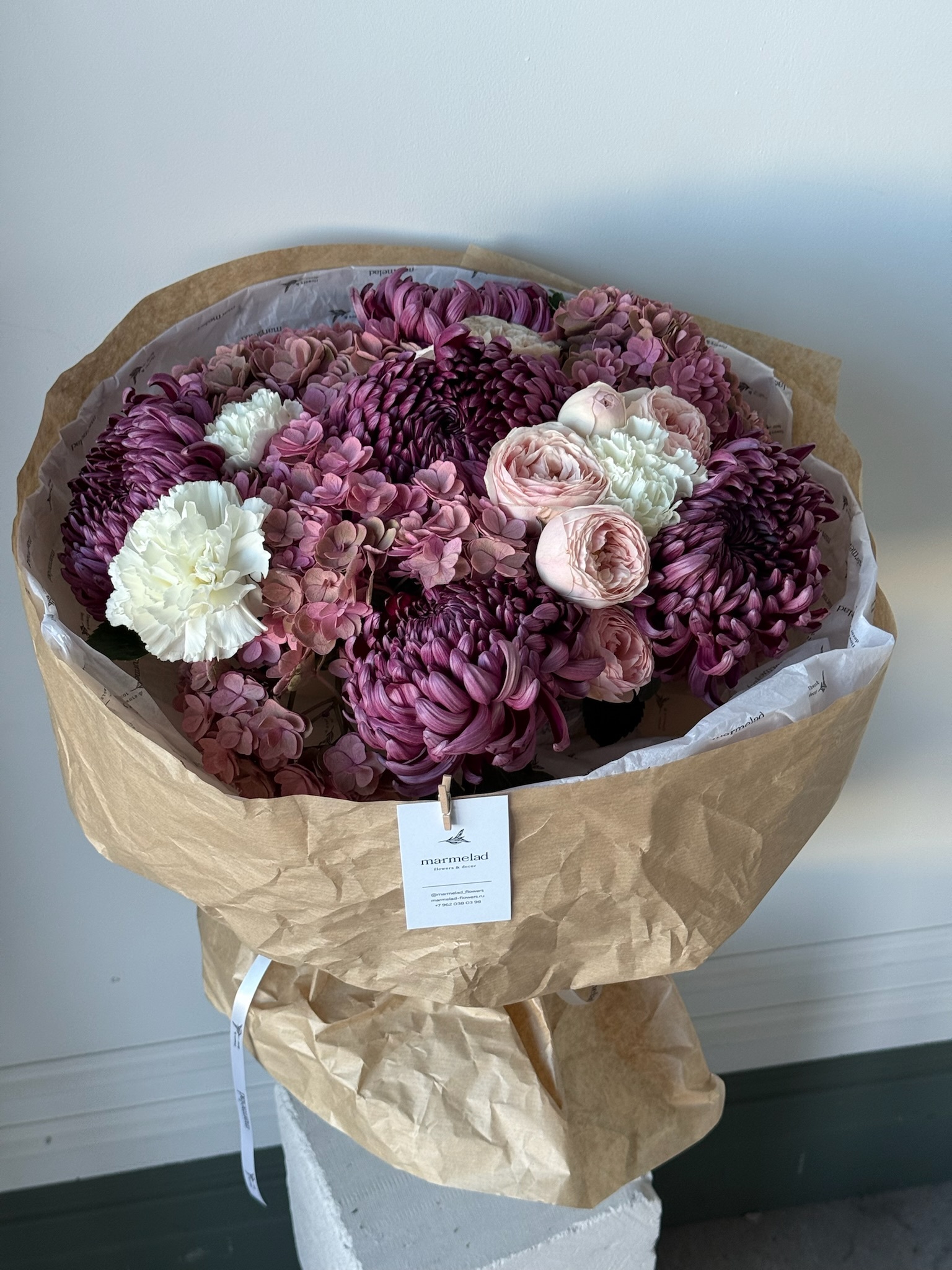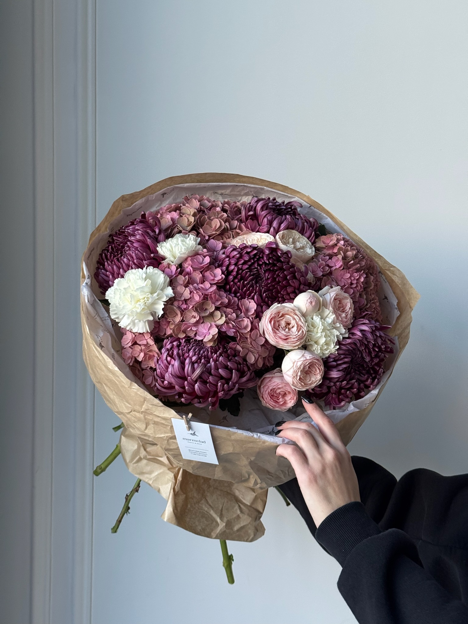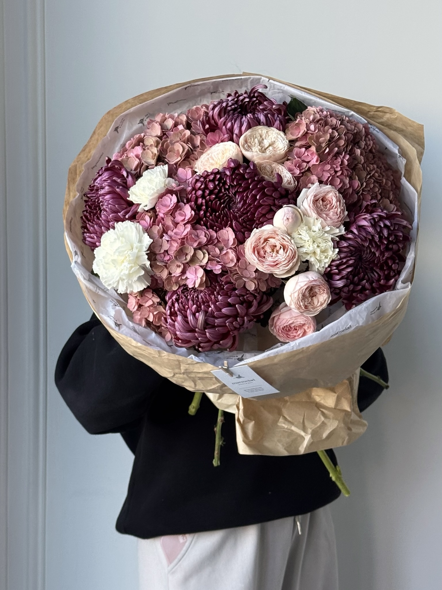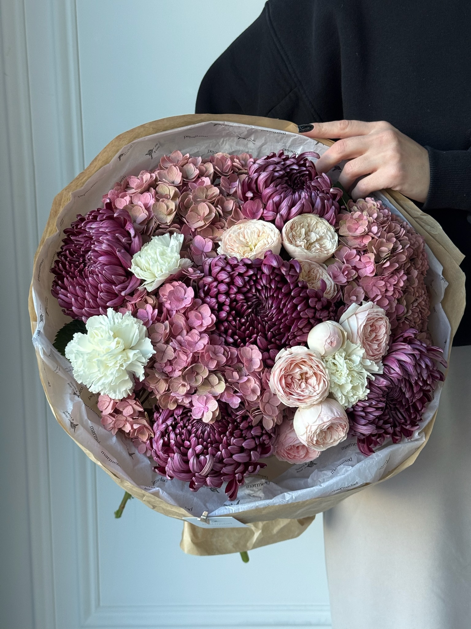 Букет из гортензии, кустовых пионовидных роз, диантусов и хризантемы бигуди