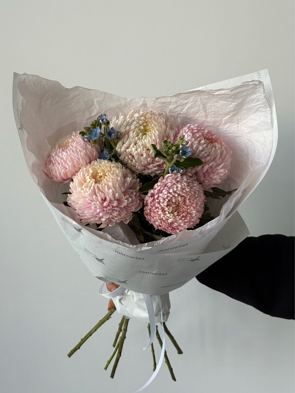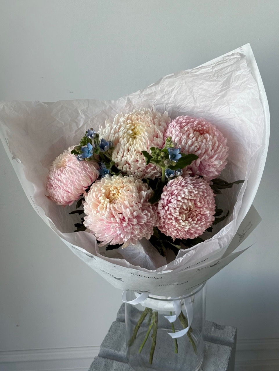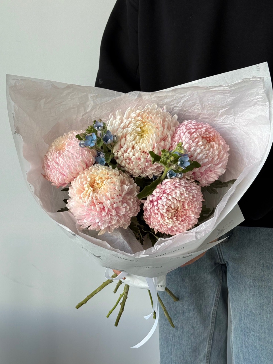 Букет из оксипеталума и хризантемы в светло розовом оттенке