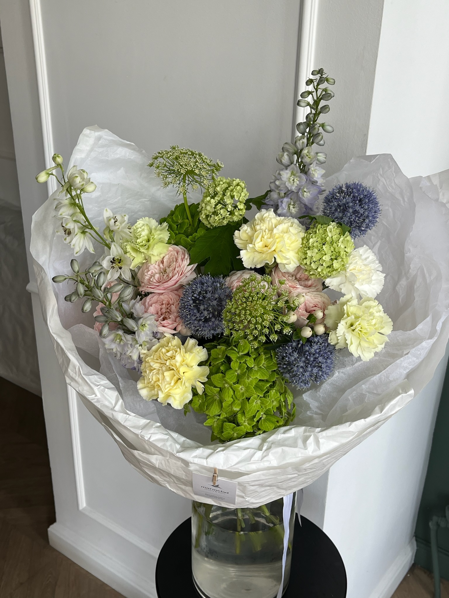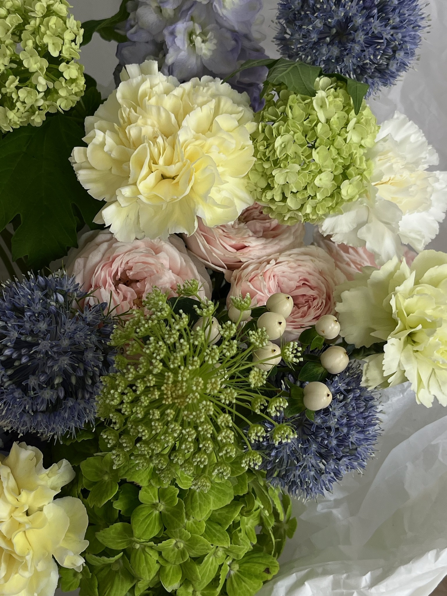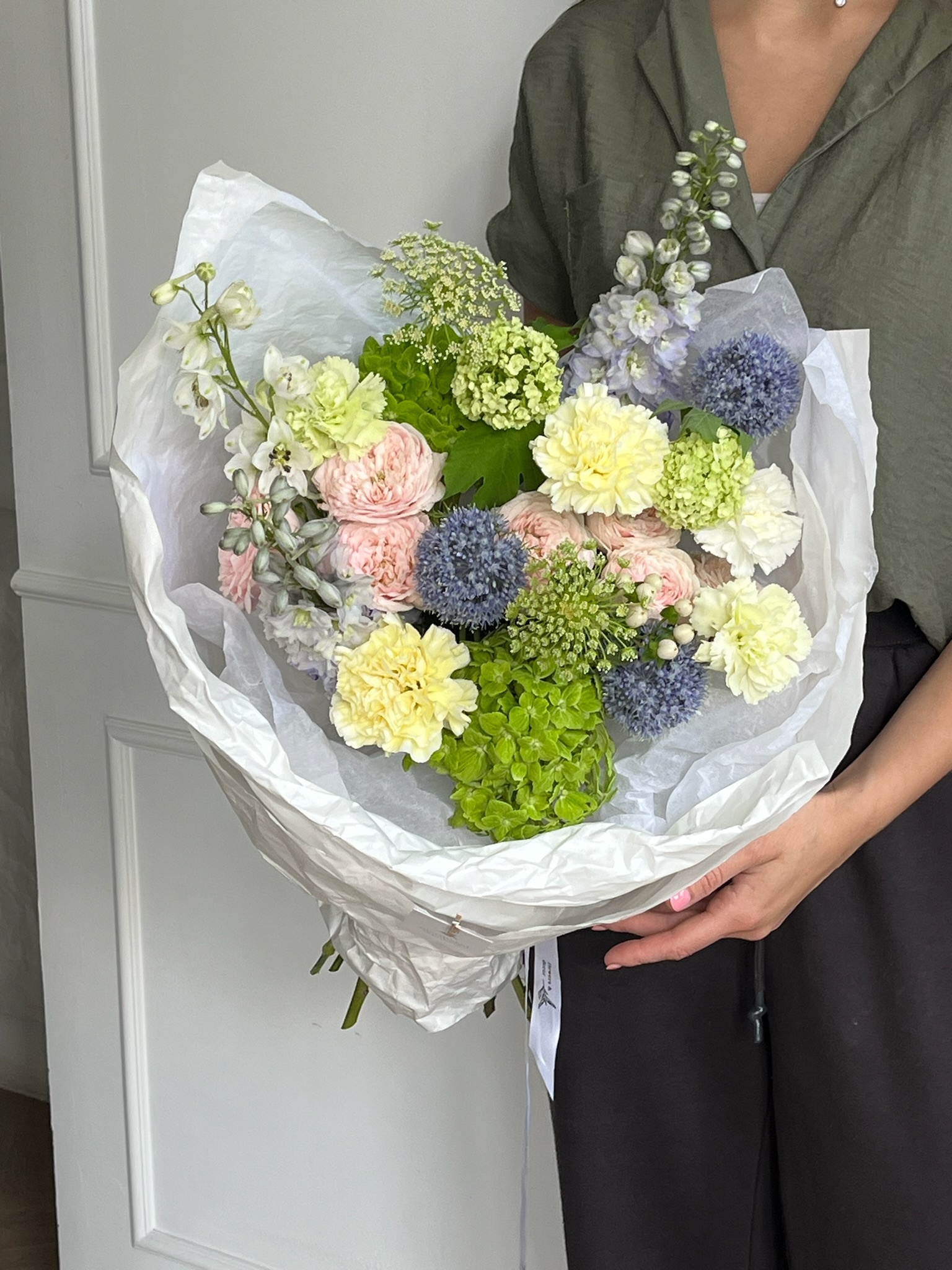 Букет сборный из гортензии, кустовых пионовидных роз, диантусов, амми и дельфиниума