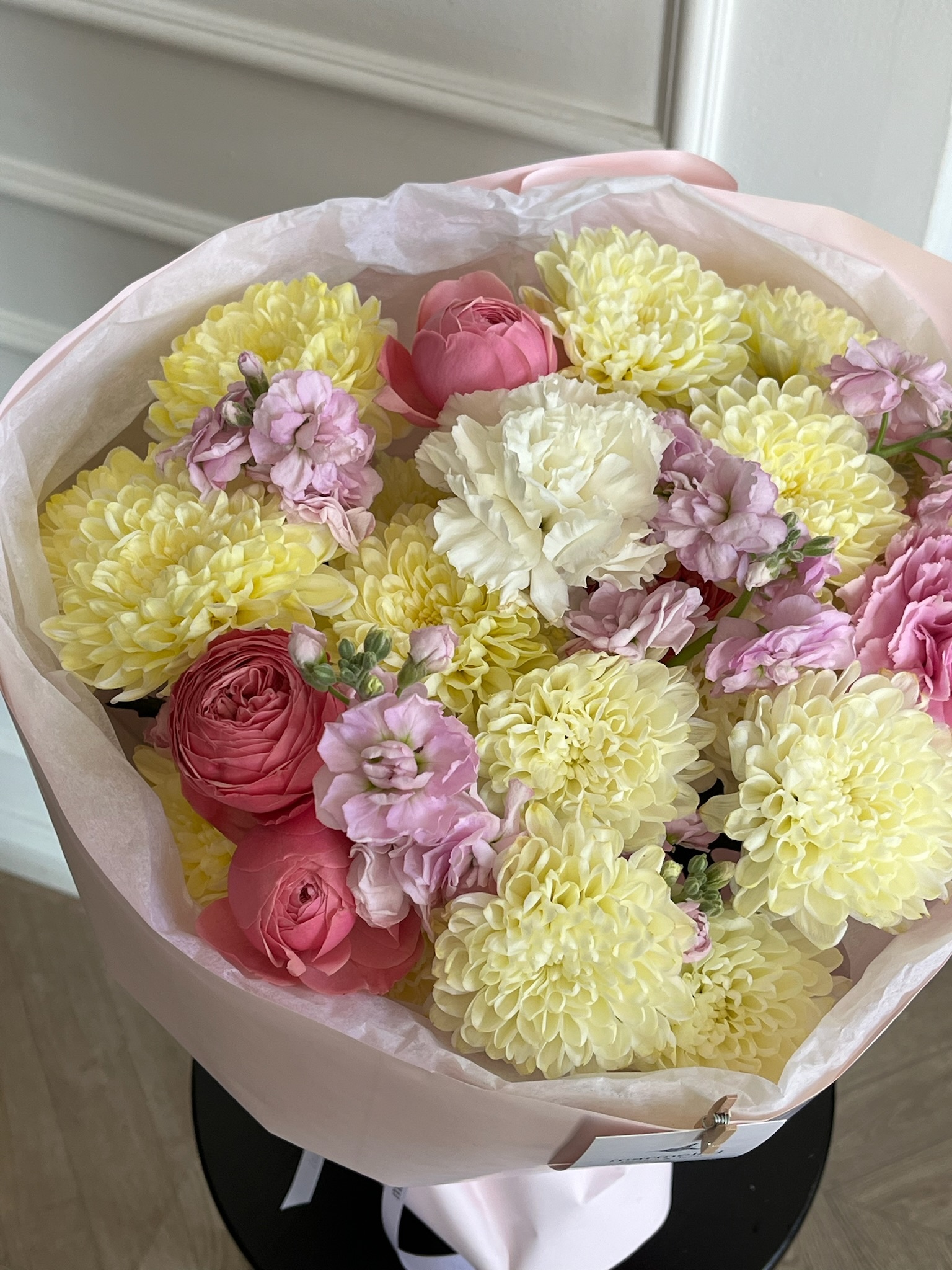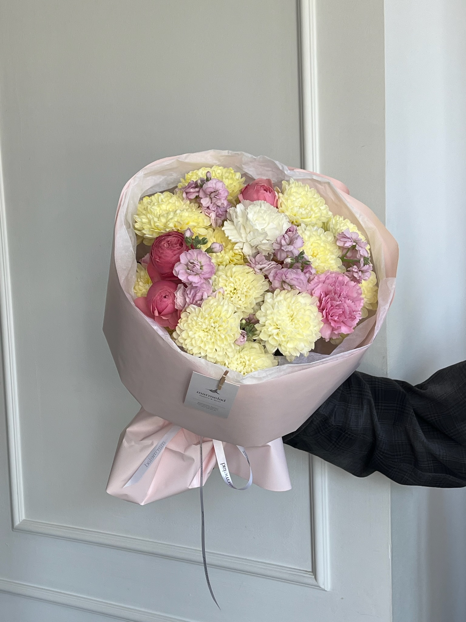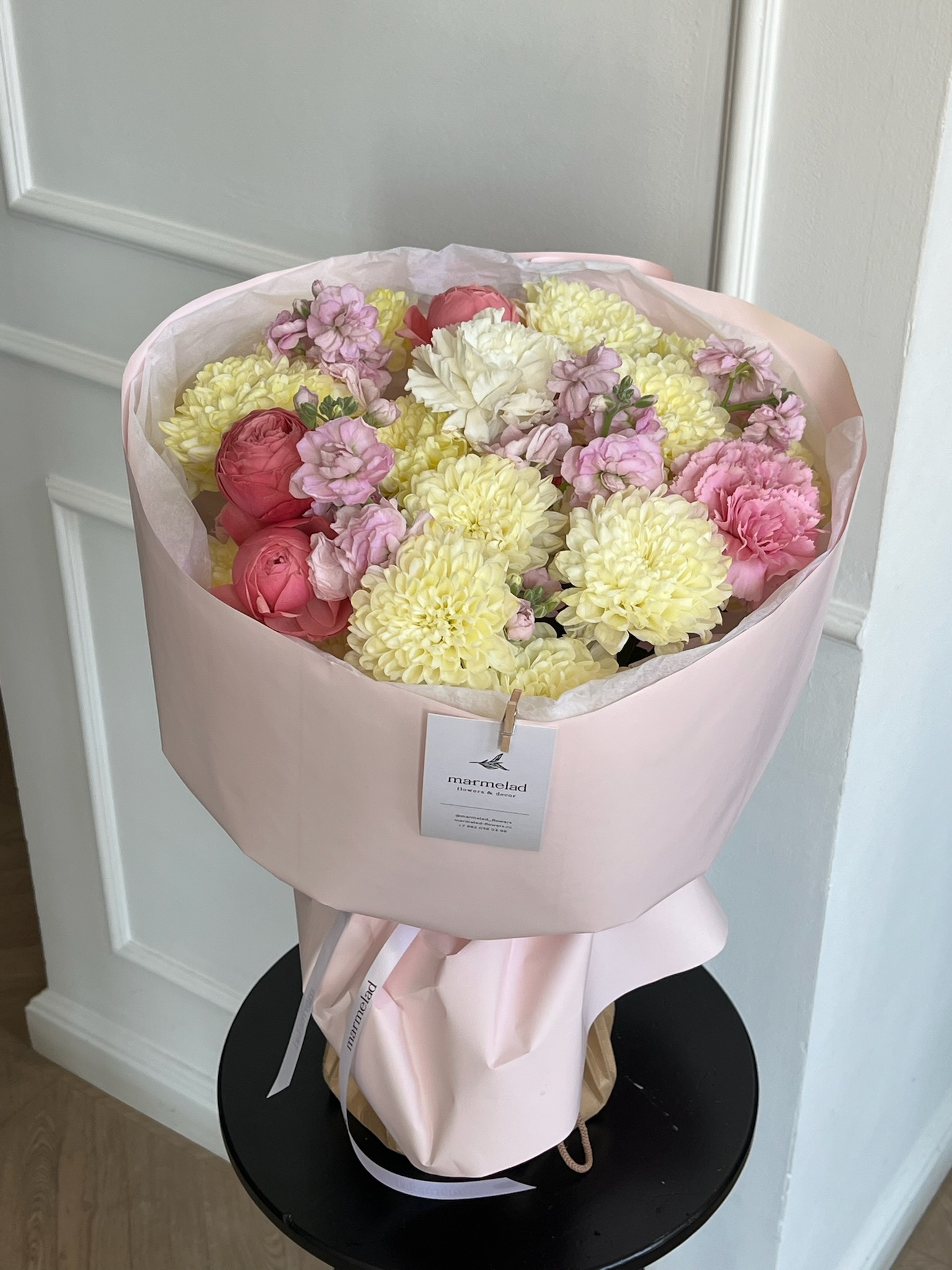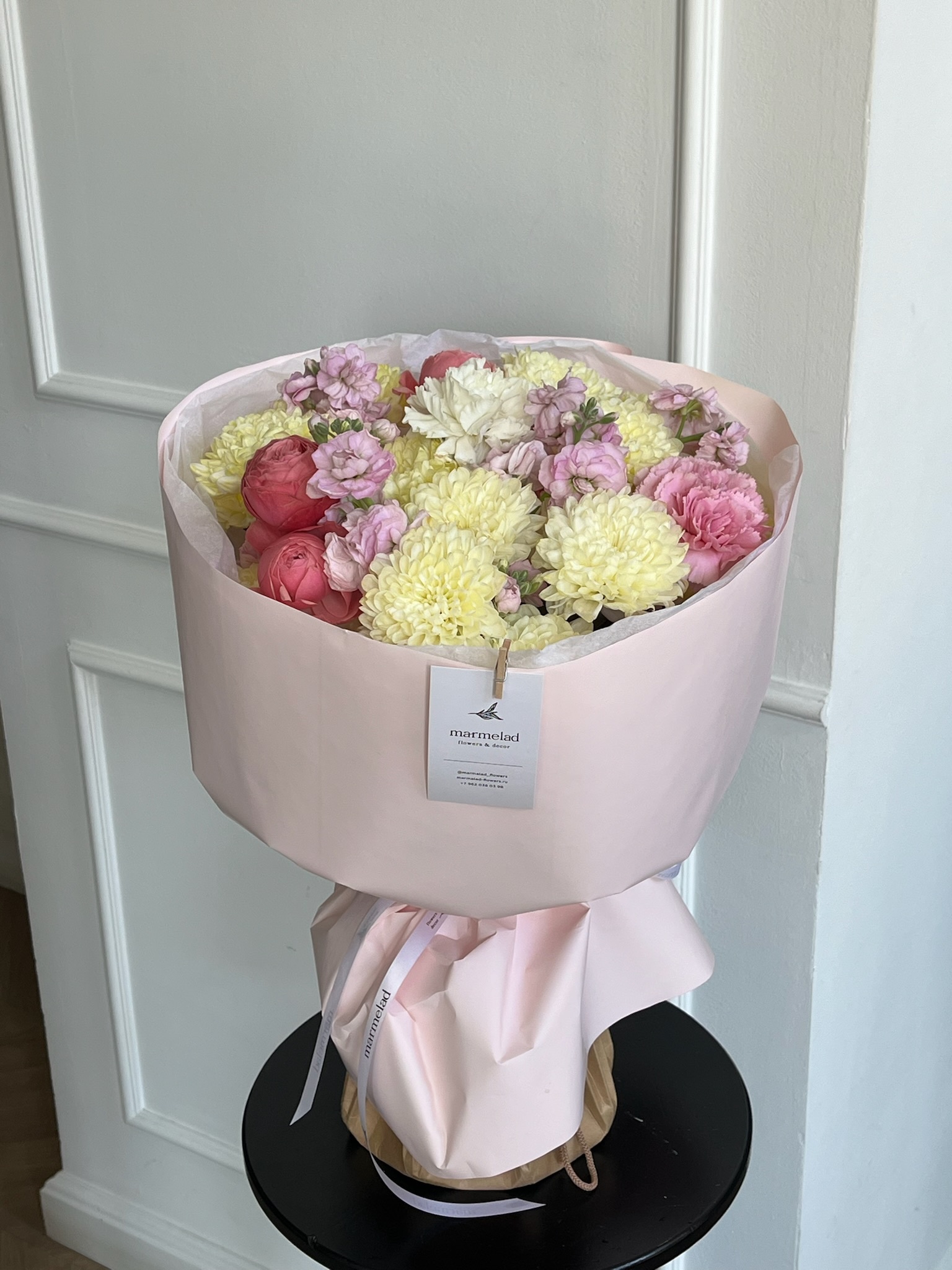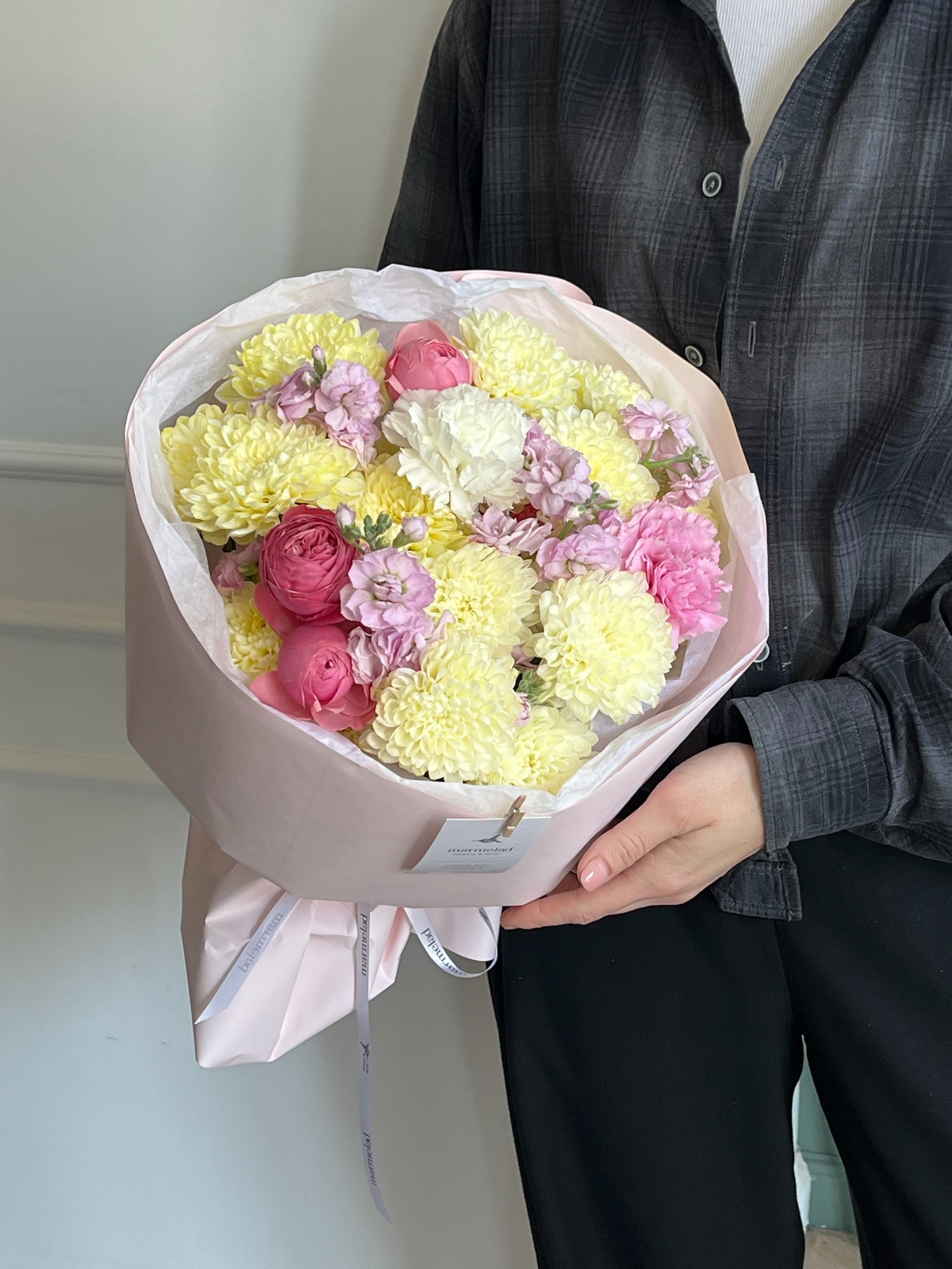 Букет сборный из кустовых пионовидных роз, диантусов, маттиолы и хризантемы