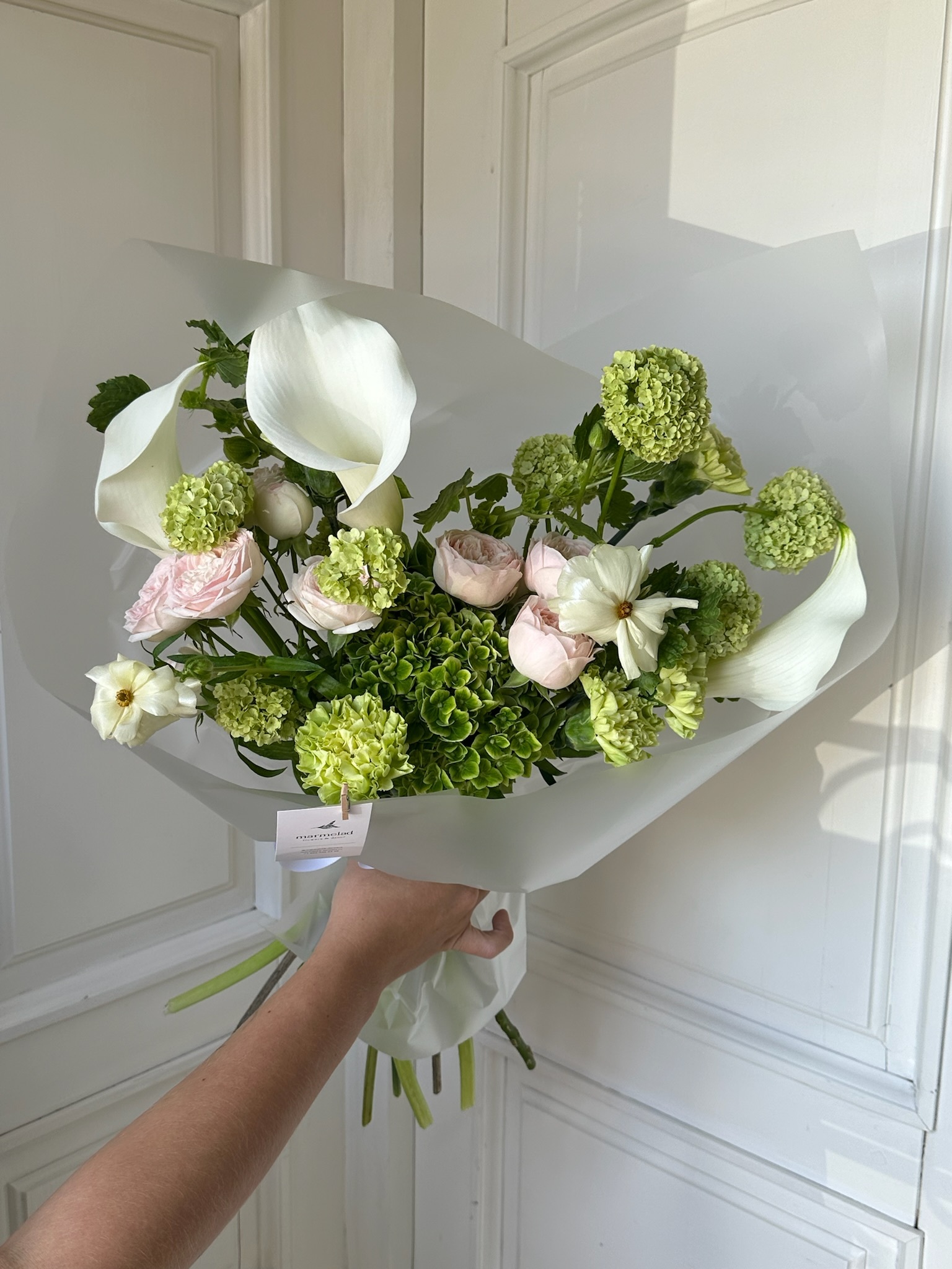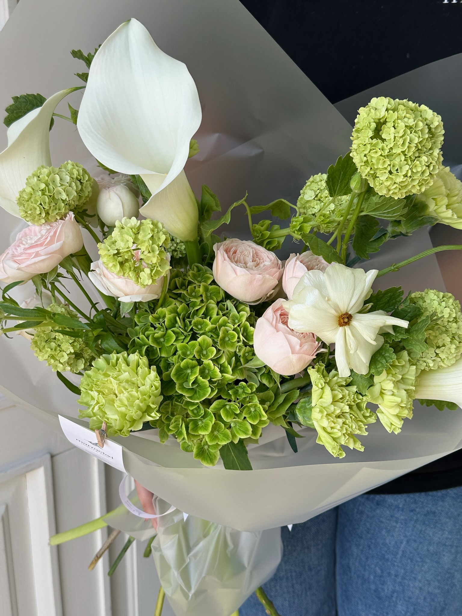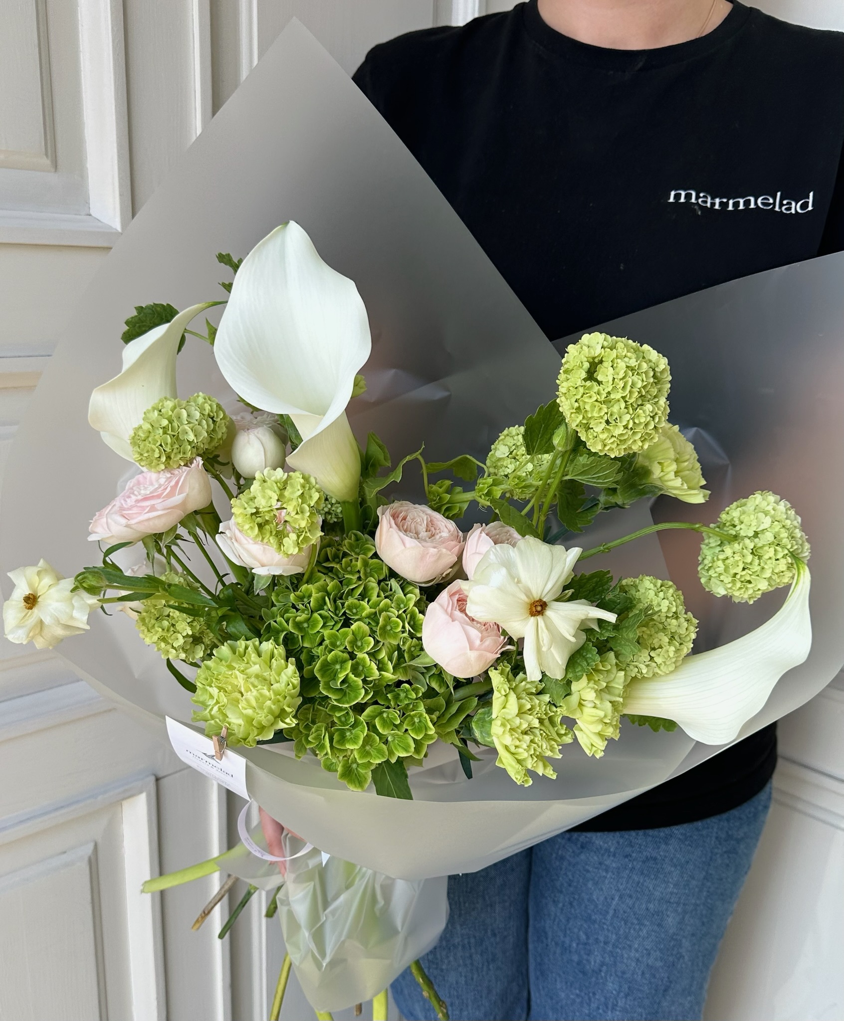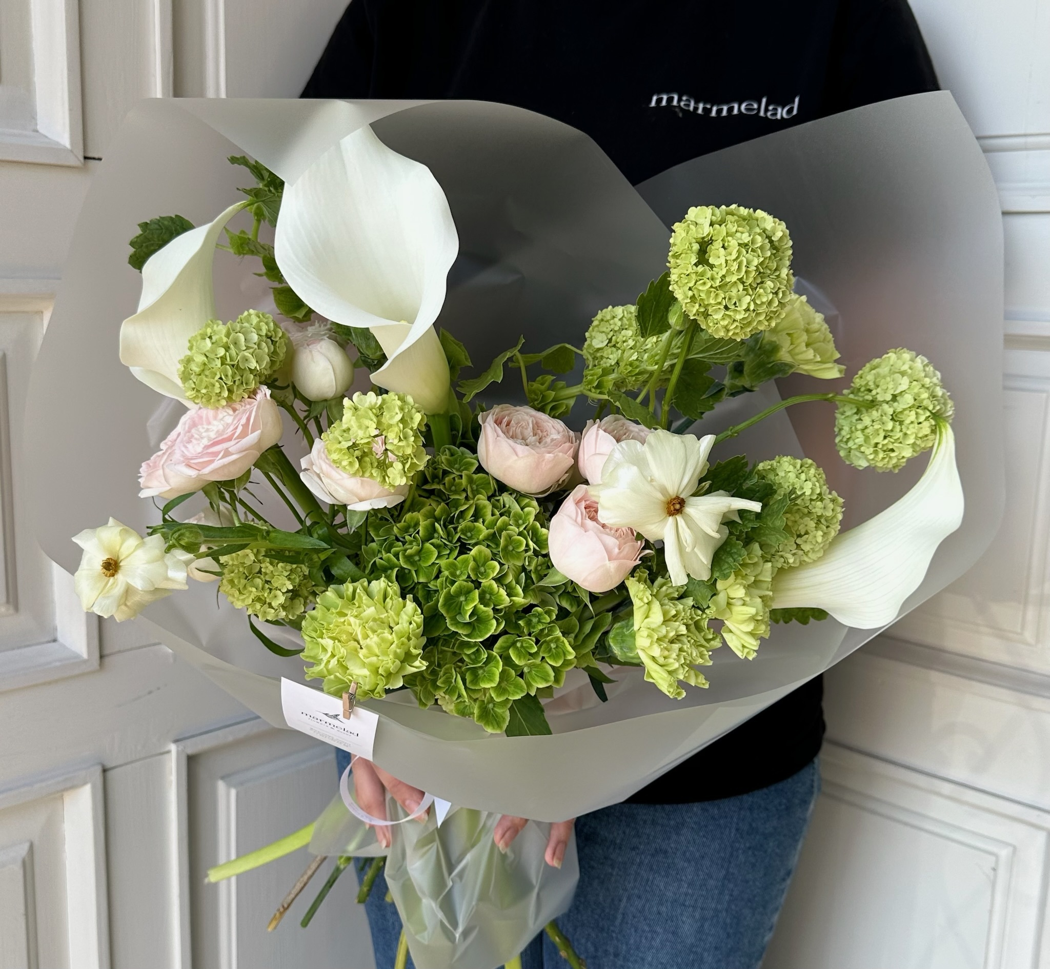 Букет сборный из игортензии, калл, кустовых пионовидных роз и вибурнума