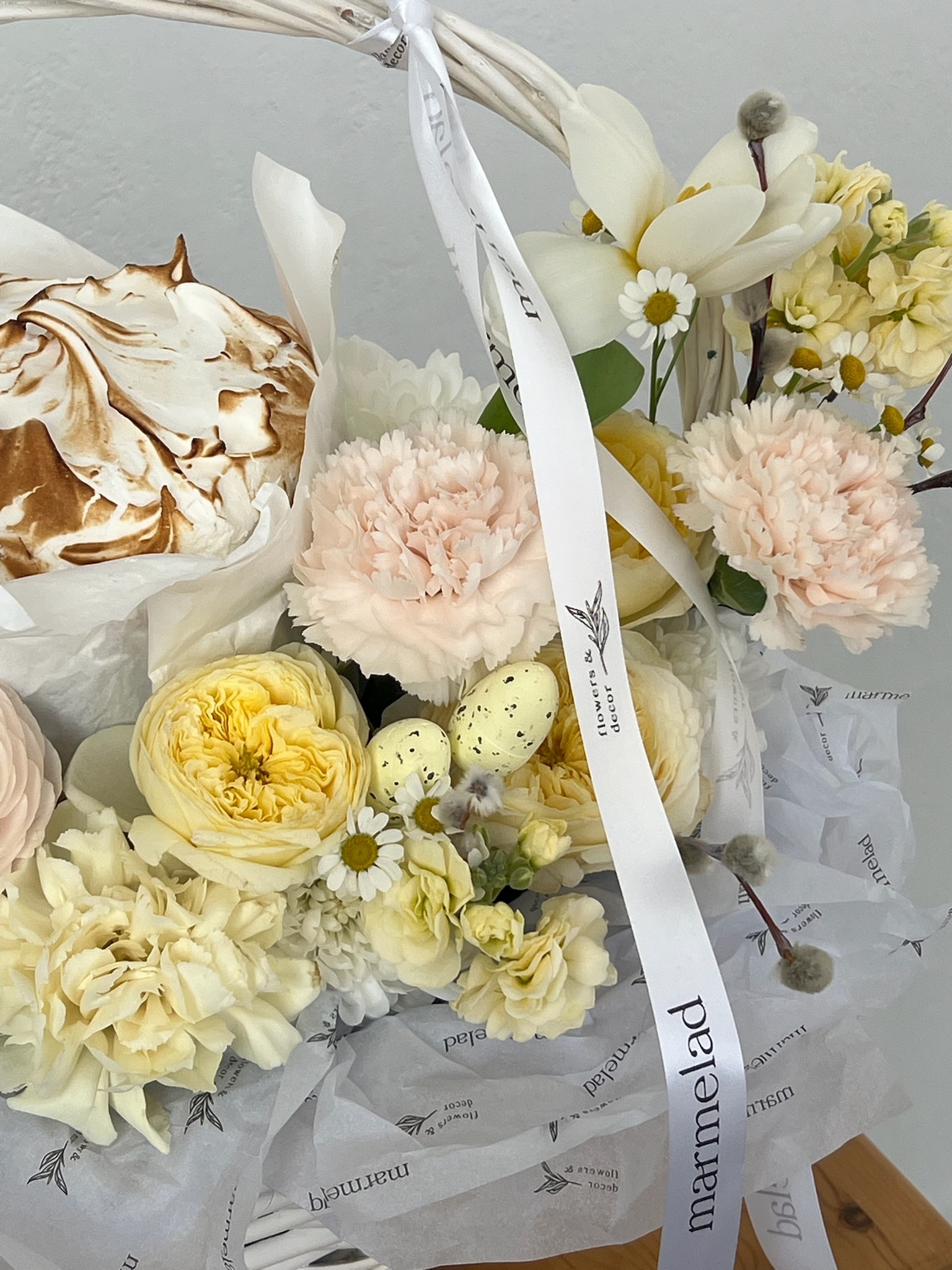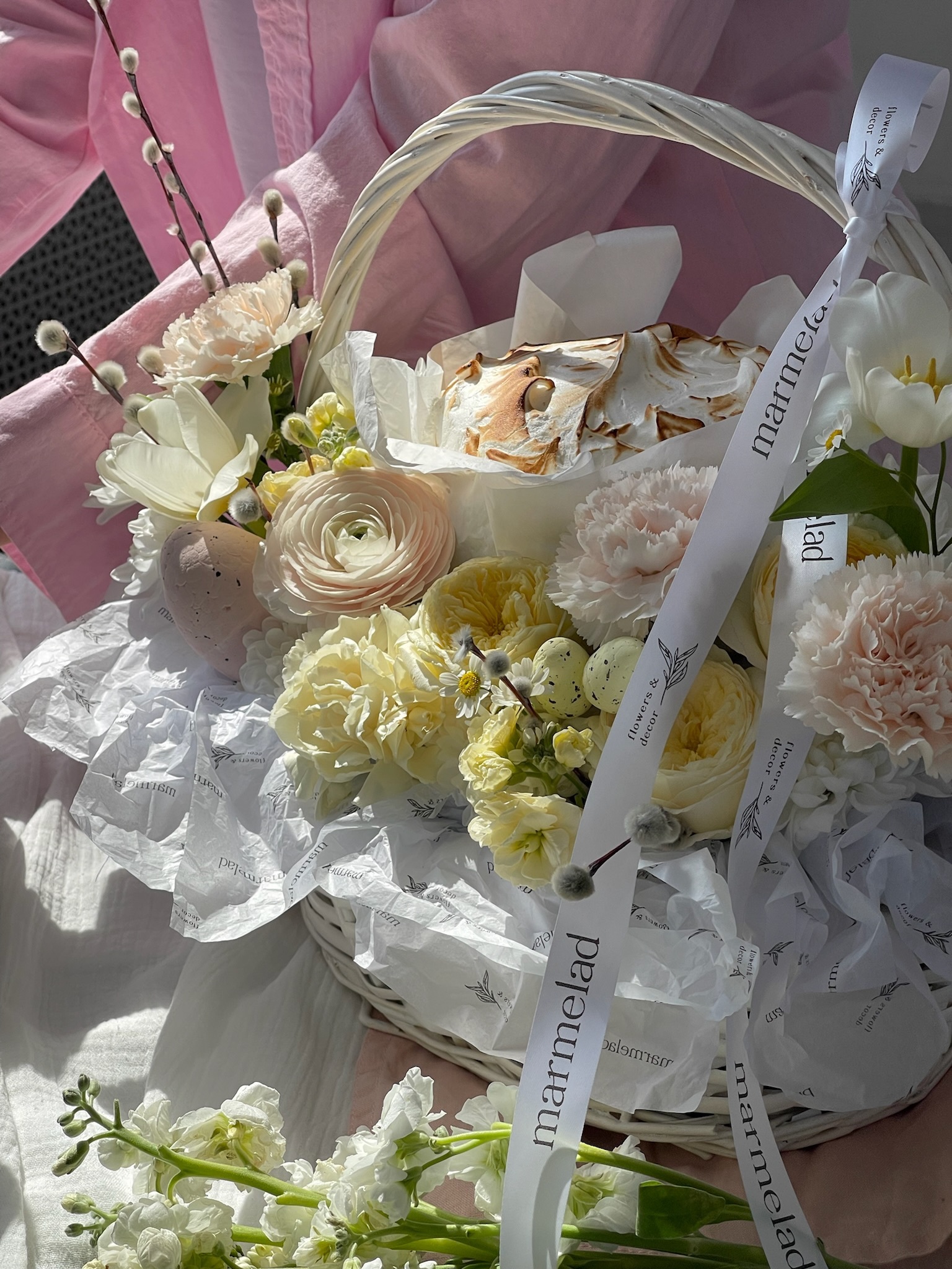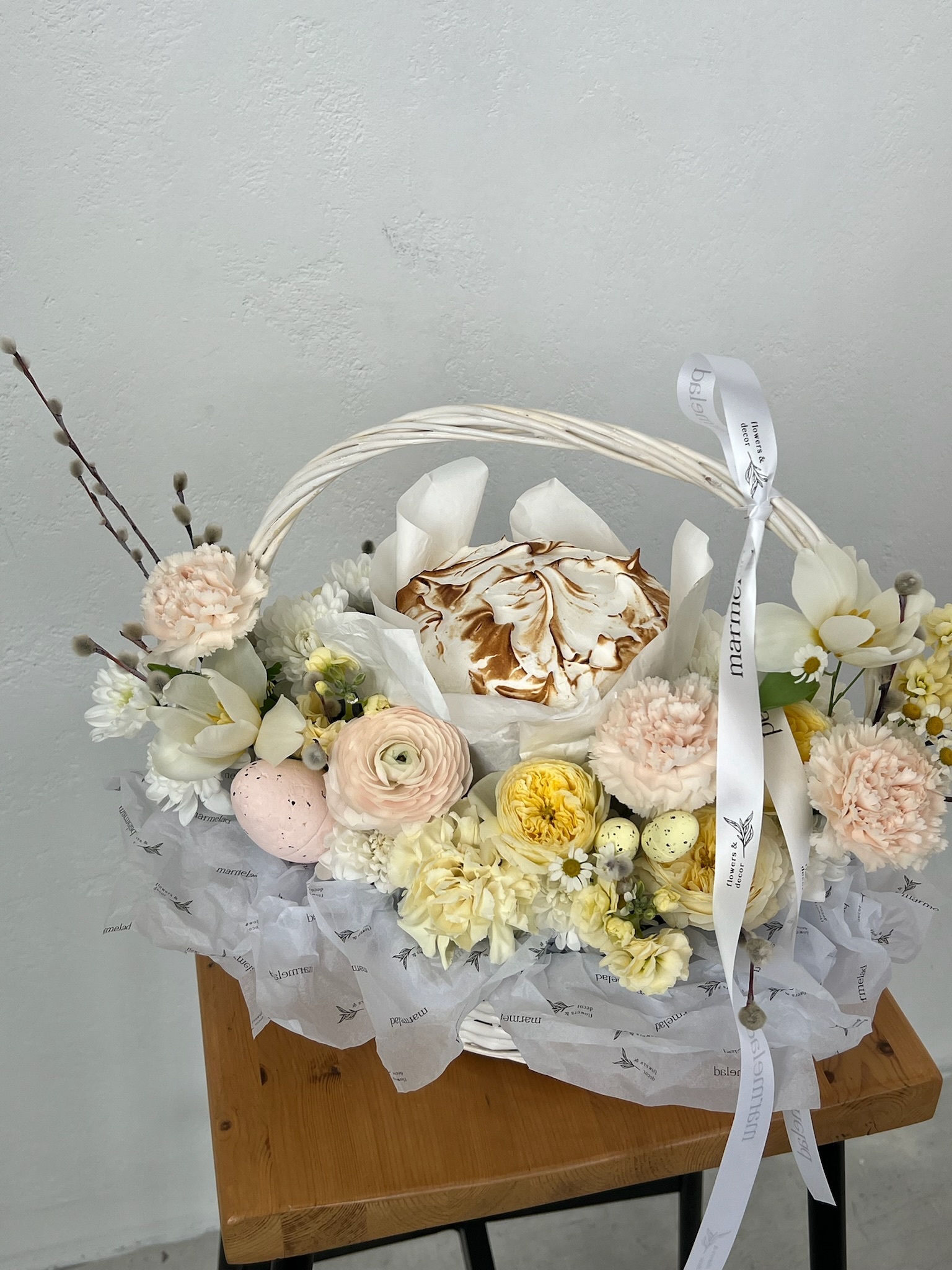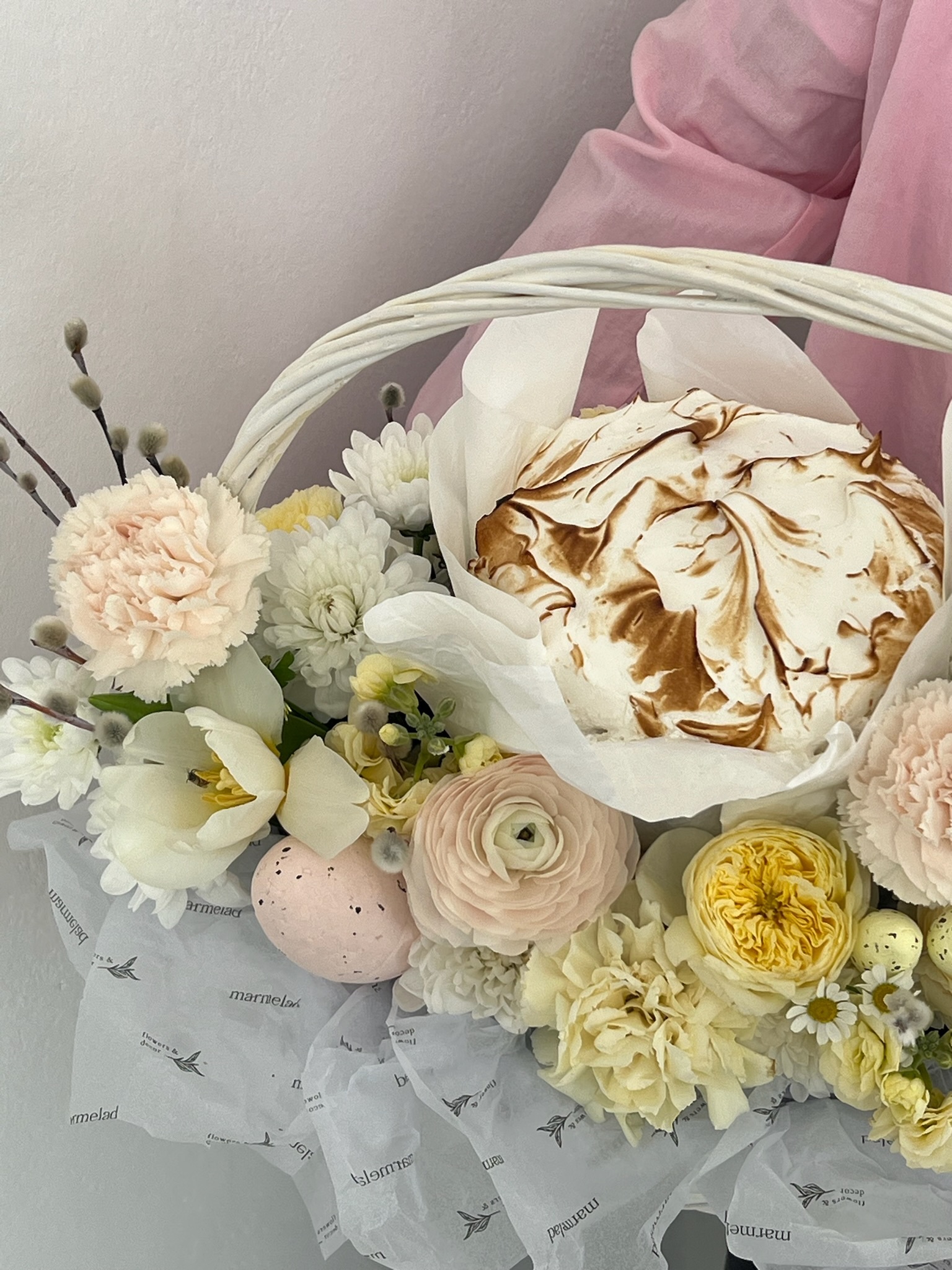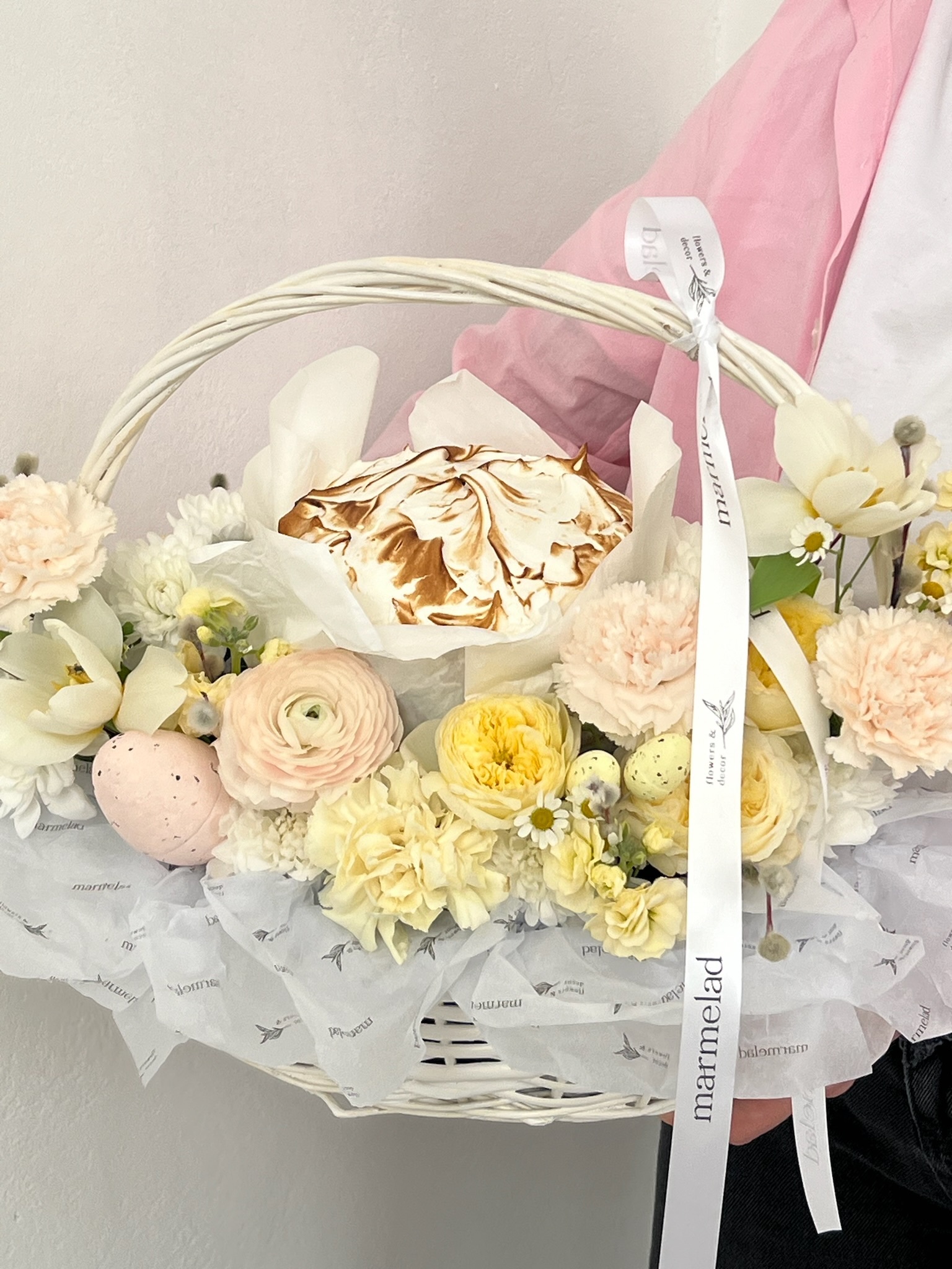 Корзина пасхальная в нежно-розовых оттенках. Кулич 450 гр