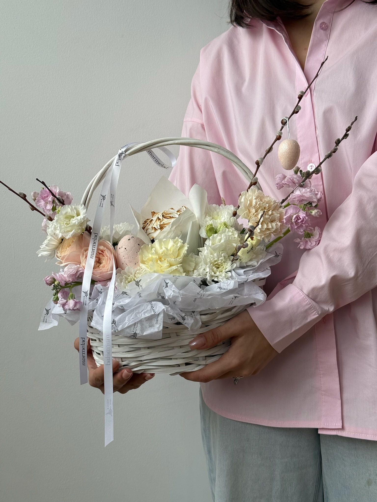 Корзина пасхальная в нежных оттенках. Кулич 130 гр