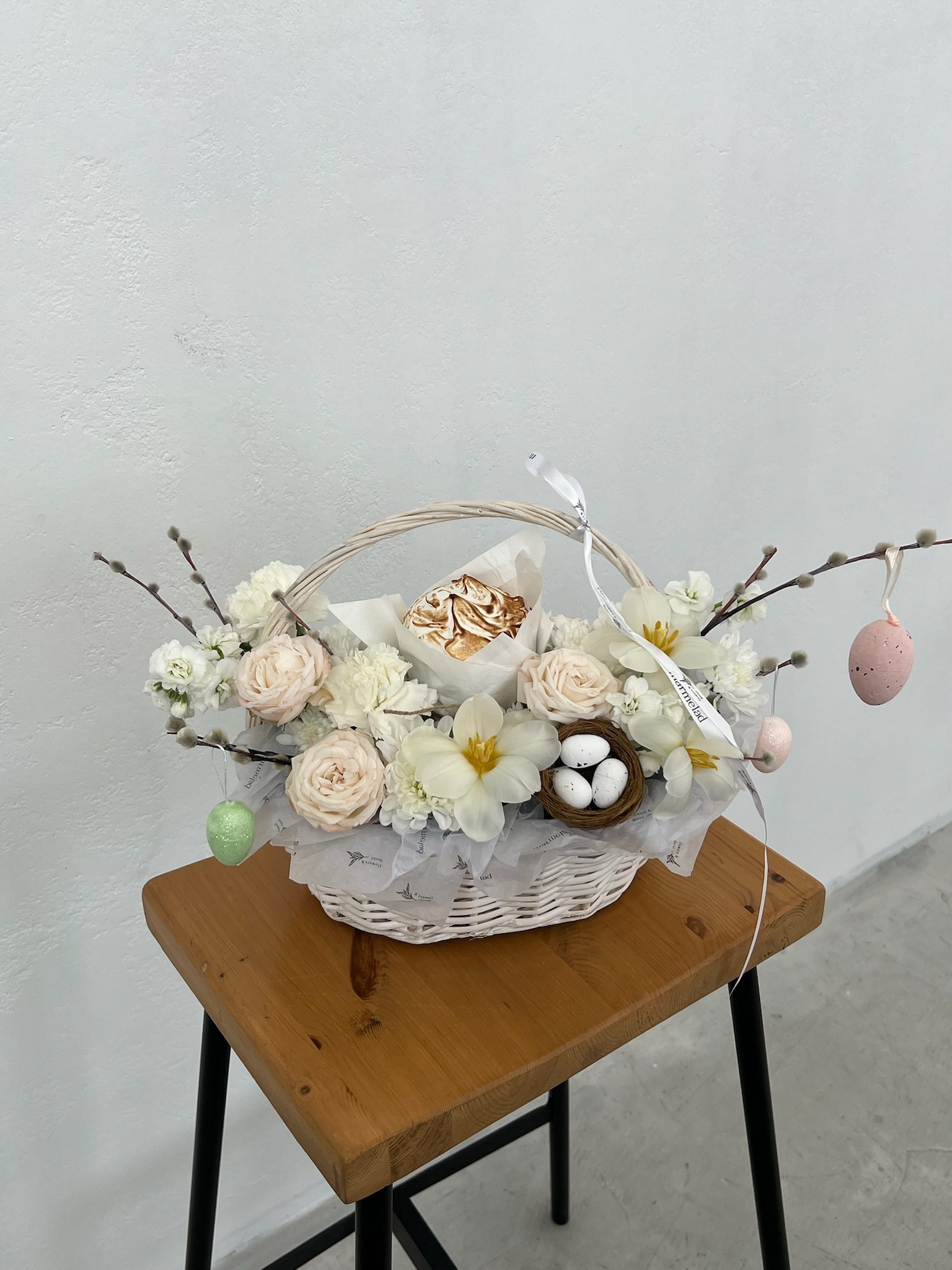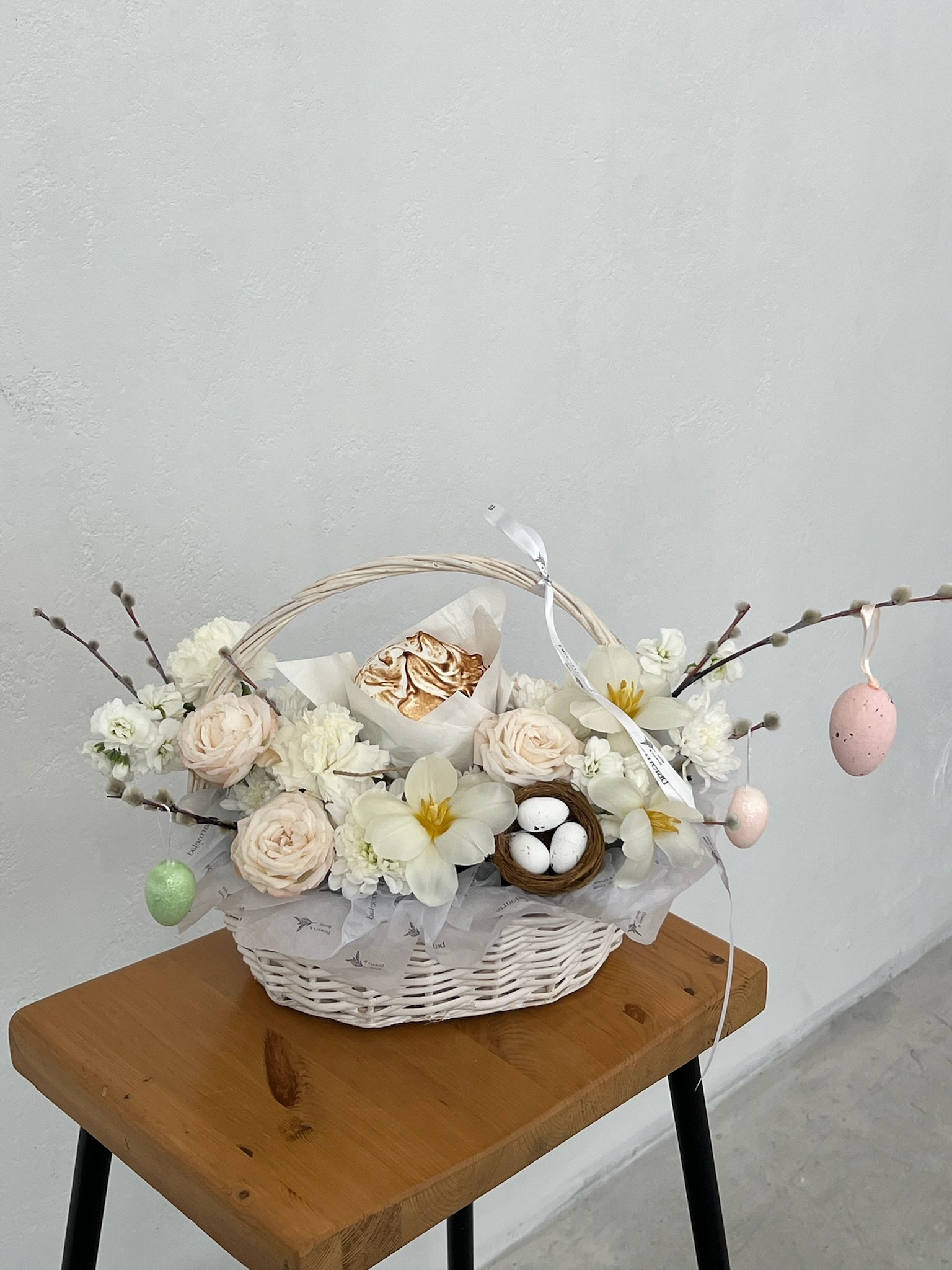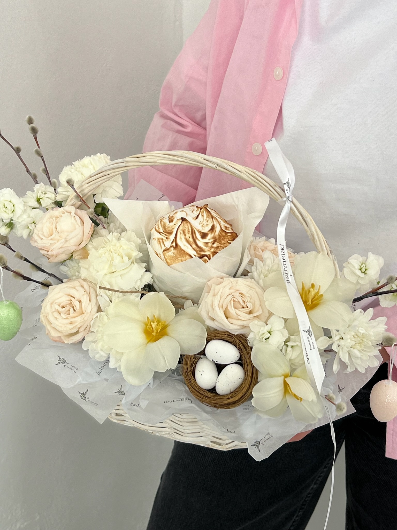 Корзина пасхальная в розовых оттенках. Кулич 130 гр