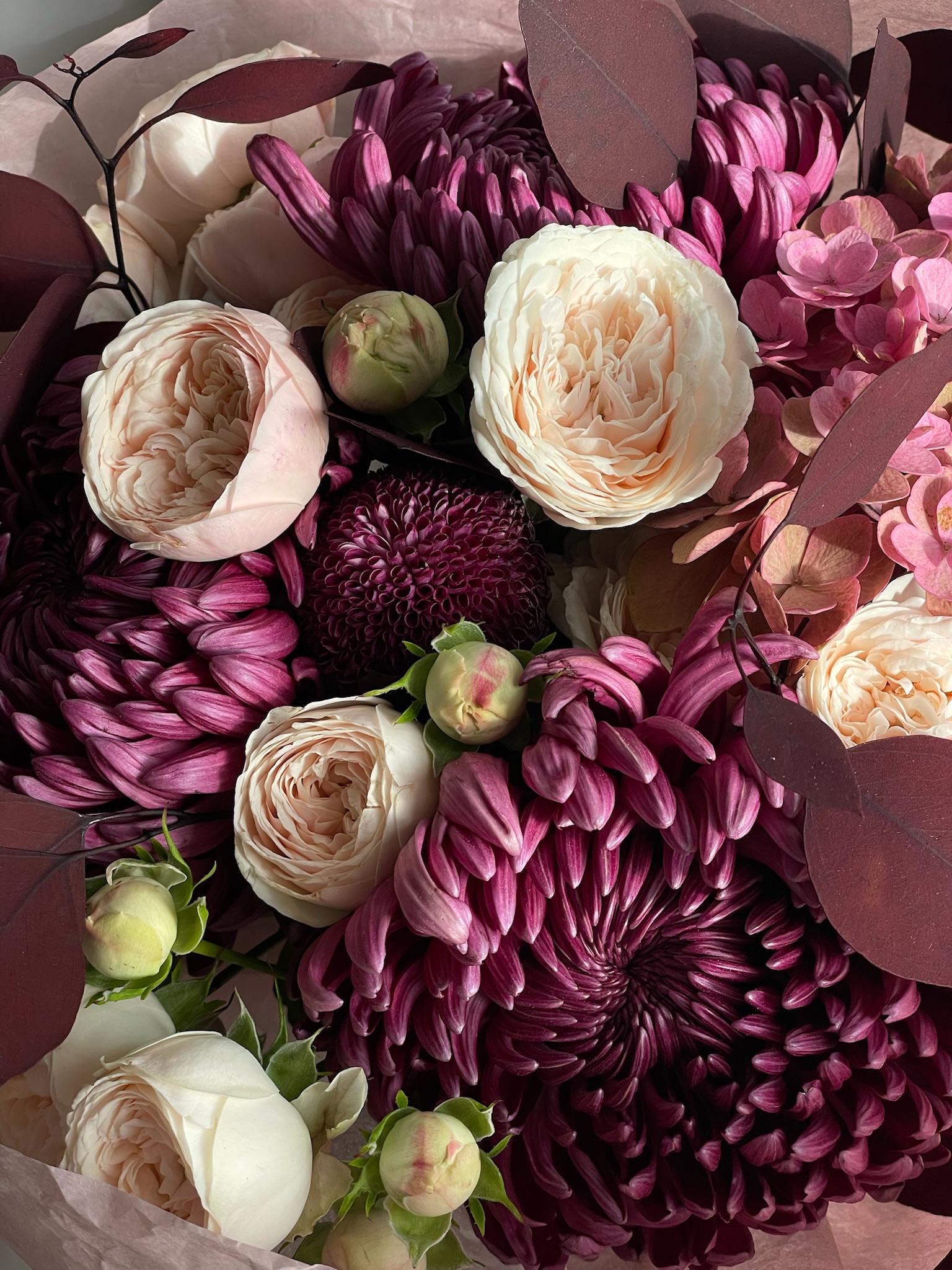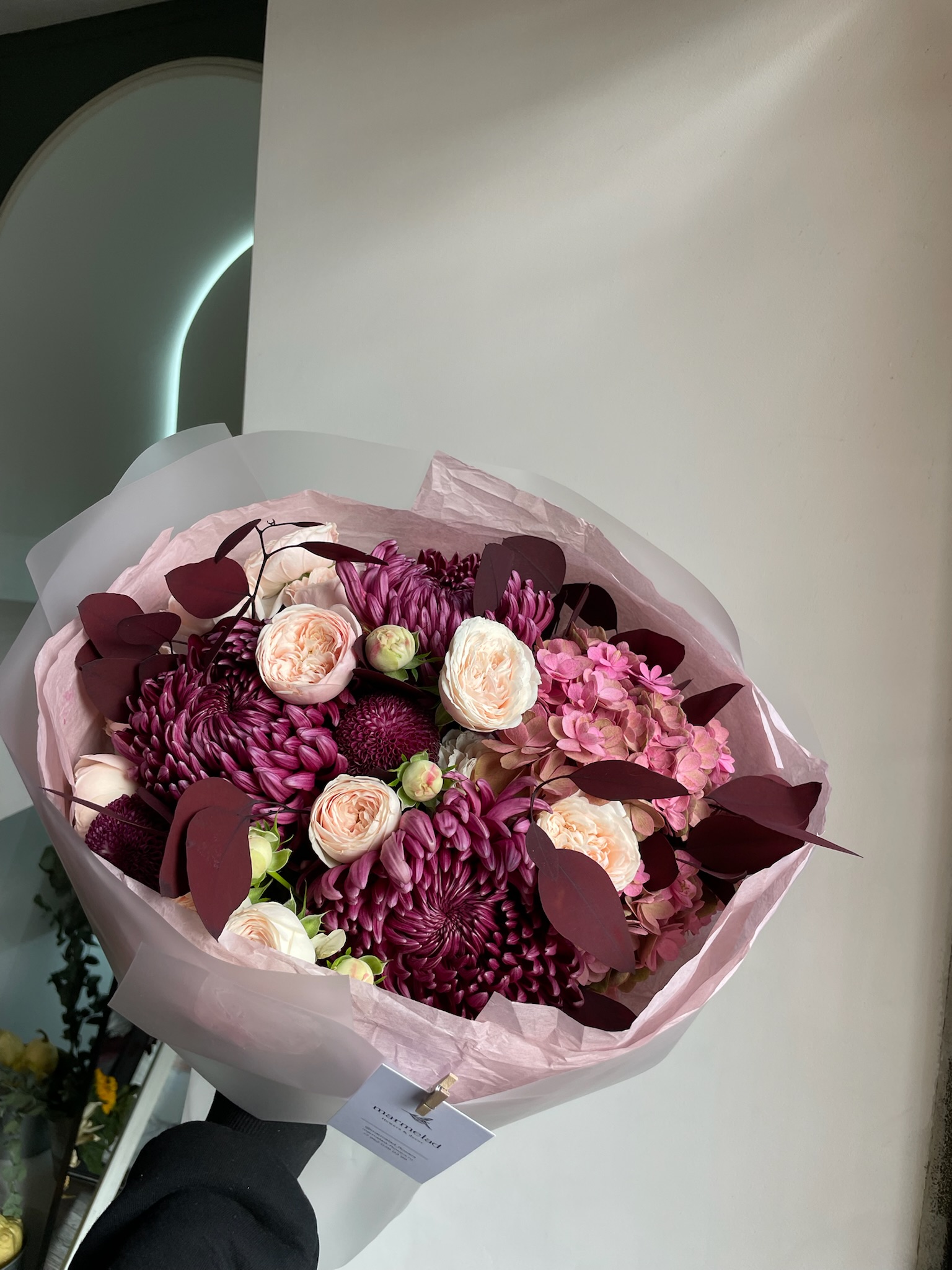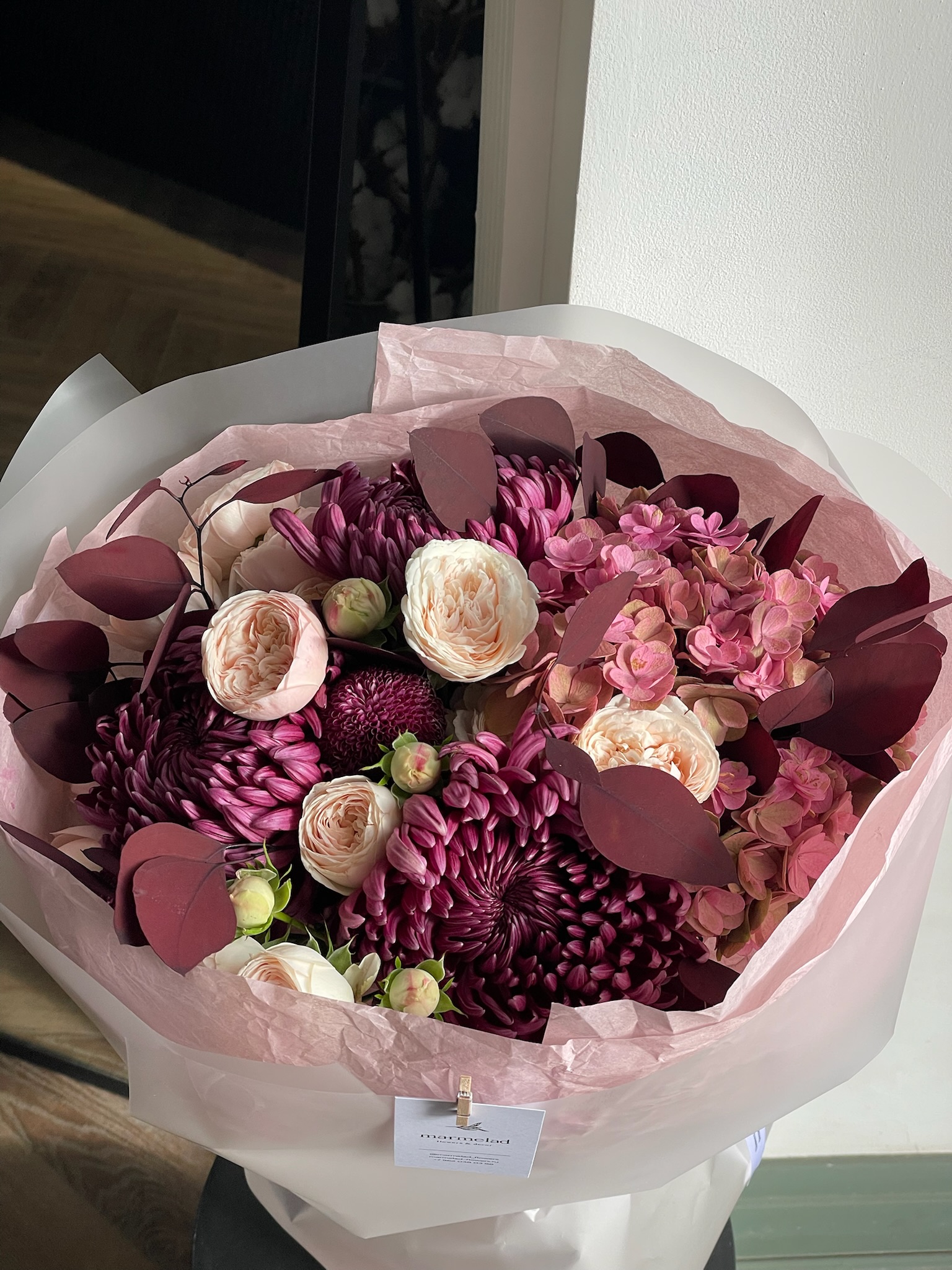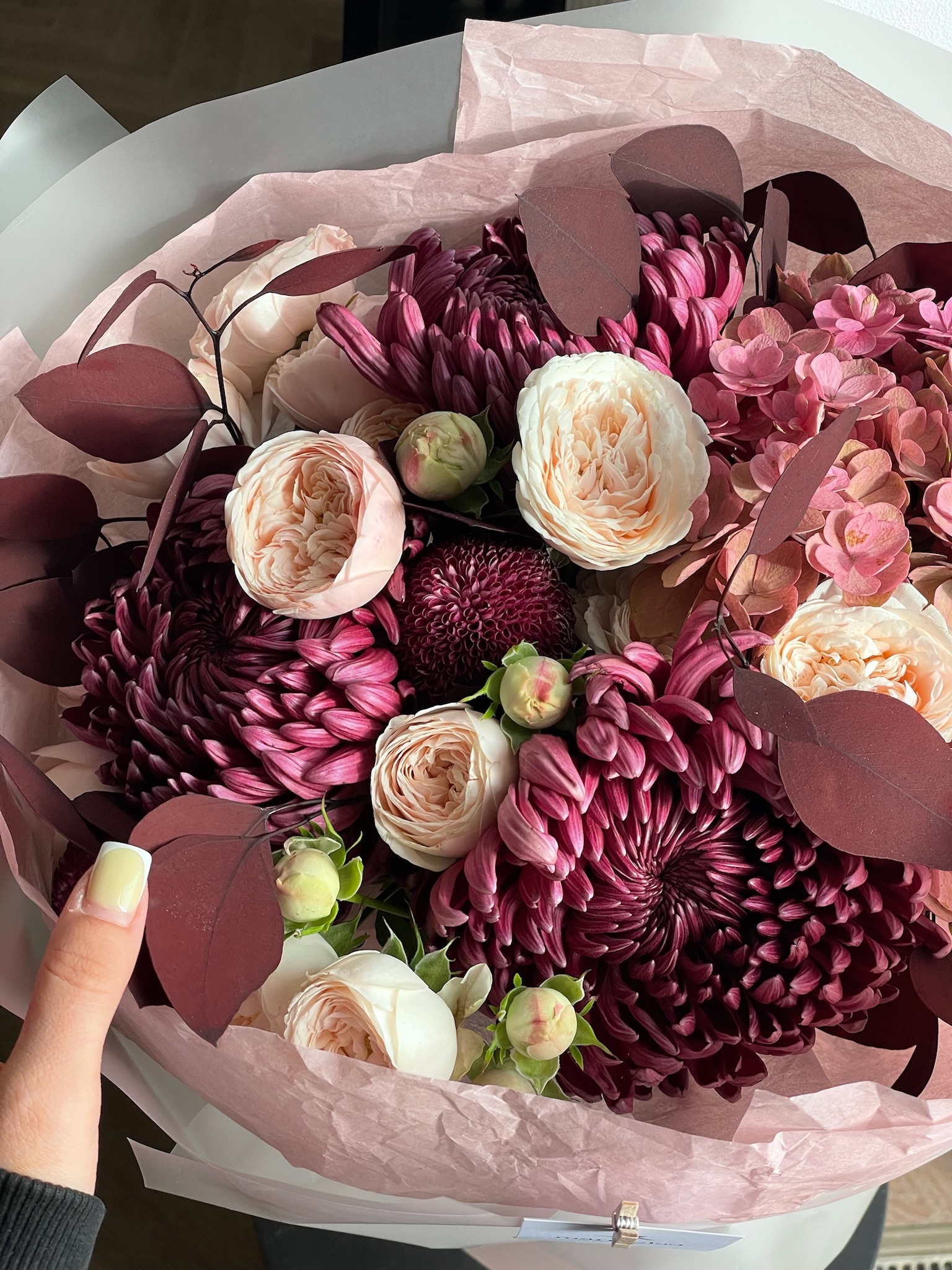 Букет из хризантемы бигуди, гортензии, кустовых пионовидных роз и эвкалипта
