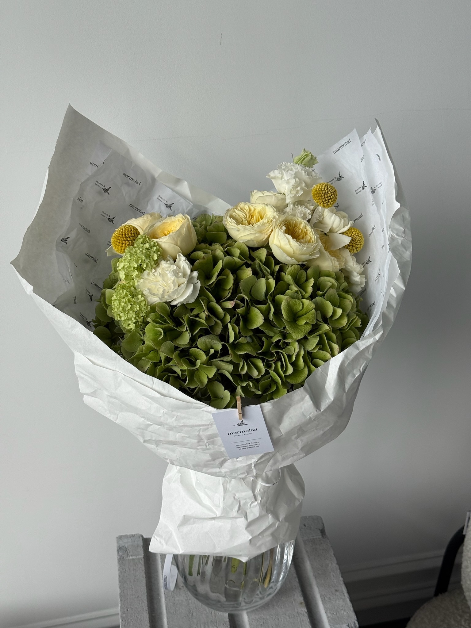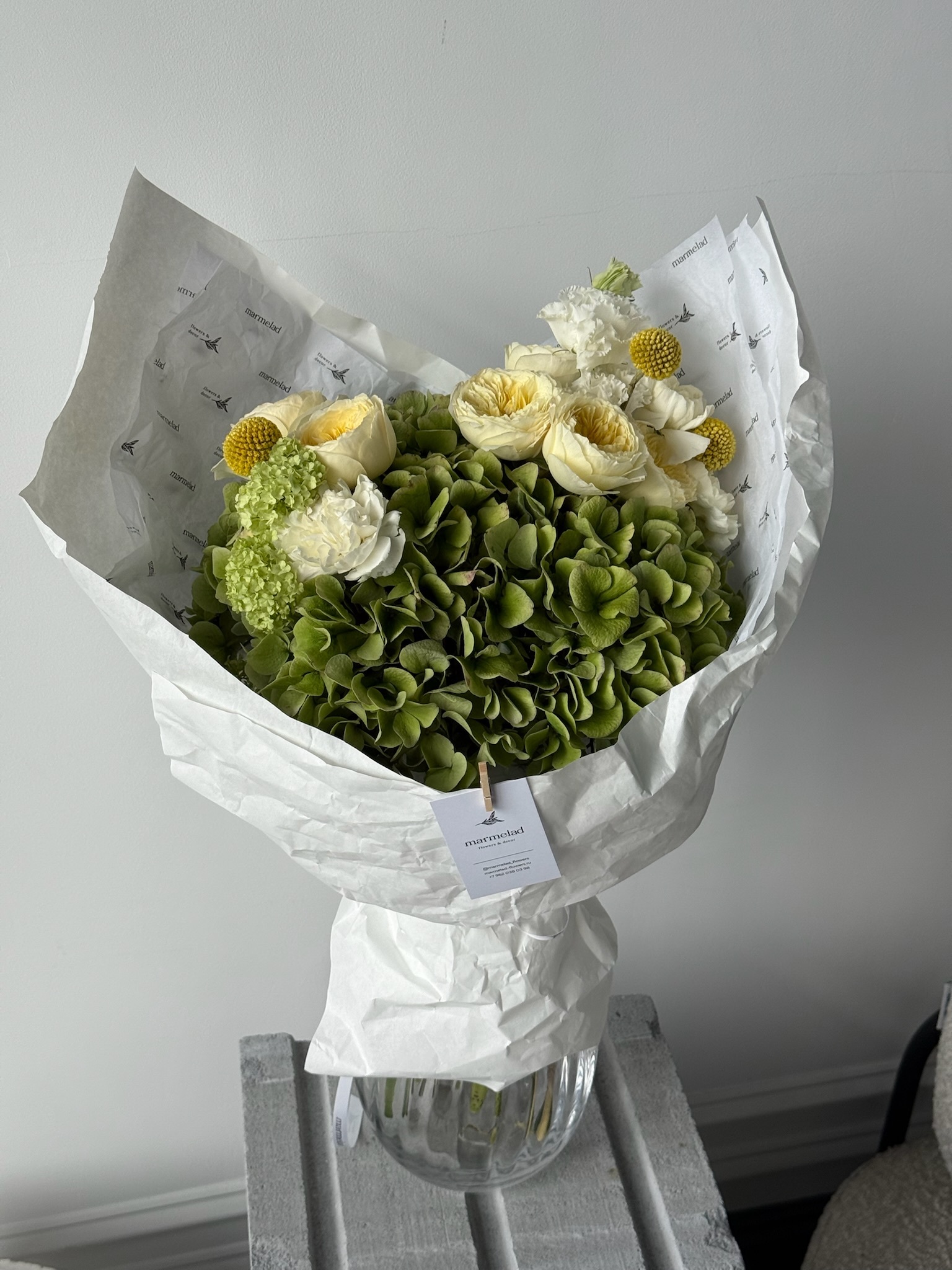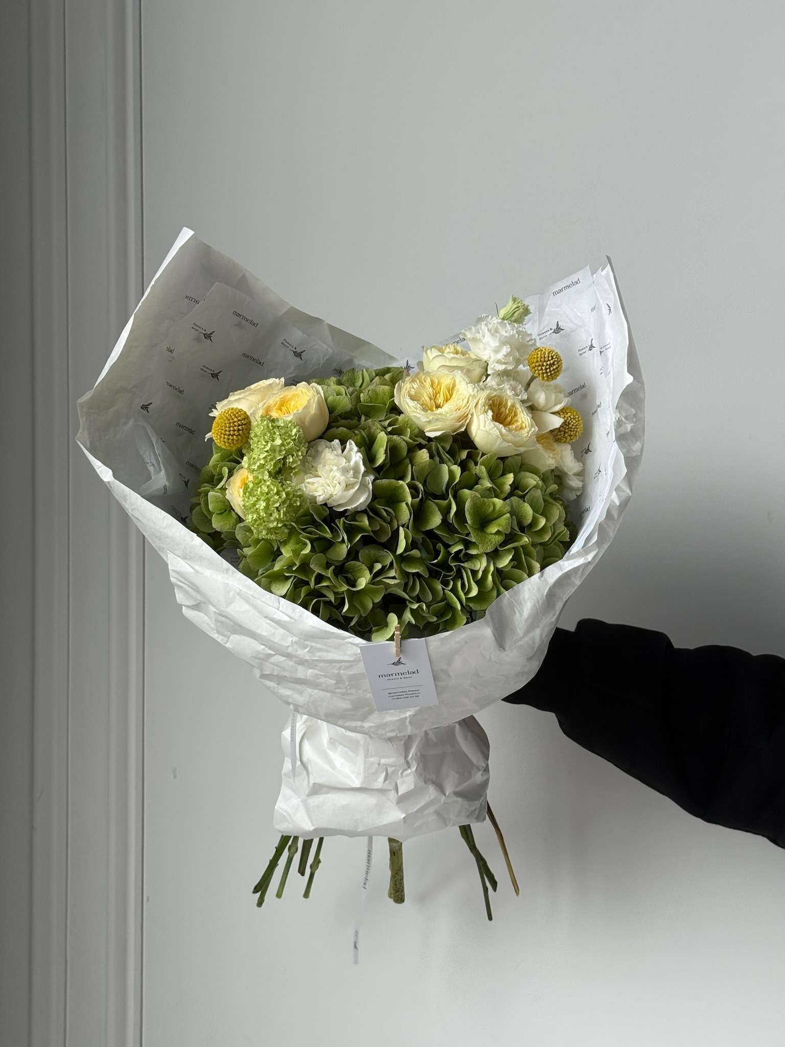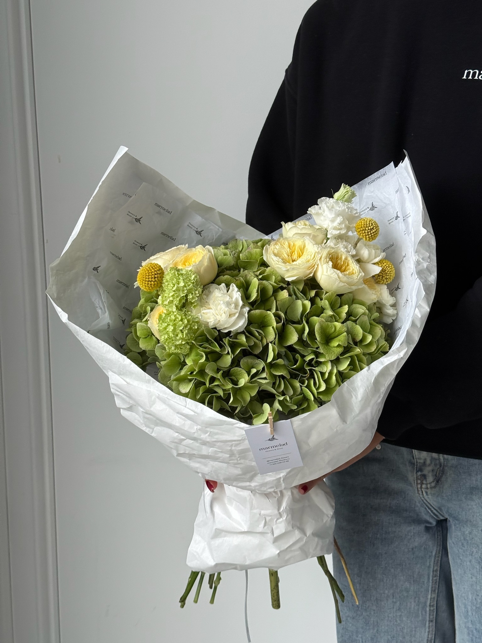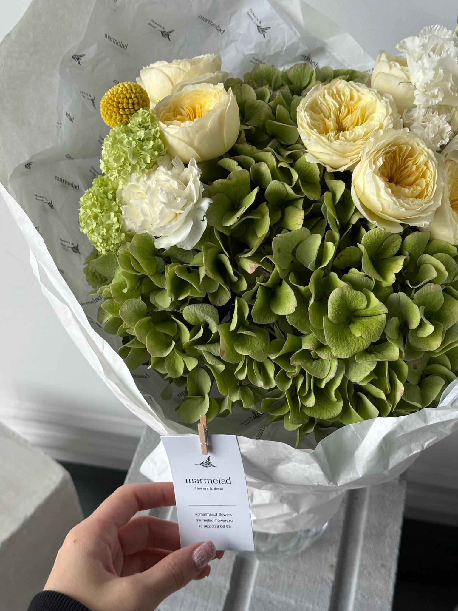 Букет из зеленой гортензии, кустовых пионовидных роз, диантусов и лизиантуса