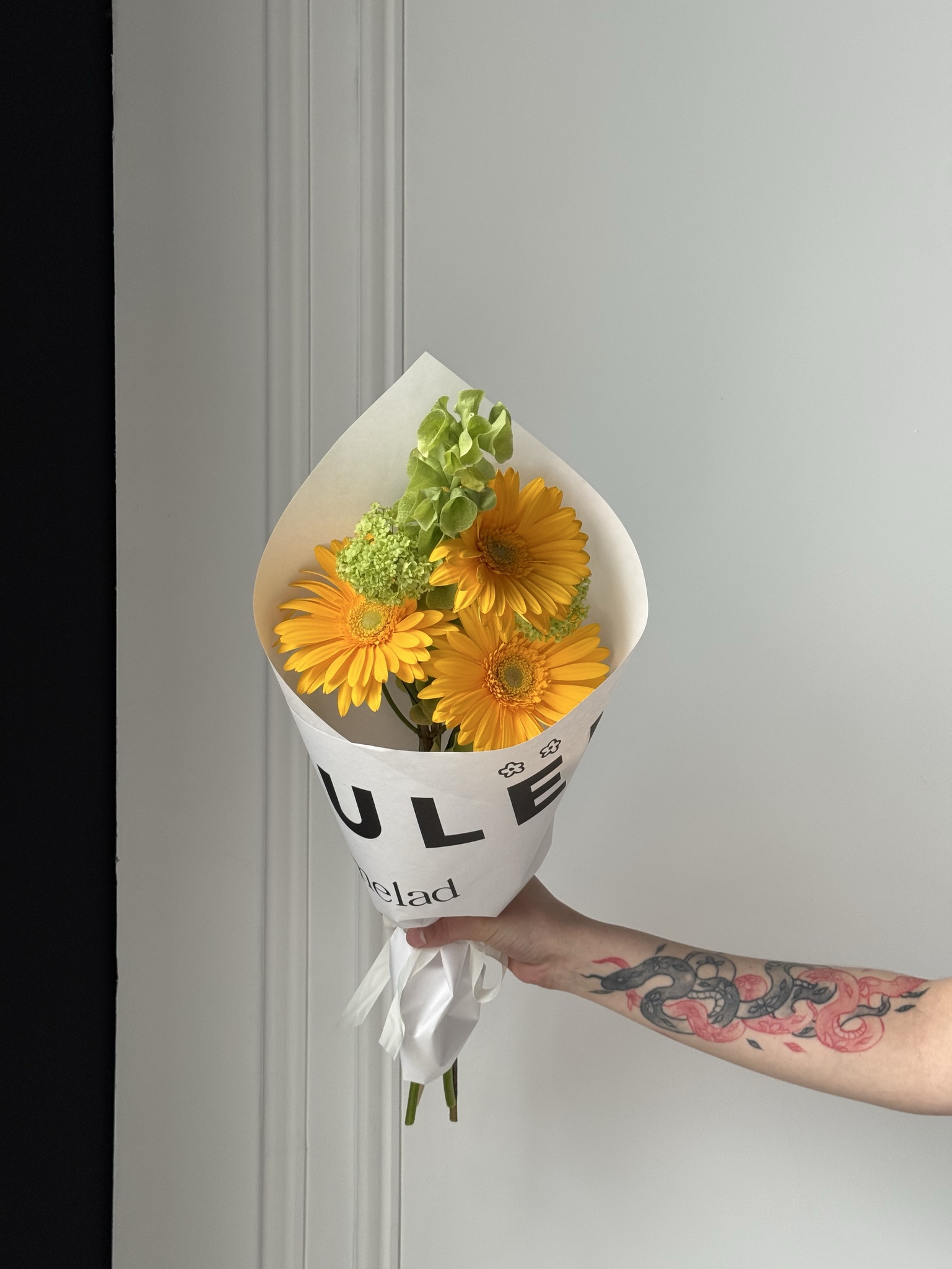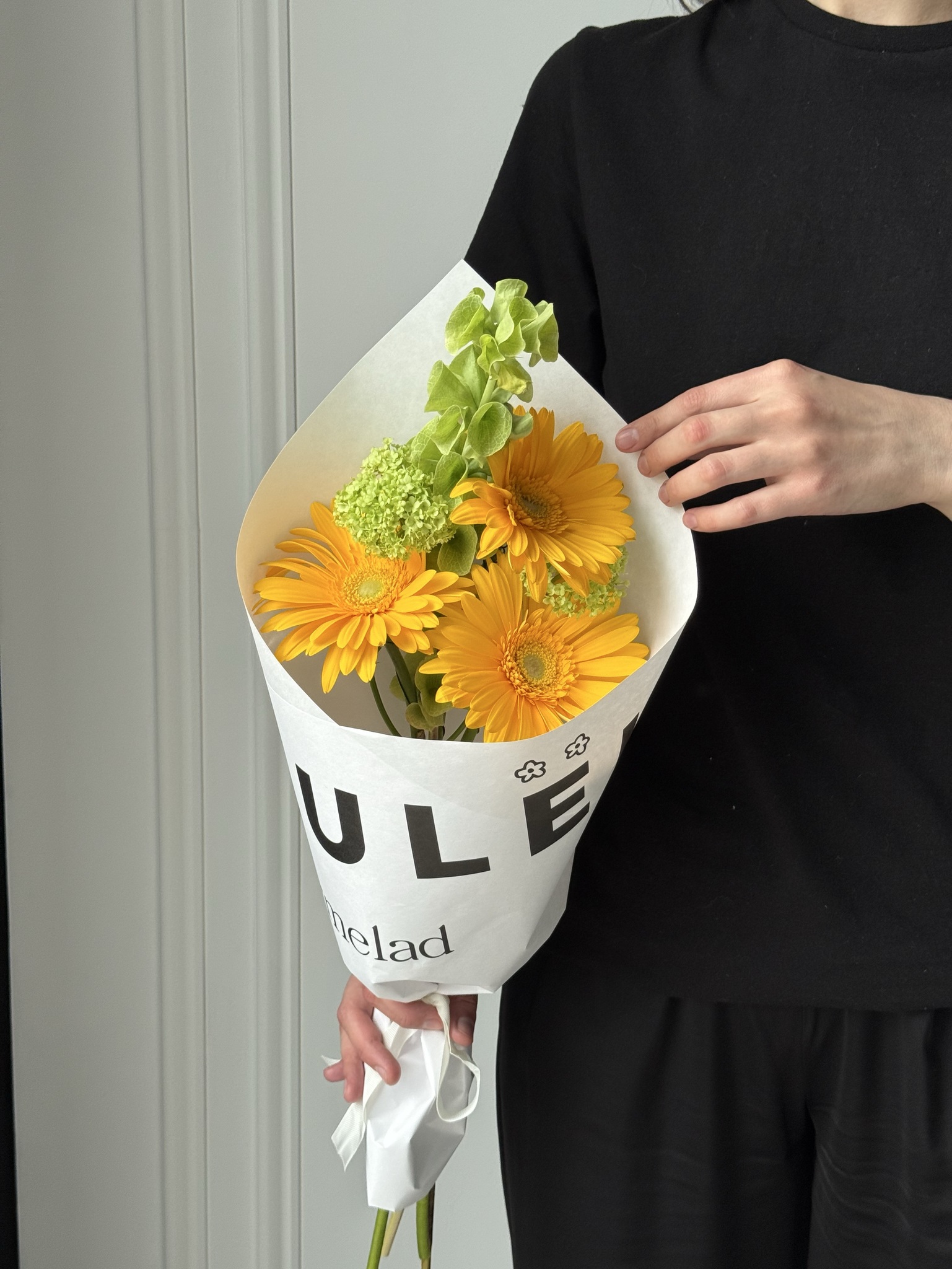 Кулек сборный из герберы, молюцеллы и вибурнума