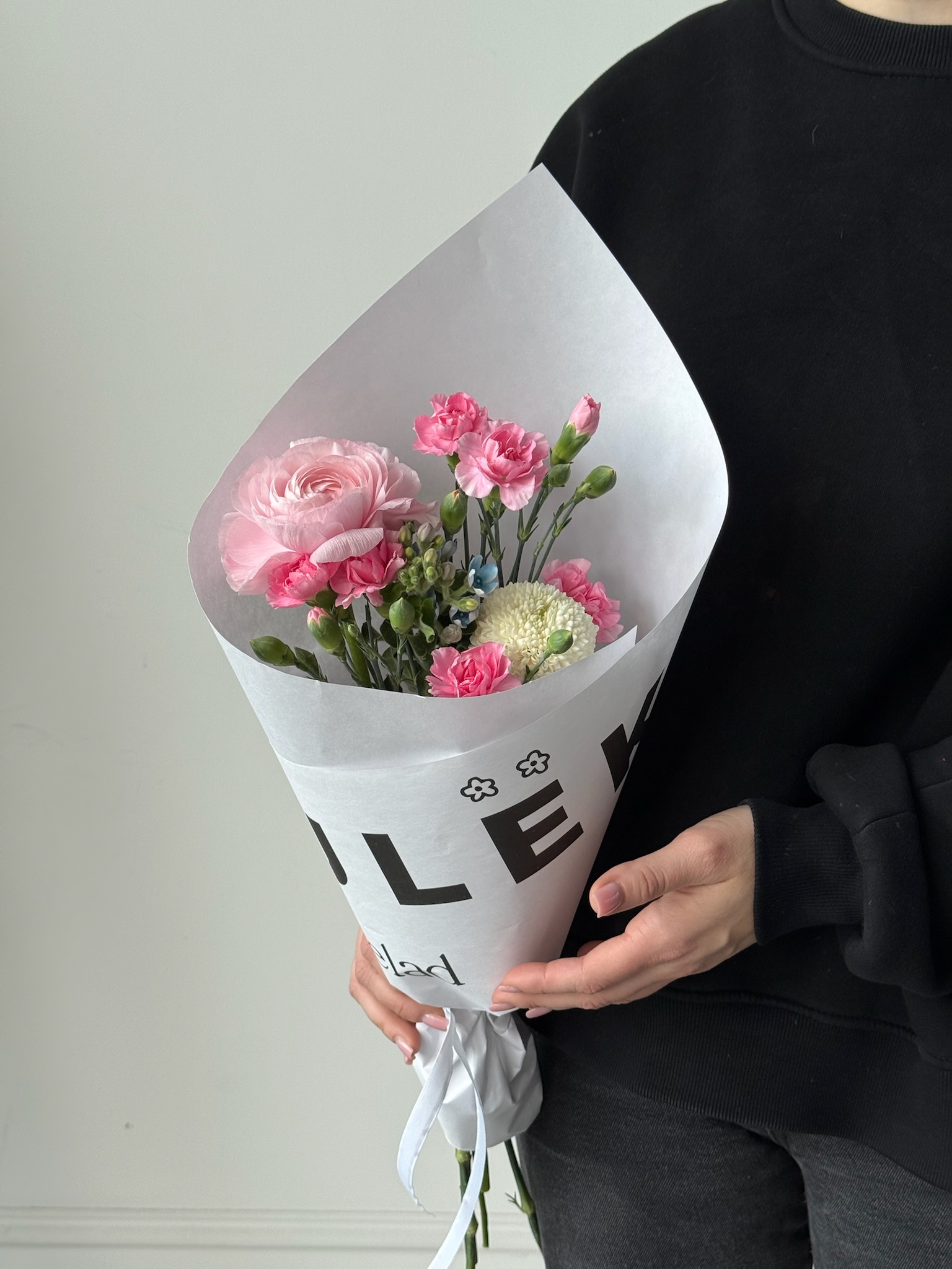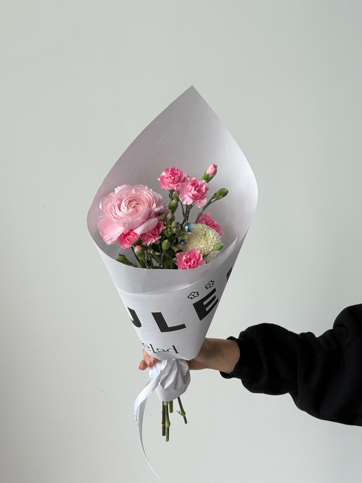 Кулек сборный из кустовых диантусов, ранункулюса, оксипеталума и хризантемы
