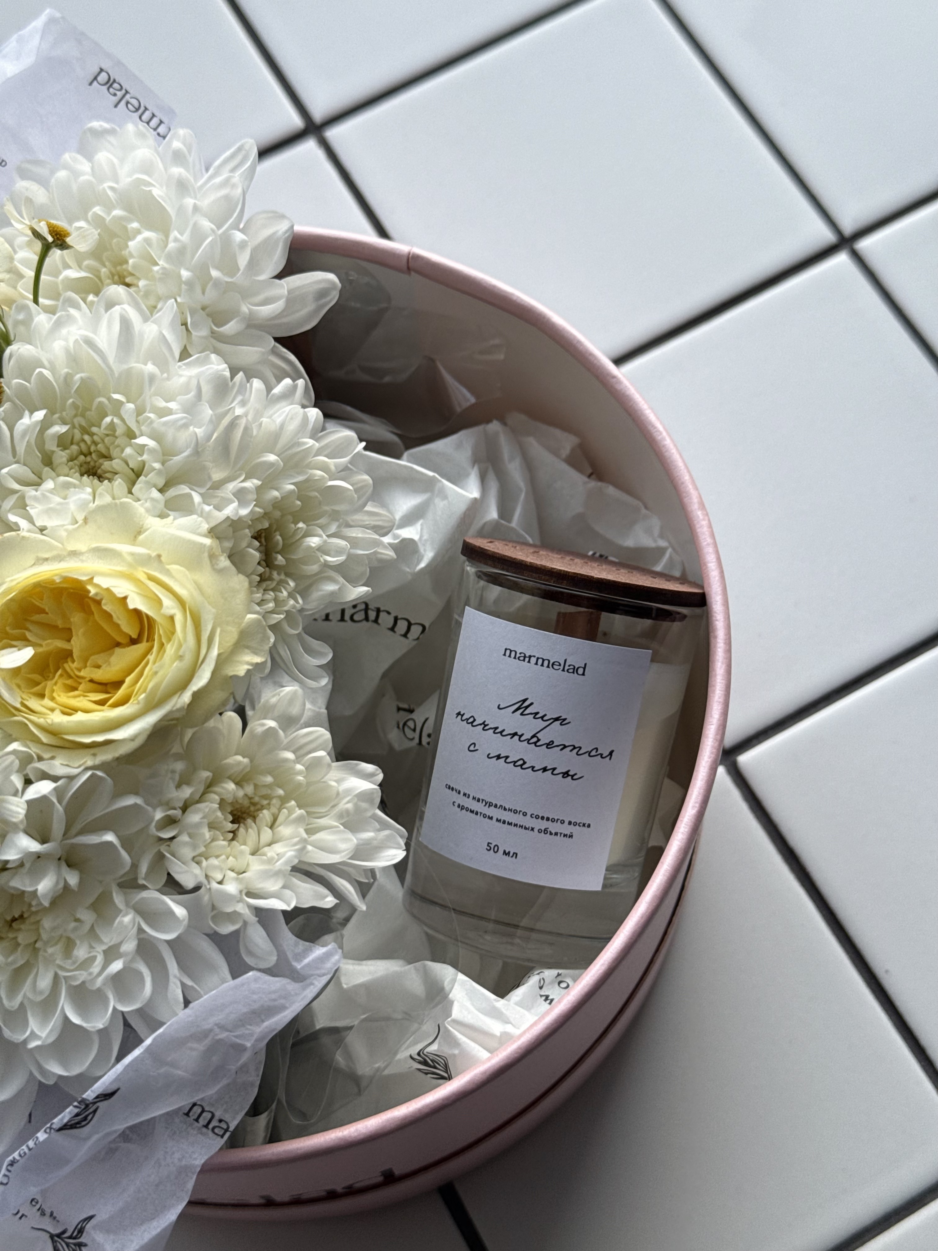Цветочная композиция в коробке+свеча 50 мл