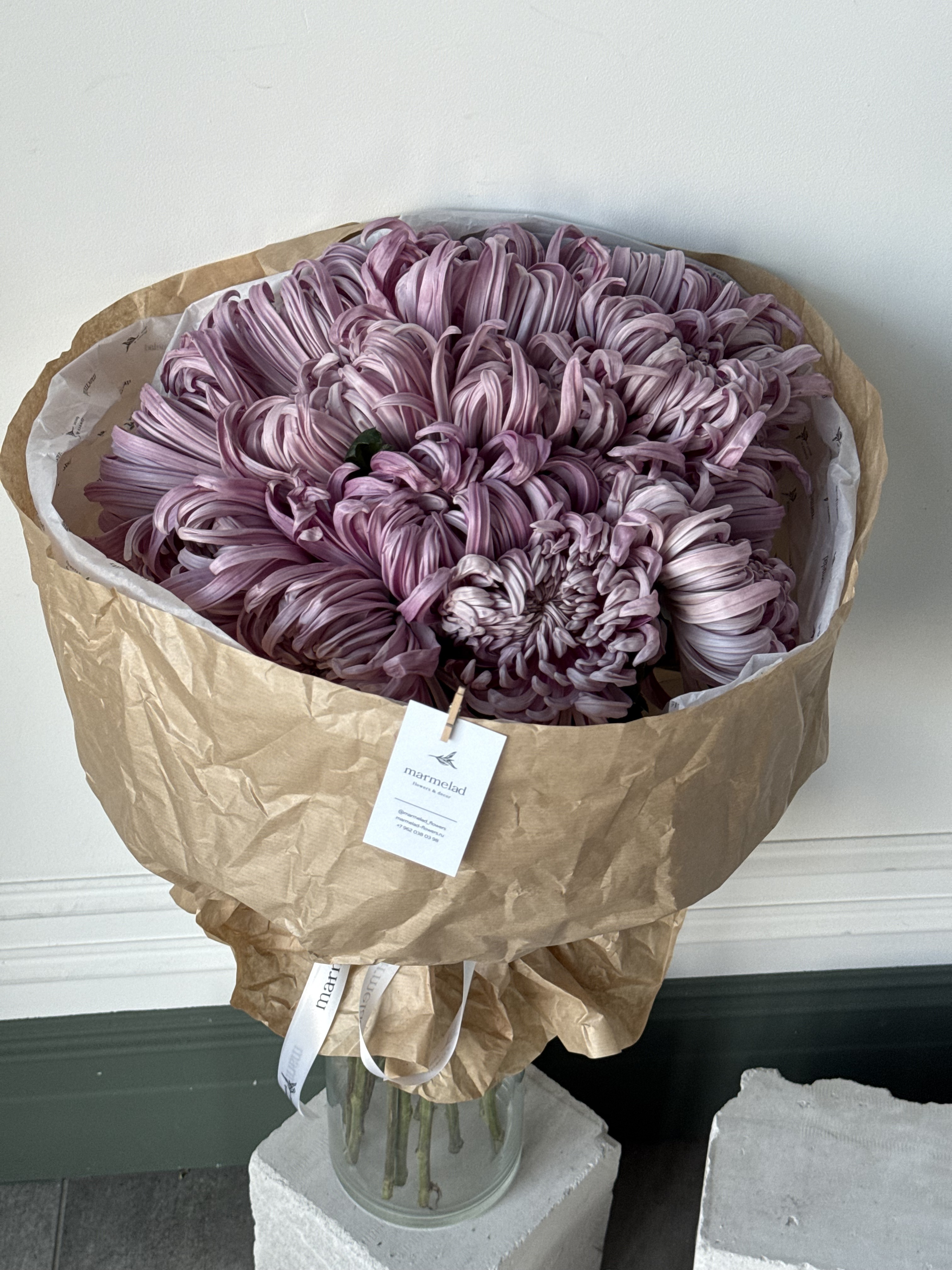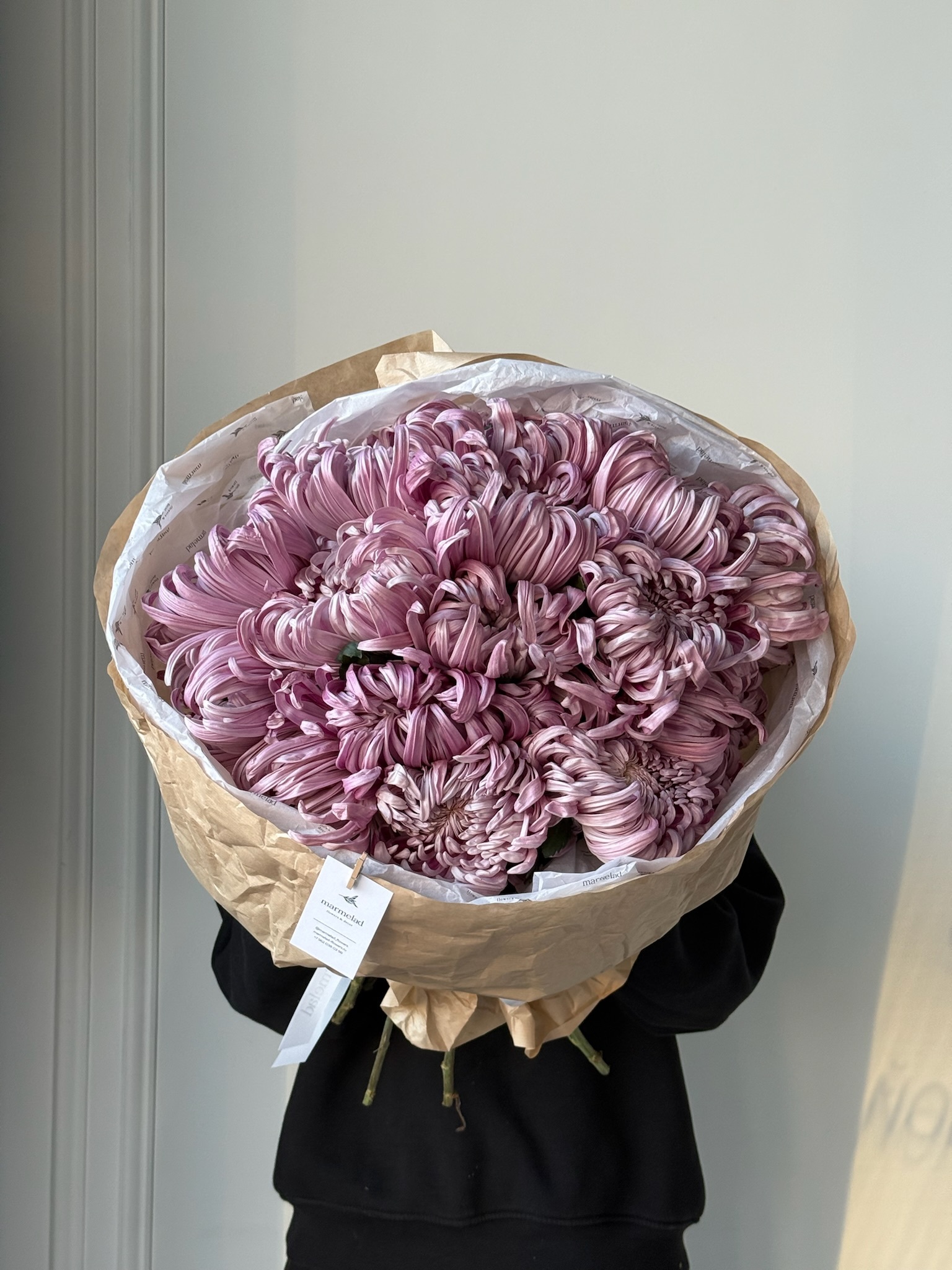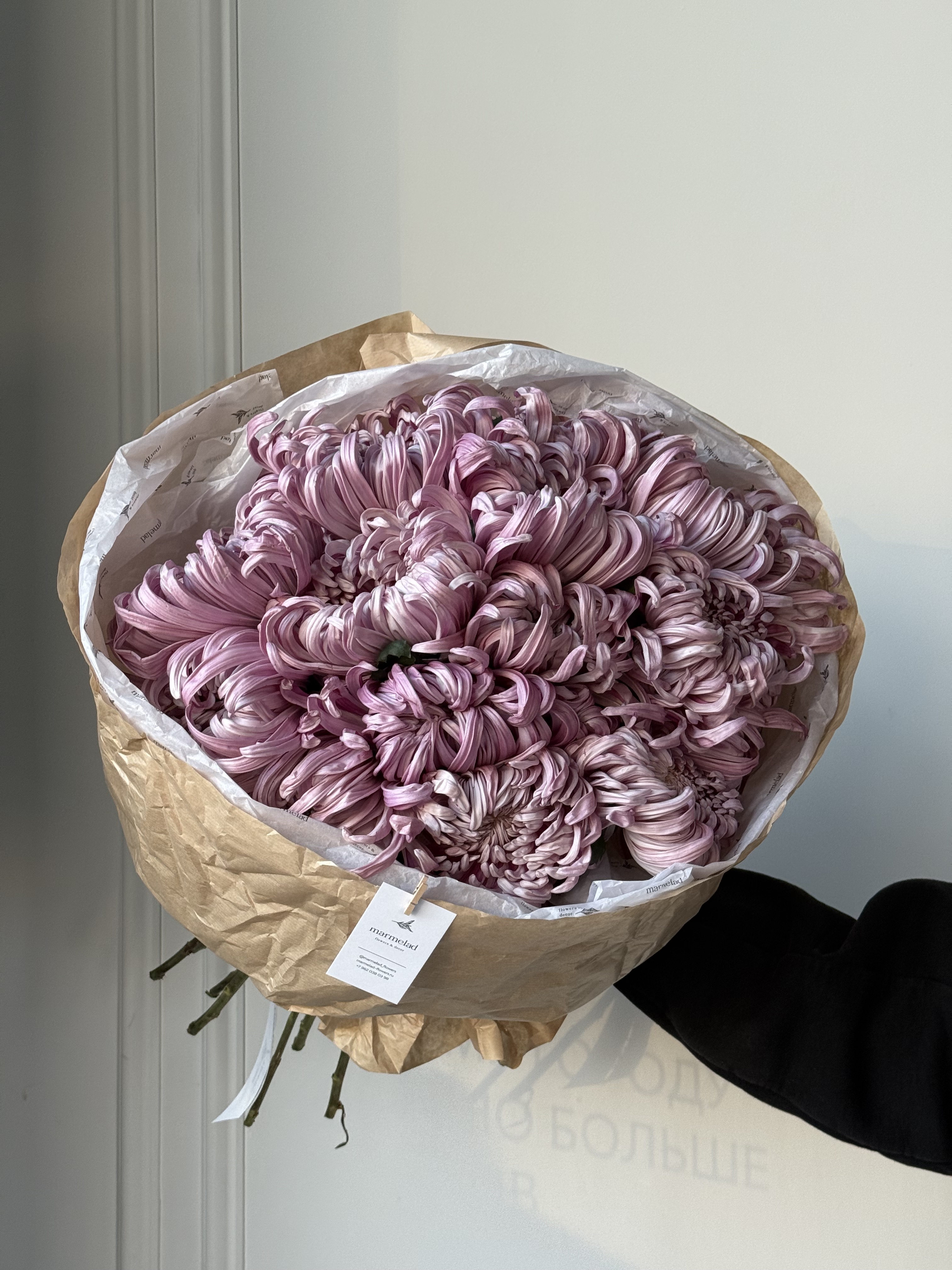 Моно букет из одноголовой кудрявой хризантемы в розовом оттенке